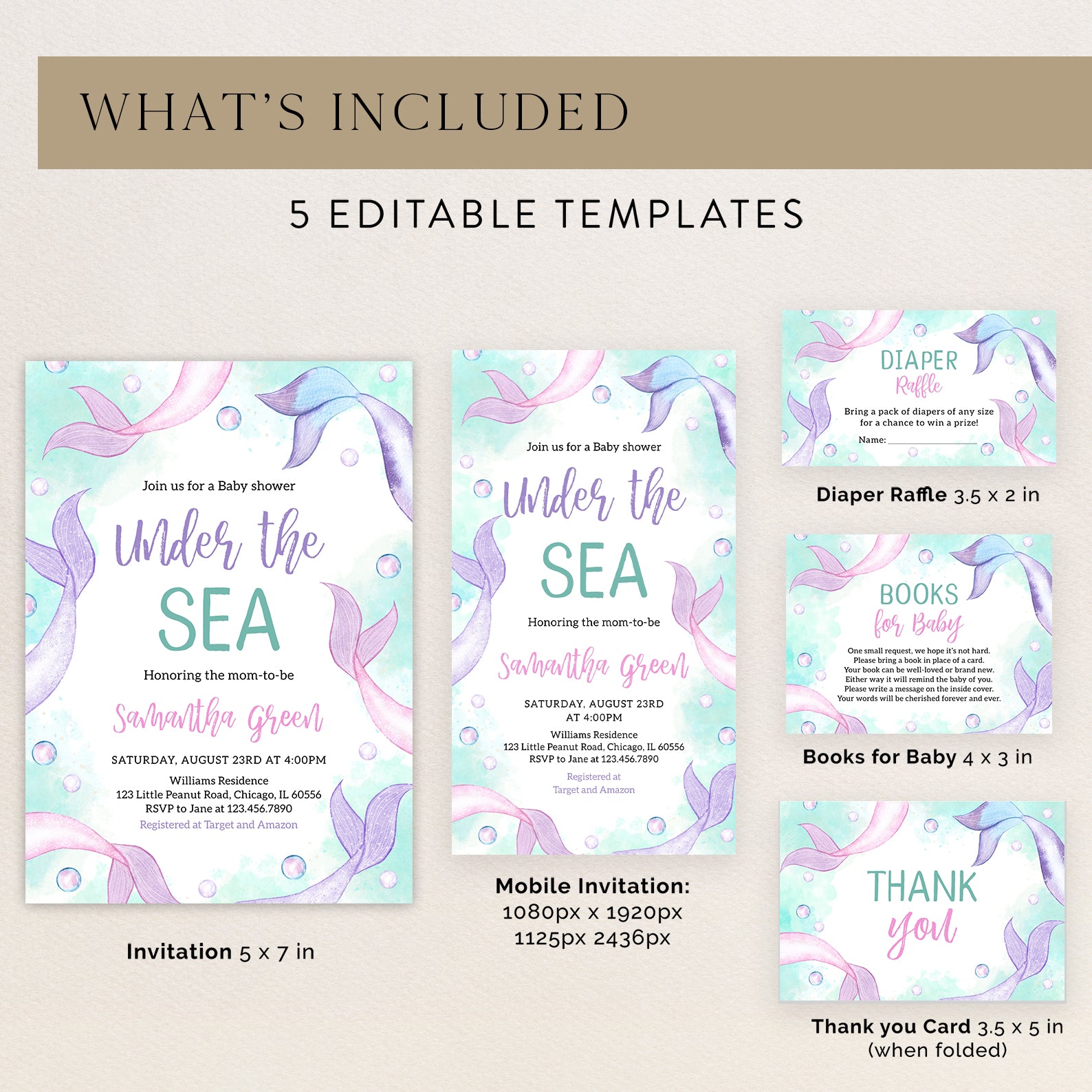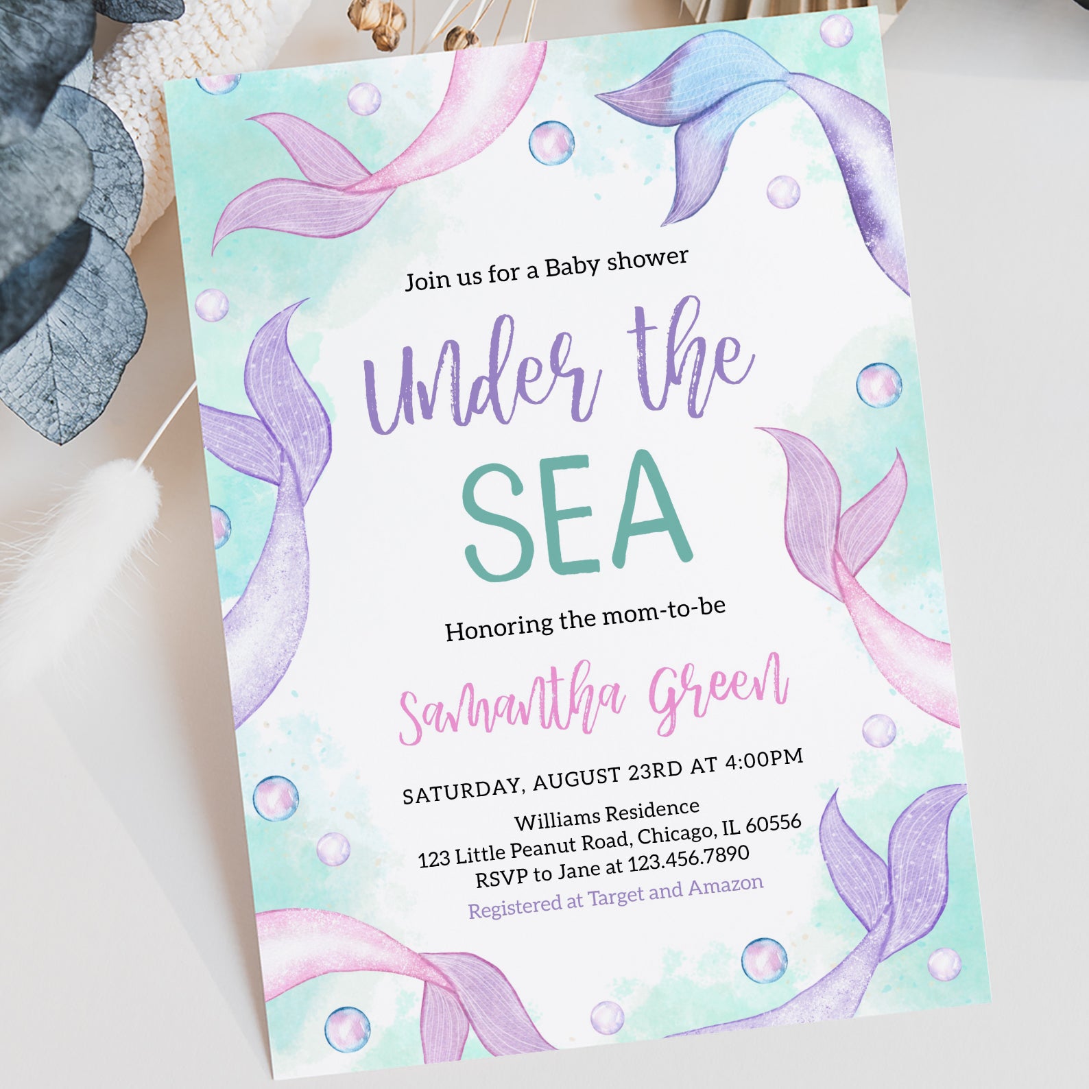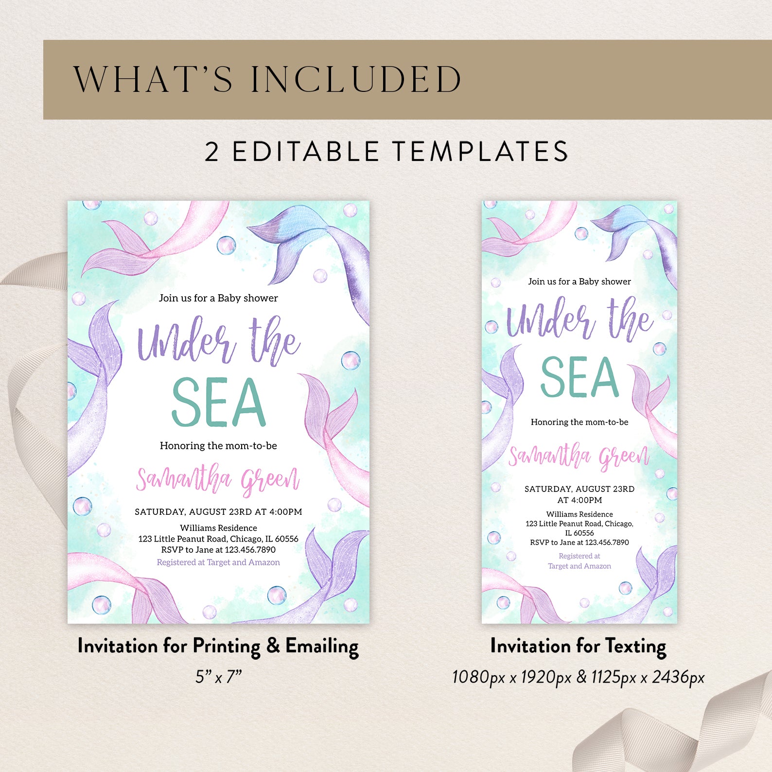 - Purchase this Under the Sea Baby Shower Invite Bundle: Pink & Purple Mermaid Tails template