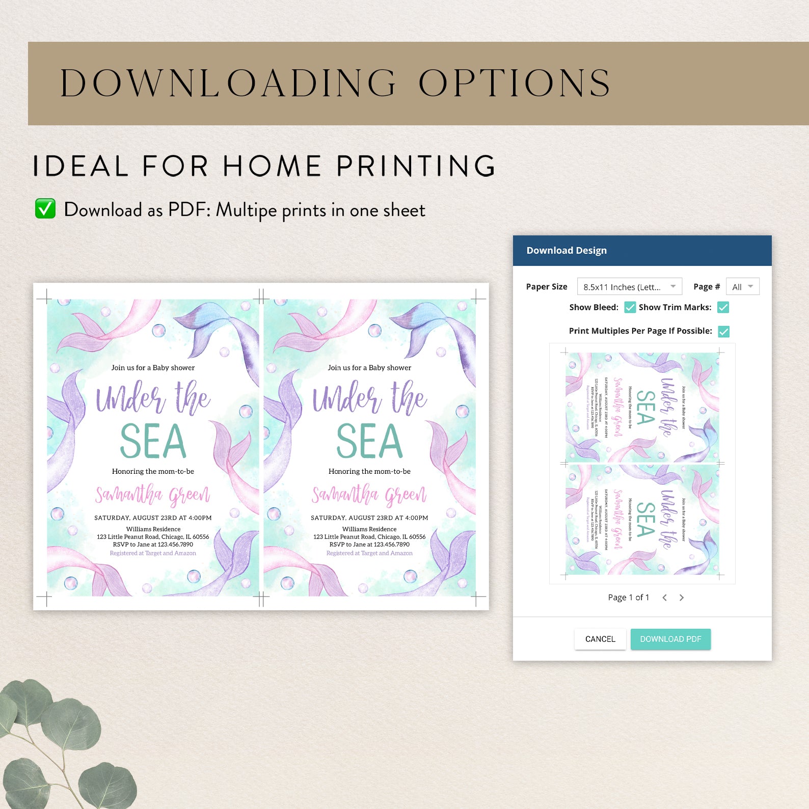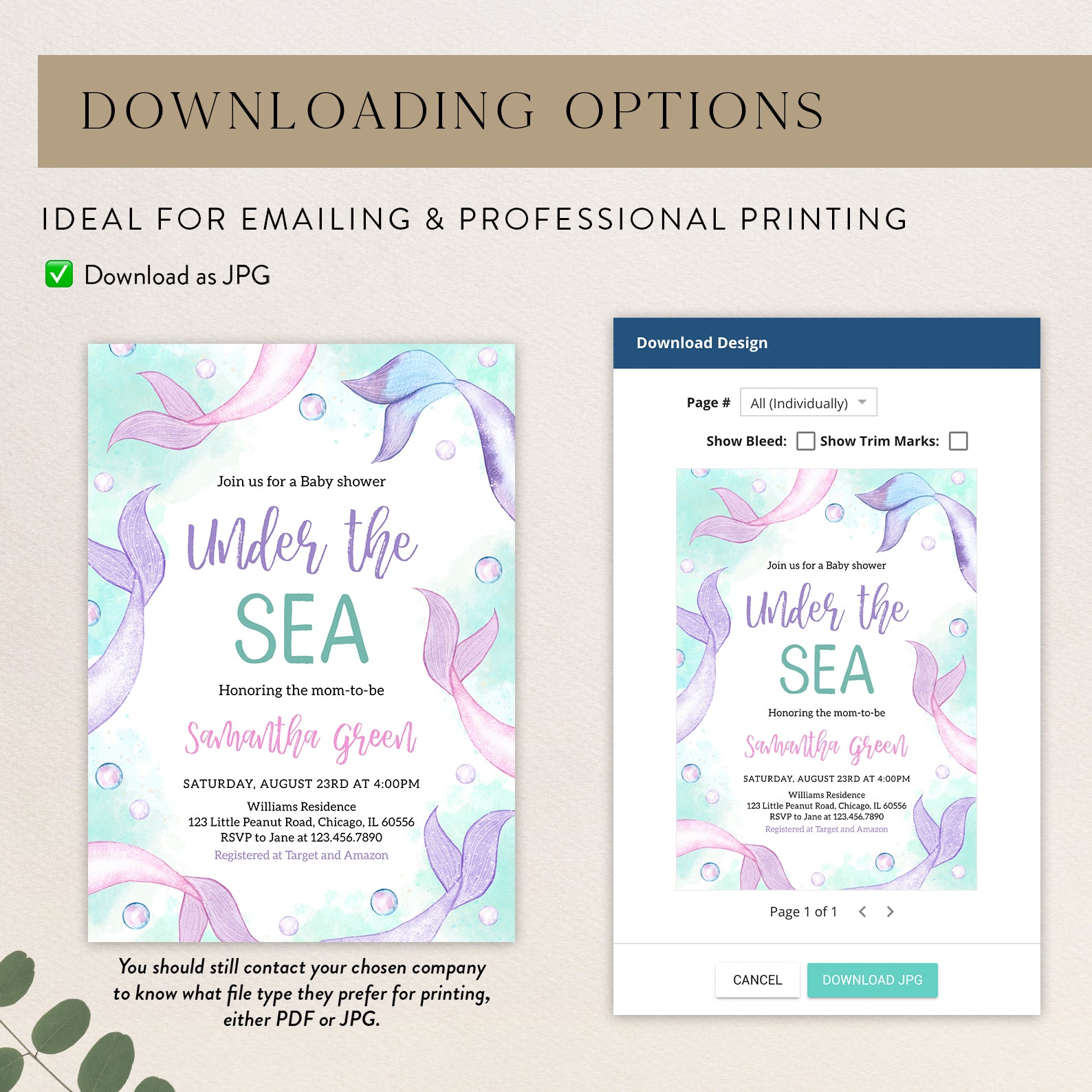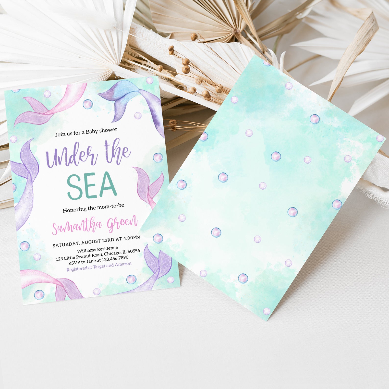 - Purchase this Under the Sea Baby Shower Invite Bundle: Pink & Purple Mermaid Tails template