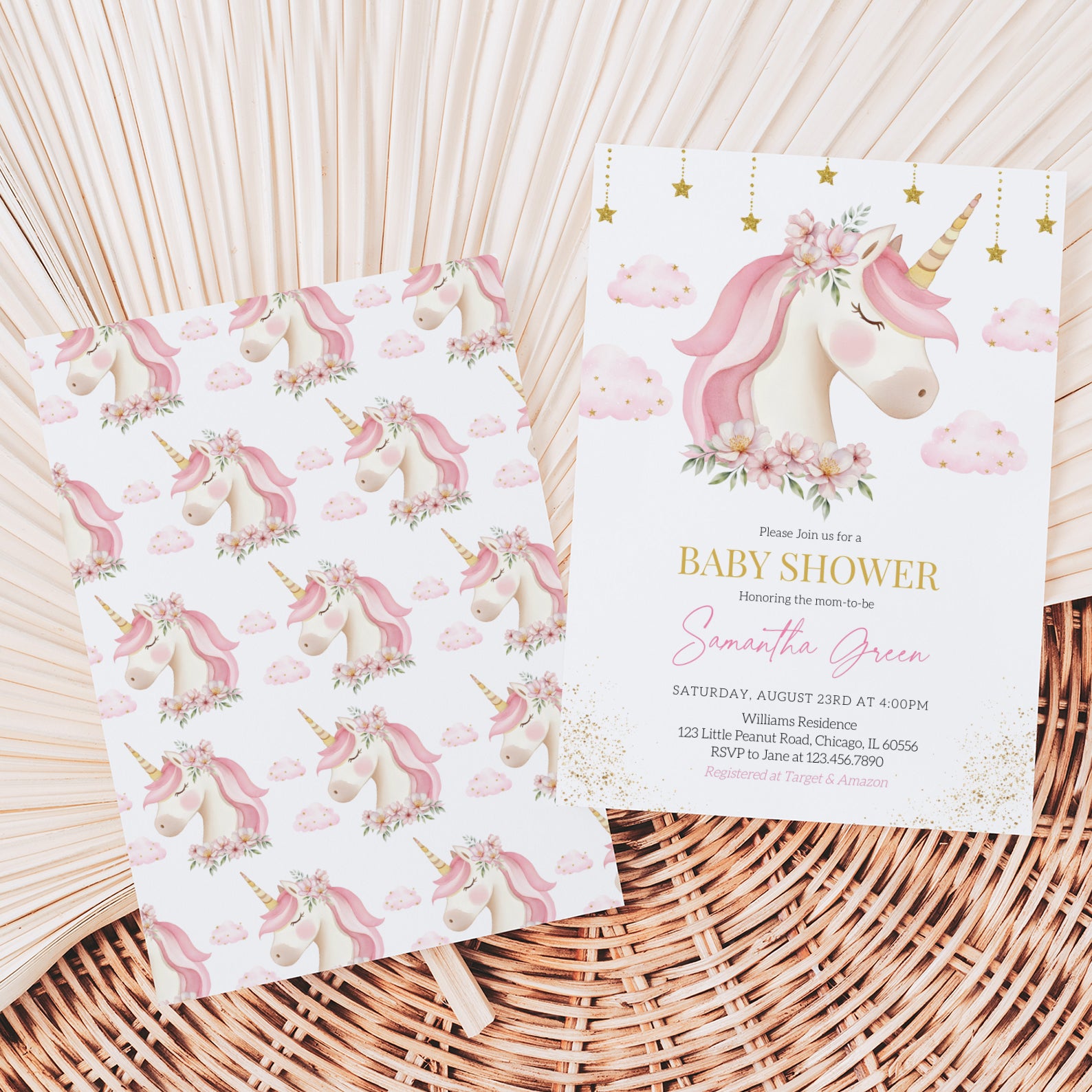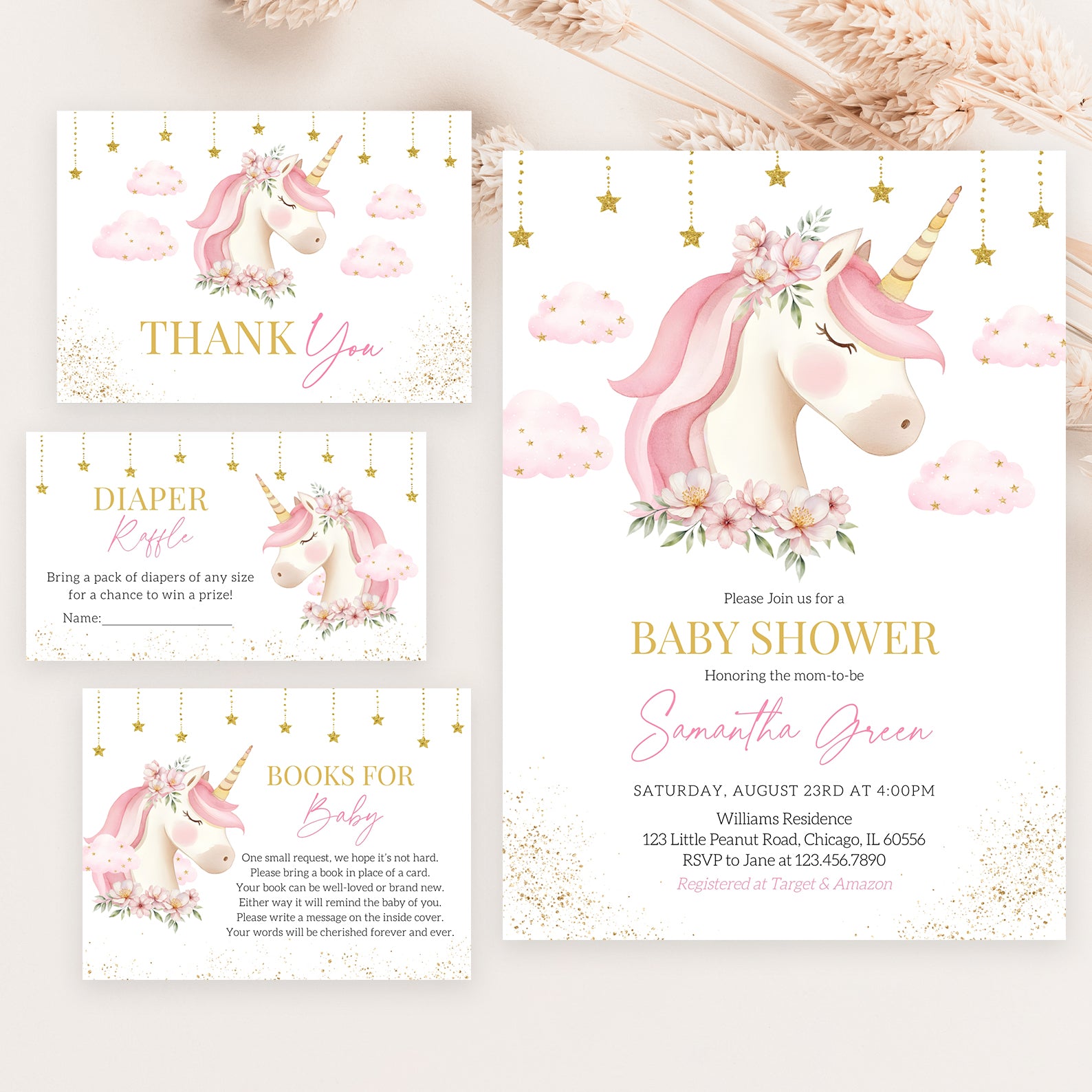 Unicorn Baby Shower Invitation Bundle with Gold Stars & Pink Clouds