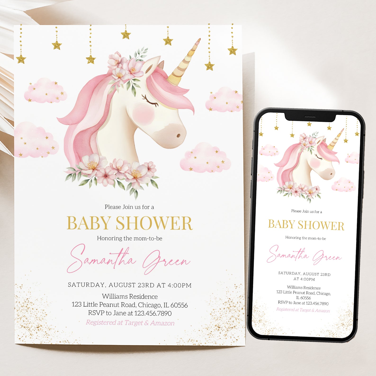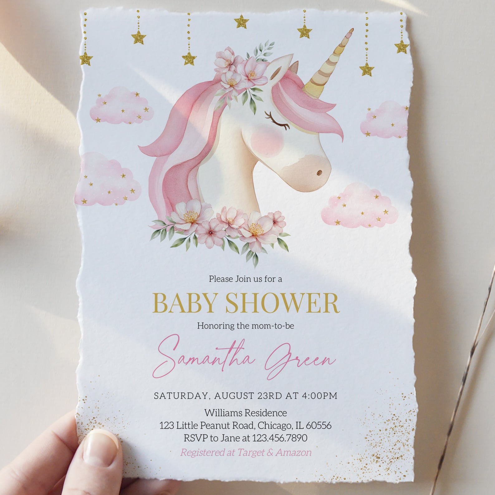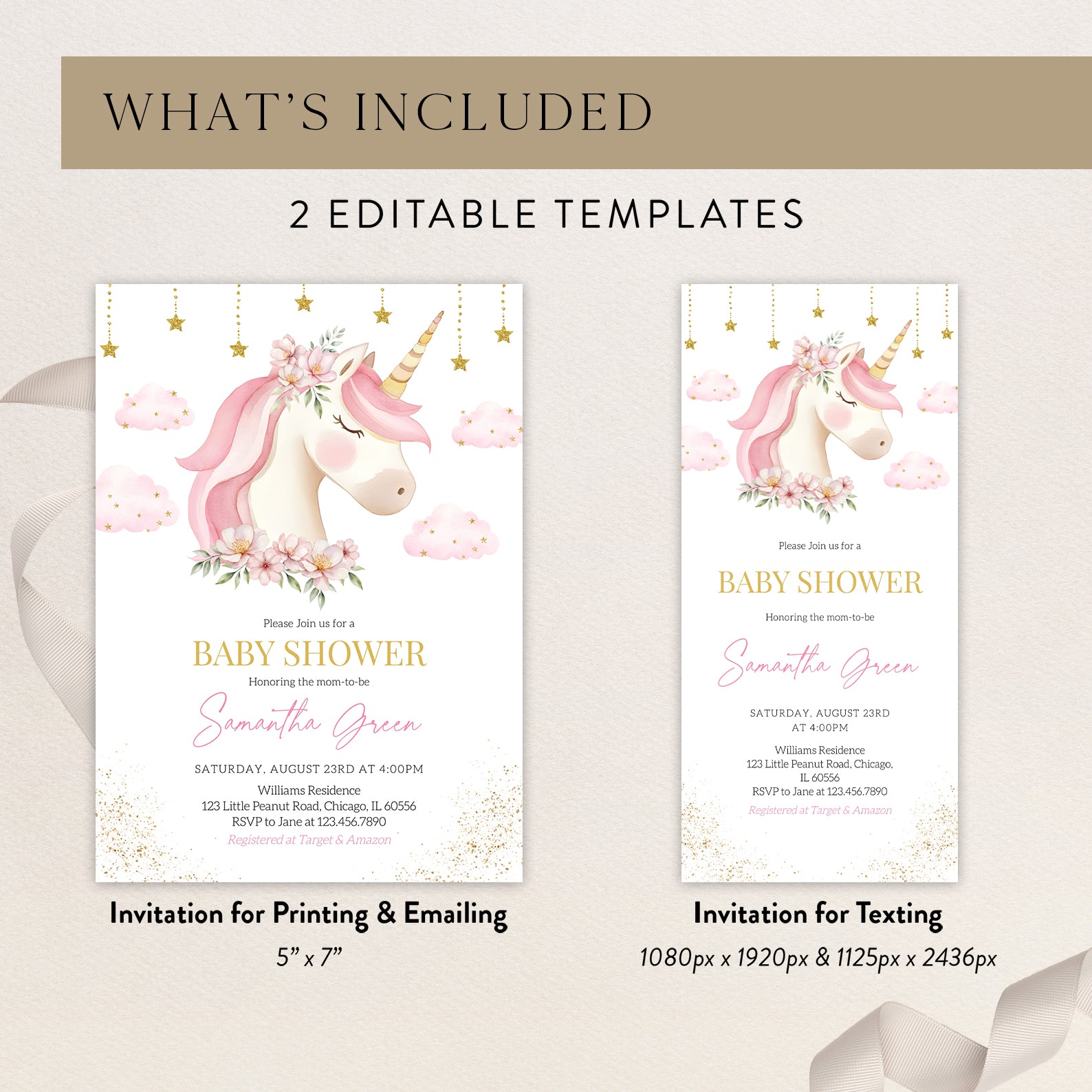 - Purchase this Unicorn Baby Shower Invitation Bundle with Gold Stars & Pink Clouds template
