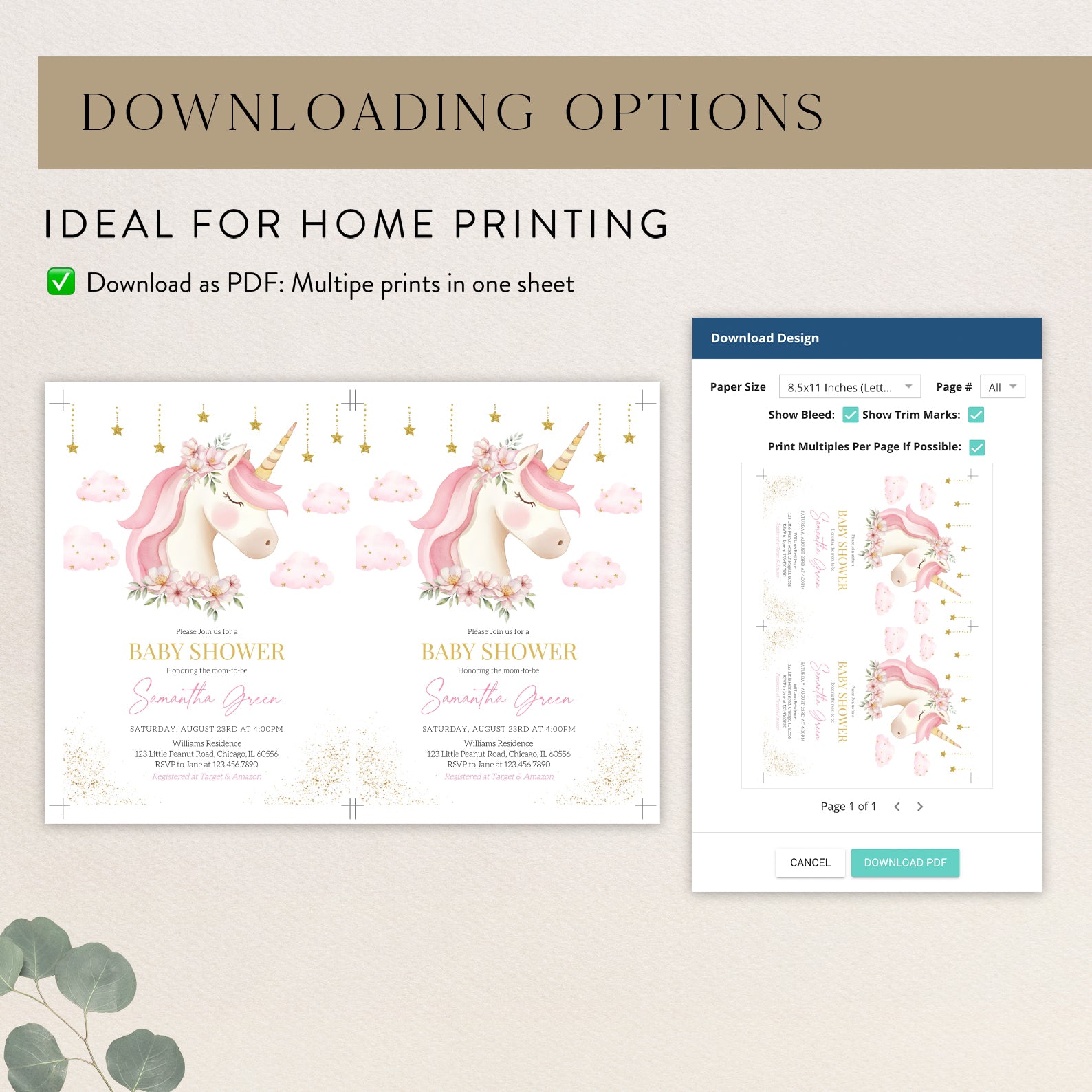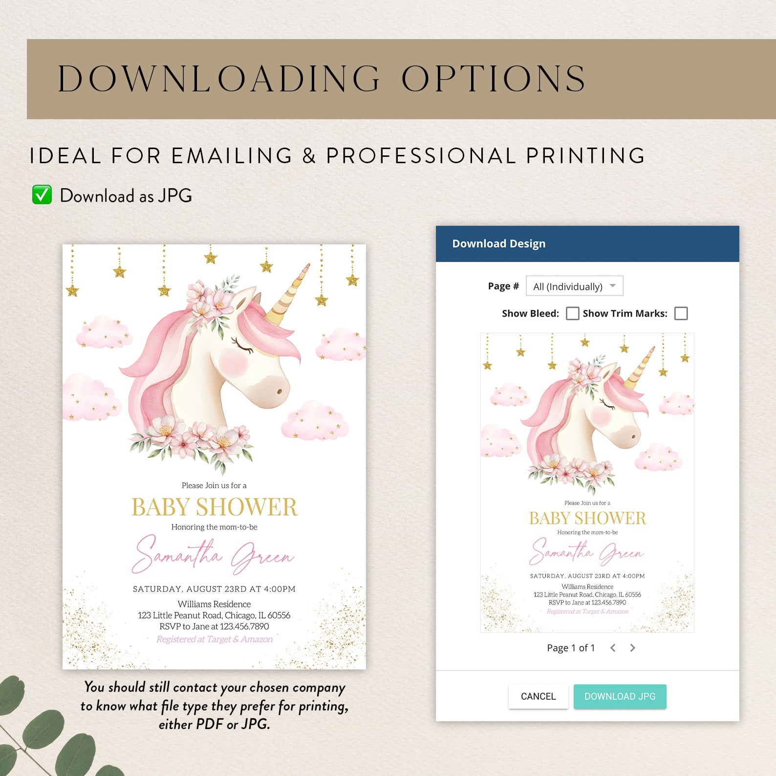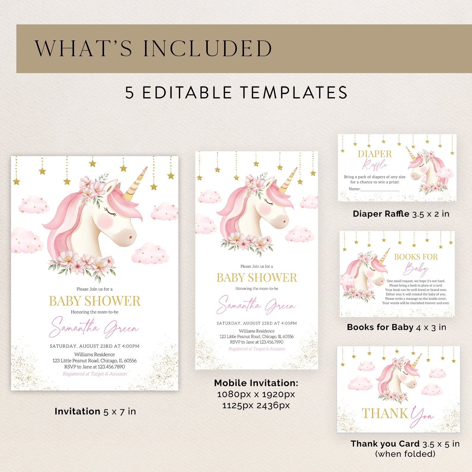 - Purchase this Unicorn Baby Shower Invitation Bundle with Gold Stars & Pink Clouds template