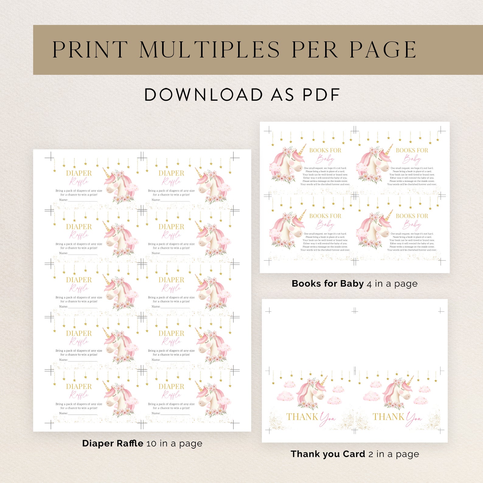Celebrate your little one with this magical baby shower invitation bundle! Featuring a dreamy sleeping unicorn, gold falling stars, and soft pink clouds, this set brings a whimsical touch to your celebration. The bundle includes an invitation, mobile invite, diaper raffle, books for baby, and thank you card—everything you need for a sweet and stylish event.