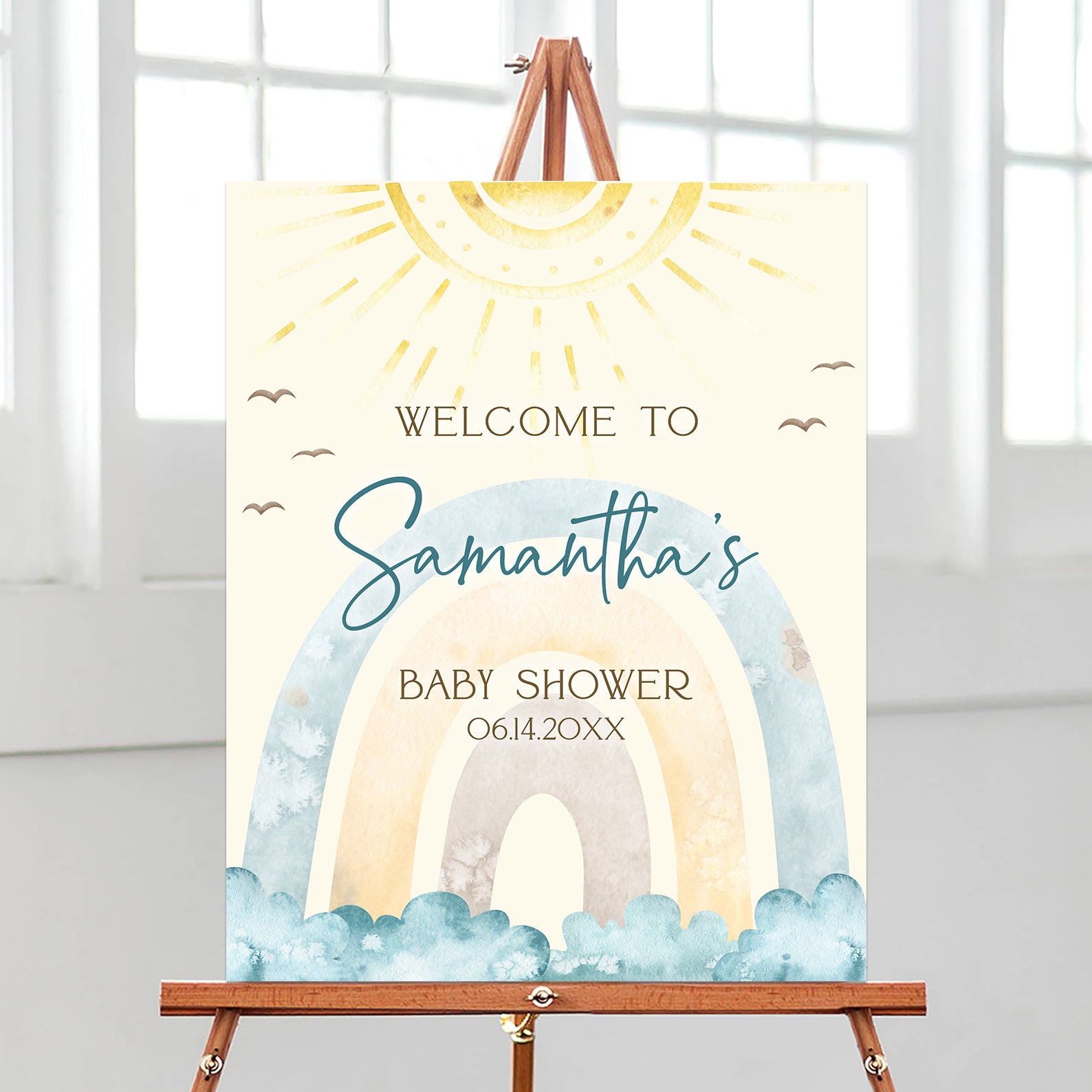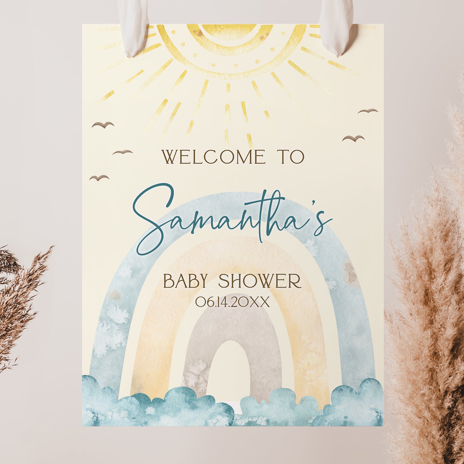 Set the tone for a sunny celebration with this “Here Comes the Sun” baby shower welcome sign! Designed with soft yellow pastels, watercolor sun rays, flying birds, and a blue boho rainbow with clouds, it's the perfect cheerful touch to greet your guests.