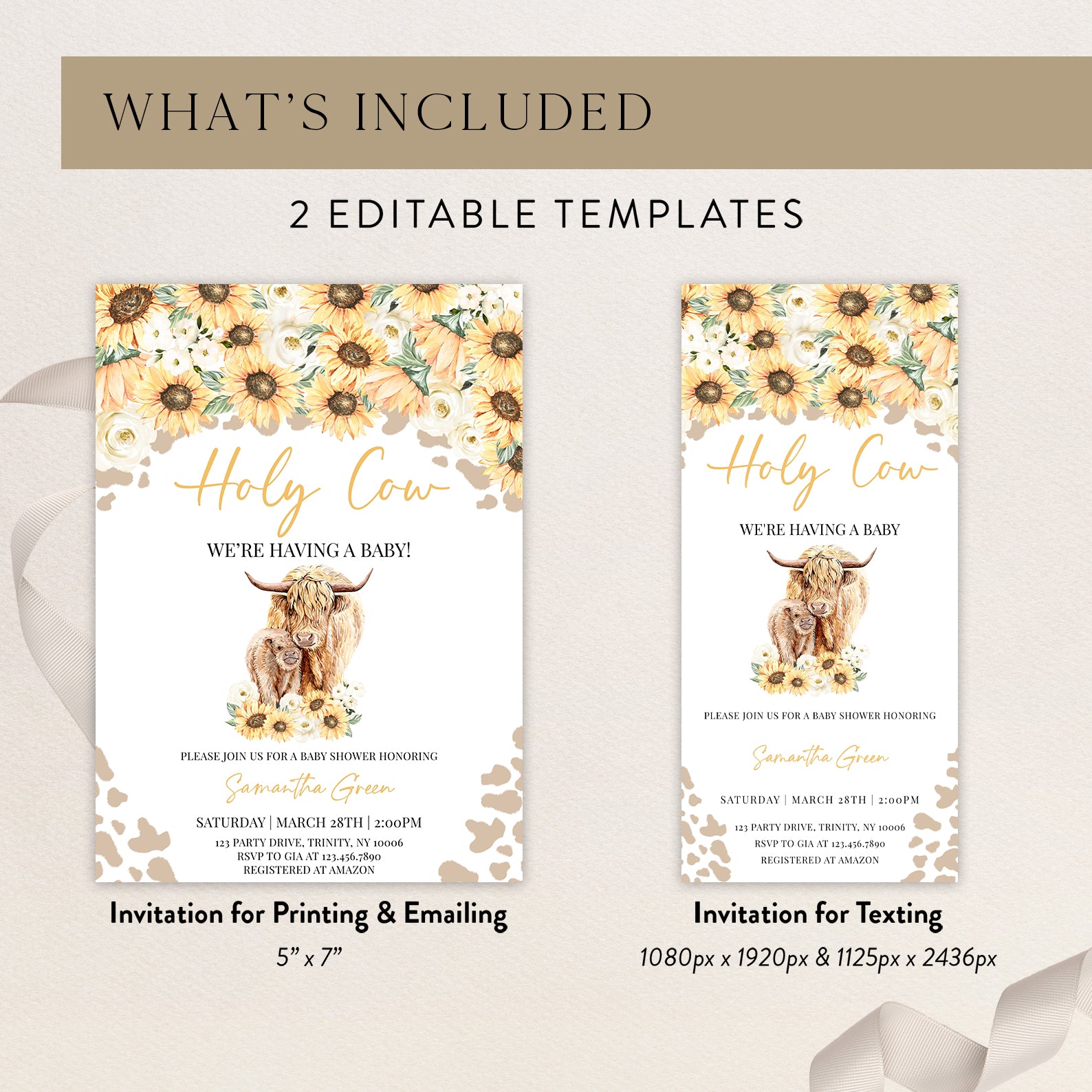Celebrate your little one's upcoming arrival with our charming "Holy Cow, We're Having a Baby" digital invitation! This delightful design features vibrant sunflowers at the top, complemented by playful brown cow prints in the corners, creating a warm and inviting atmosphere. At the heart of the invitation, a mother and baby highland cow, adorned with sunflowers, adds a touch of whimsy and love. Perfect for a baby shower, this invitation sets the tone for a joyful celebration, making it easy to share your excitement with family and friends. Download, customize, and send out your invites in just minutes. Let the festivities begin!