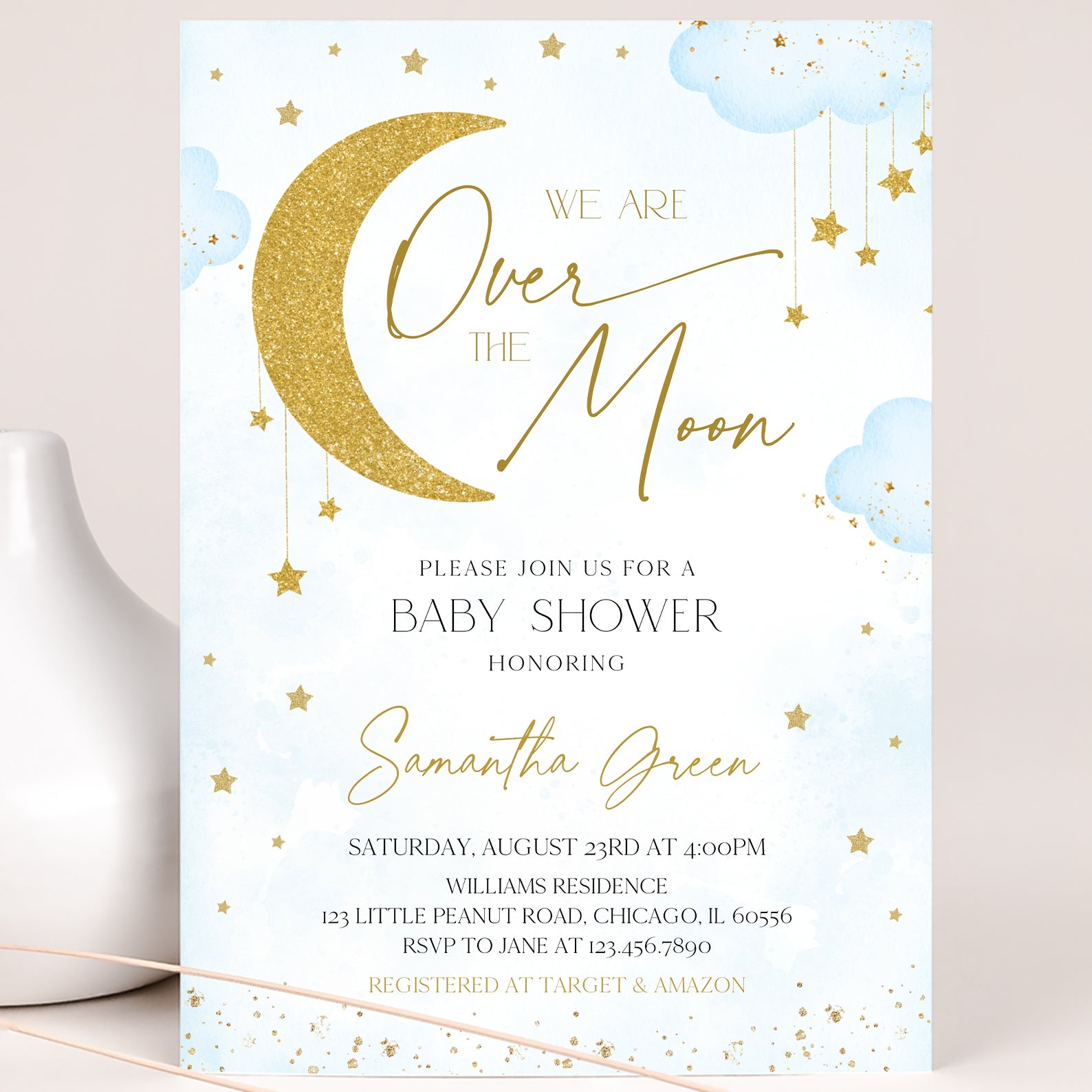 - Purchase this Celestial Over the Moon Baby Shower Blue Digital Invite template