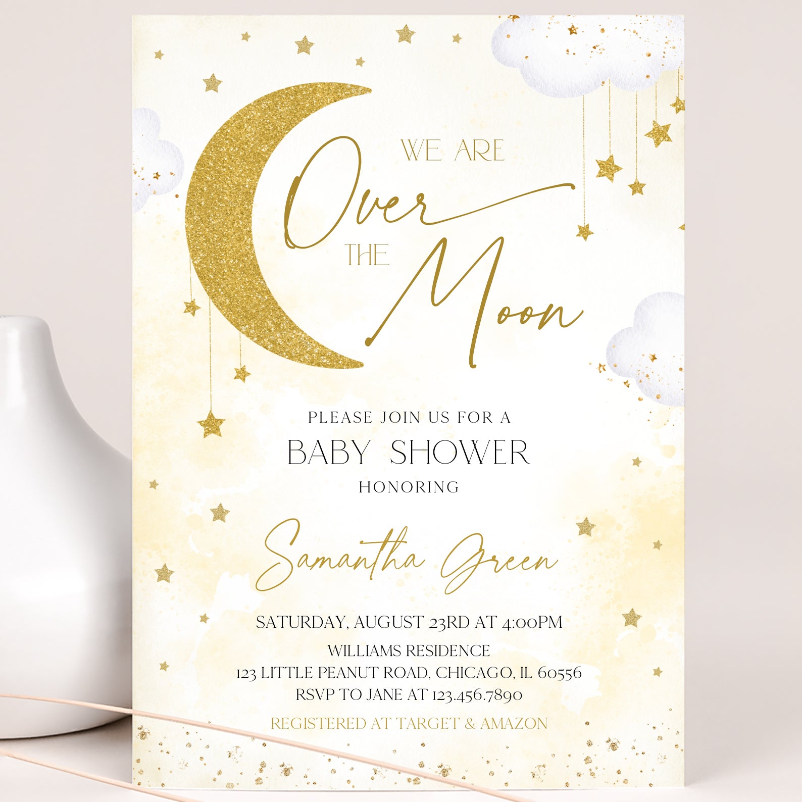 - Purchase this Celestial Over the Moon Baby Shower Gold Digital Invite template