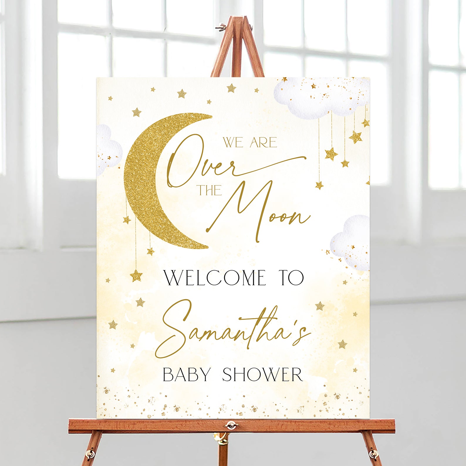 - Purchase this Celestial Over the Moon Baby Shower Gold Digital Welcome Sign template