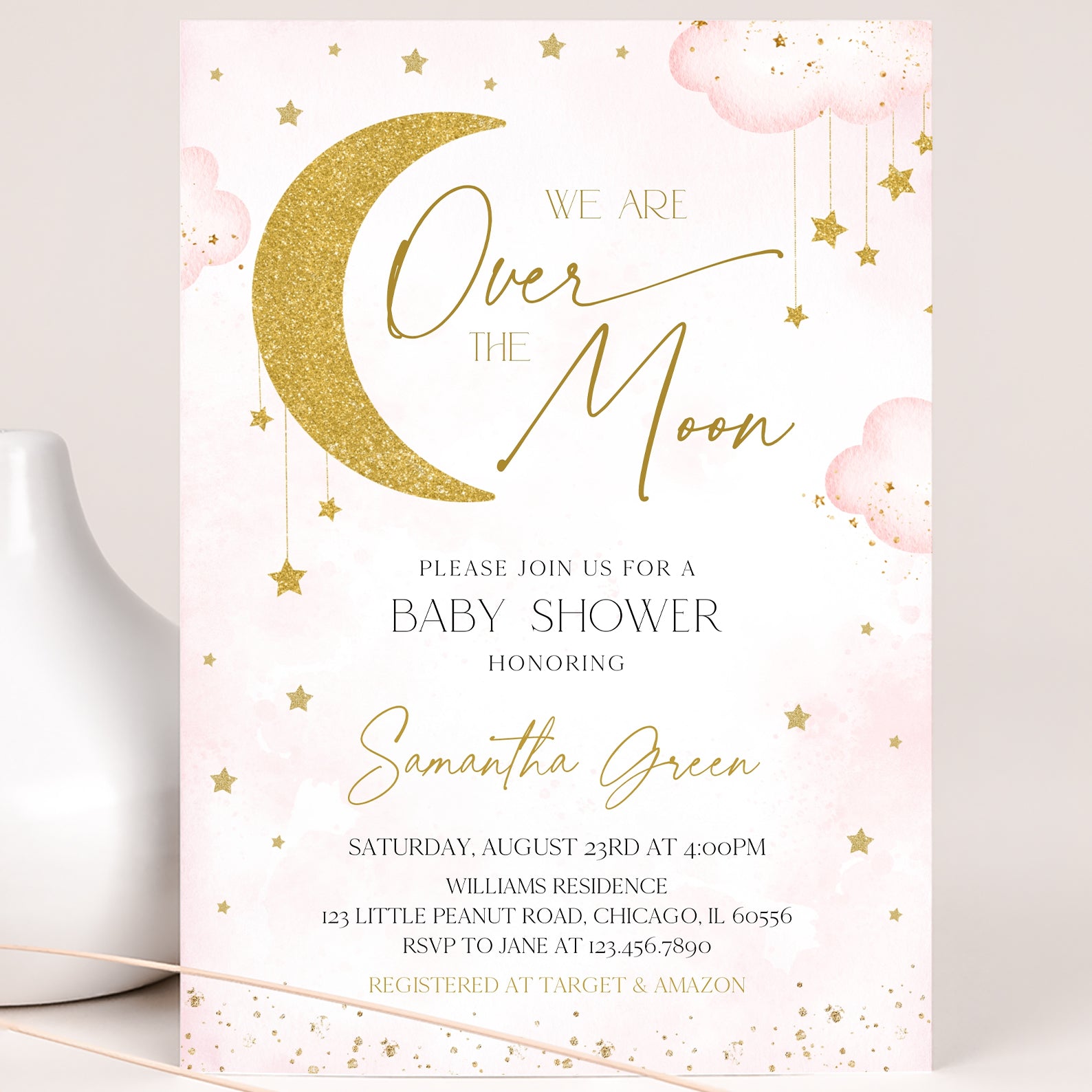- Purchase this Celestial Over the Moon Baby Shower Pink Digital Invite template