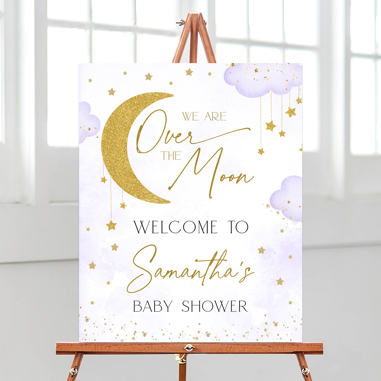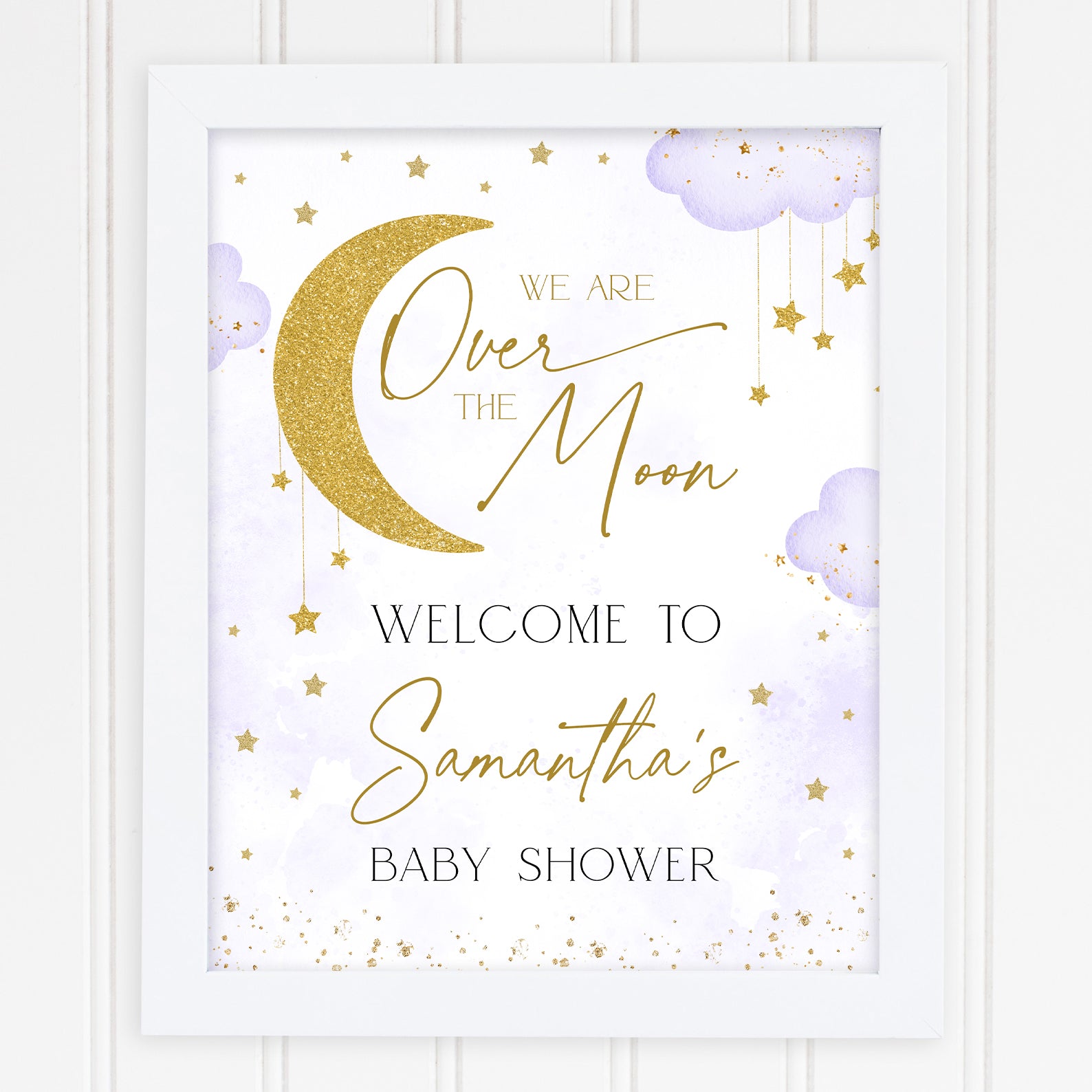 - Purchase this Celestial Over the Moon Baby Shower Purple Digital Welcome Sign template