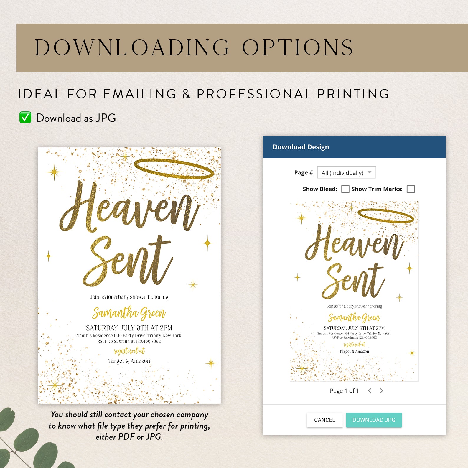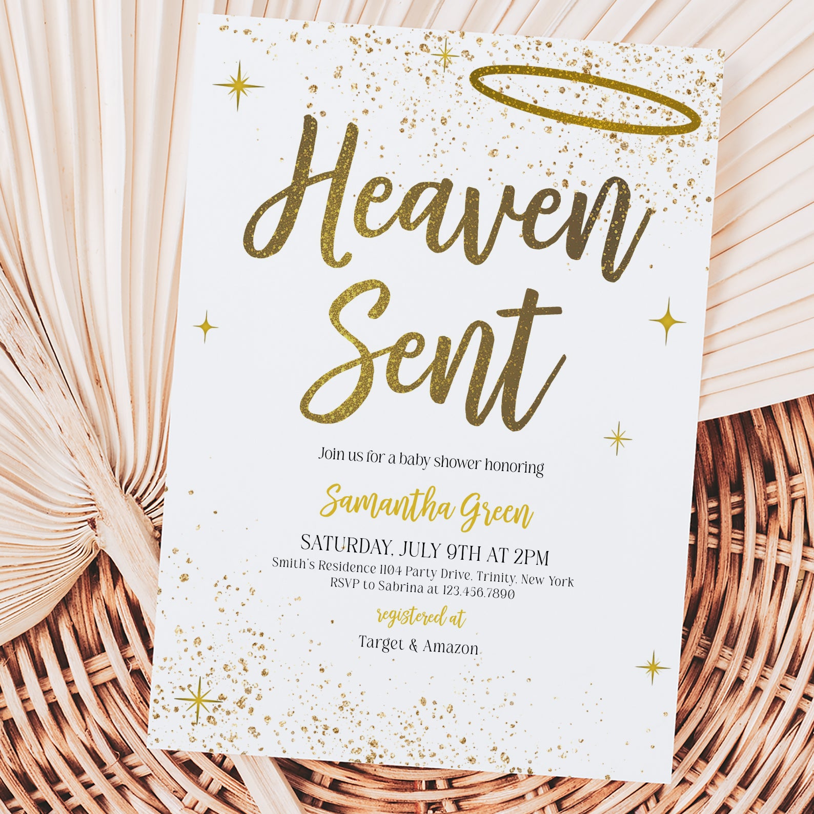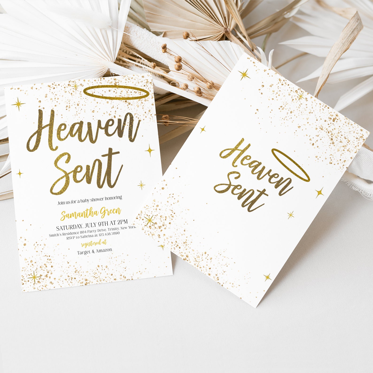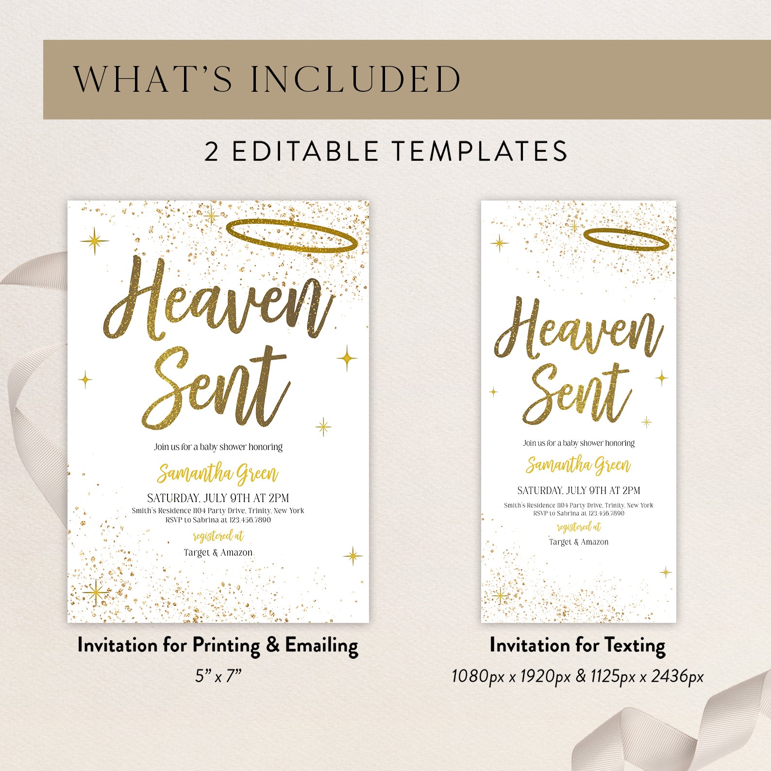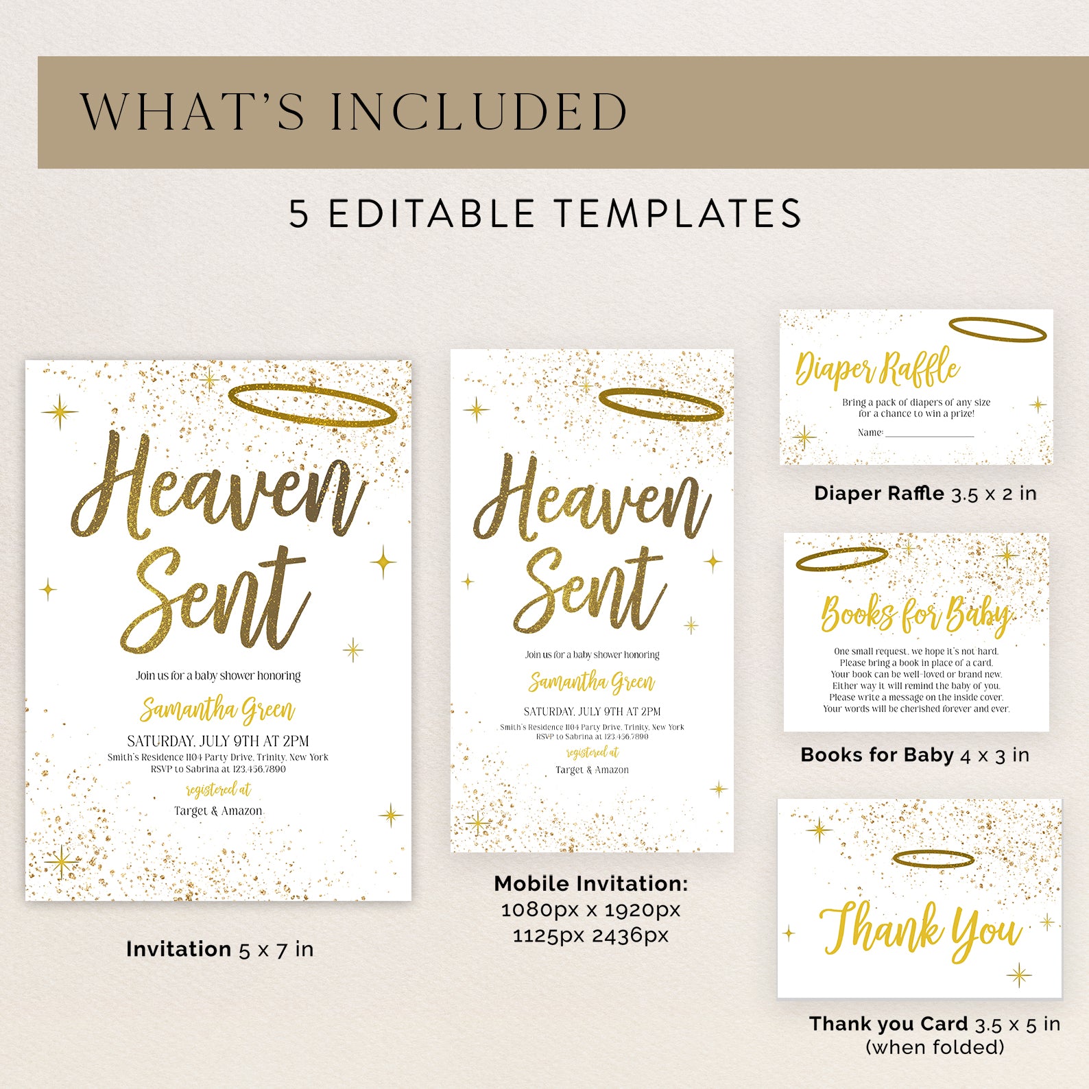 - Purchase this Heaven Sent Baby Shower Digital Invite Bundle: Gold Angel Theme template