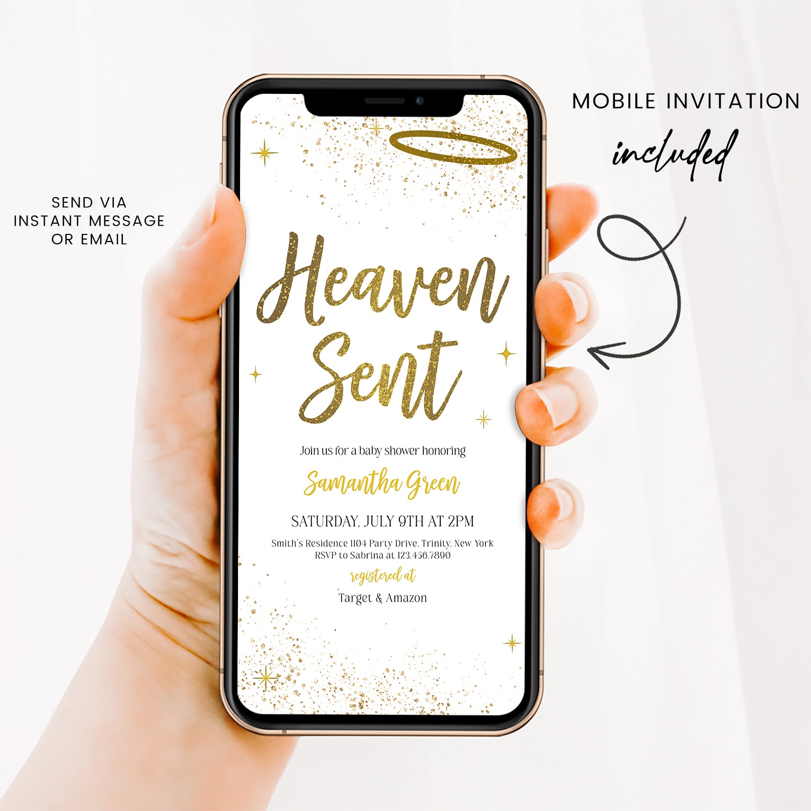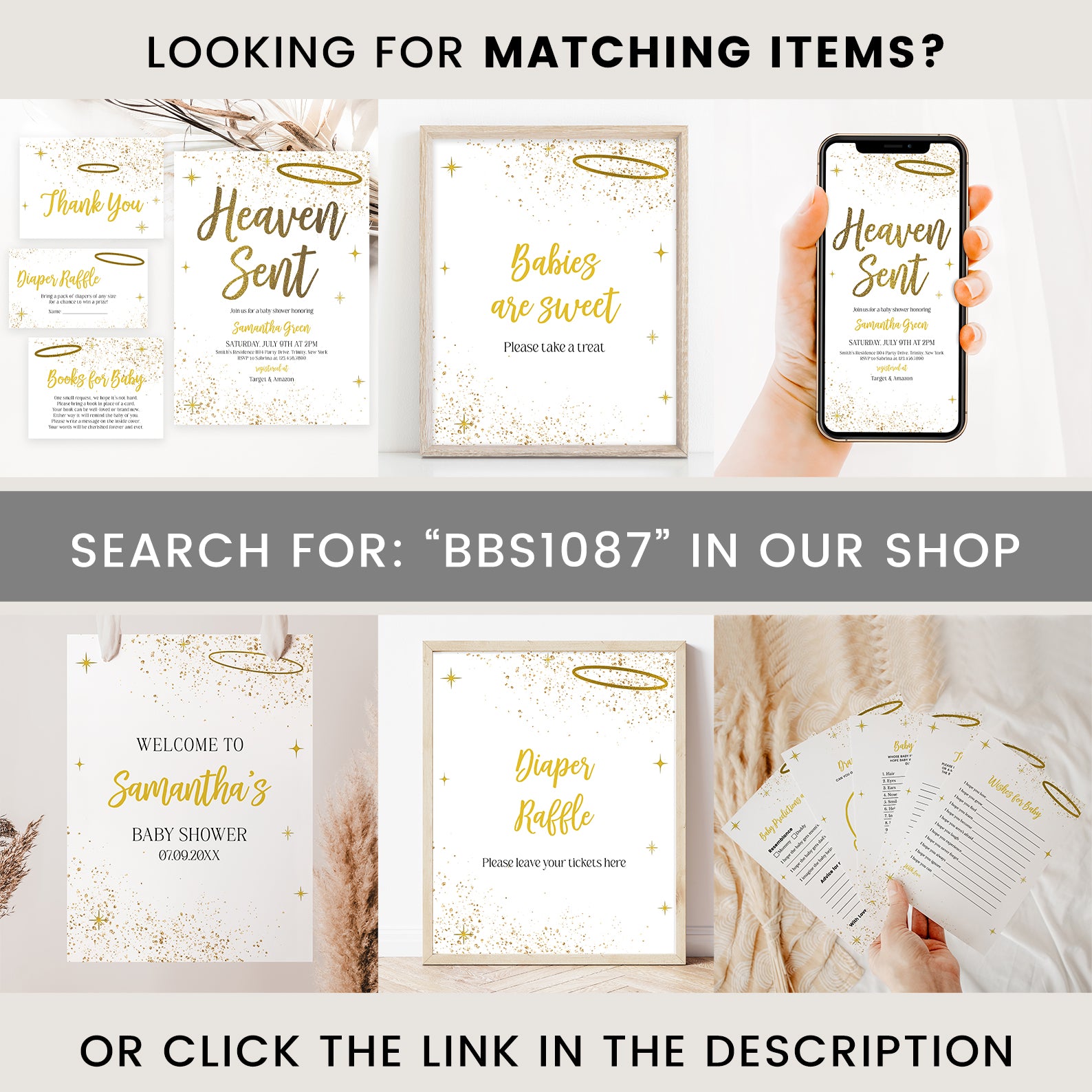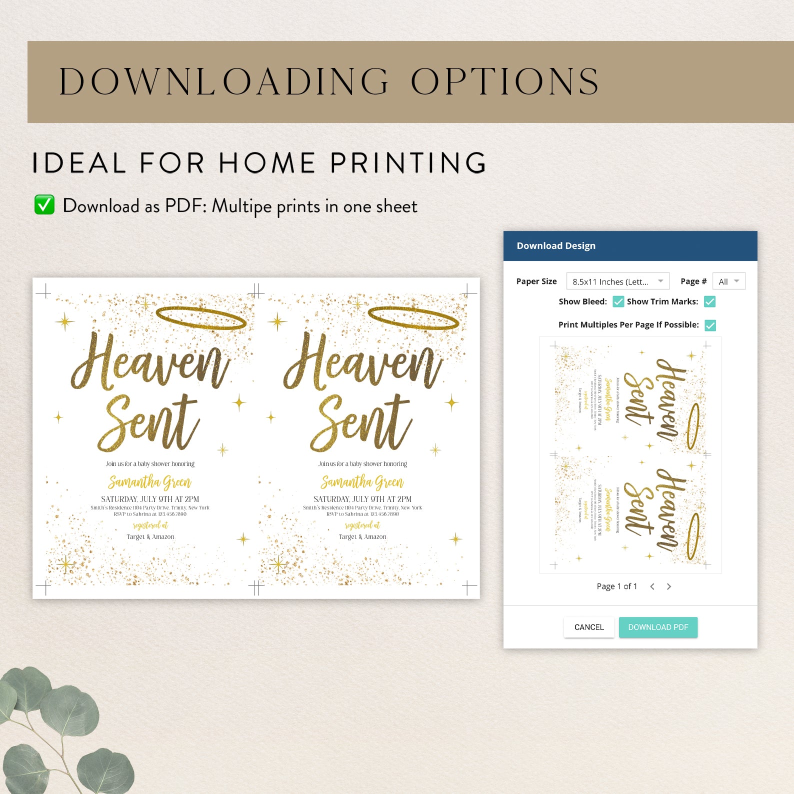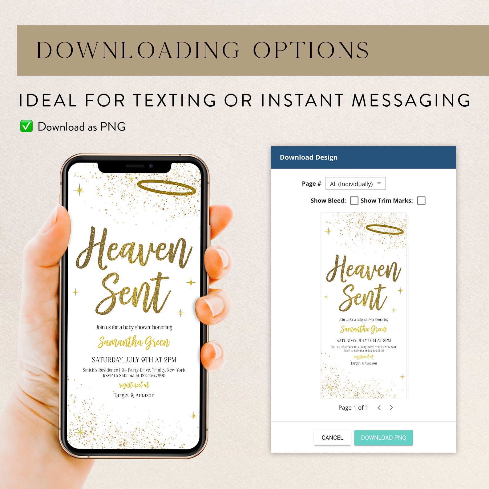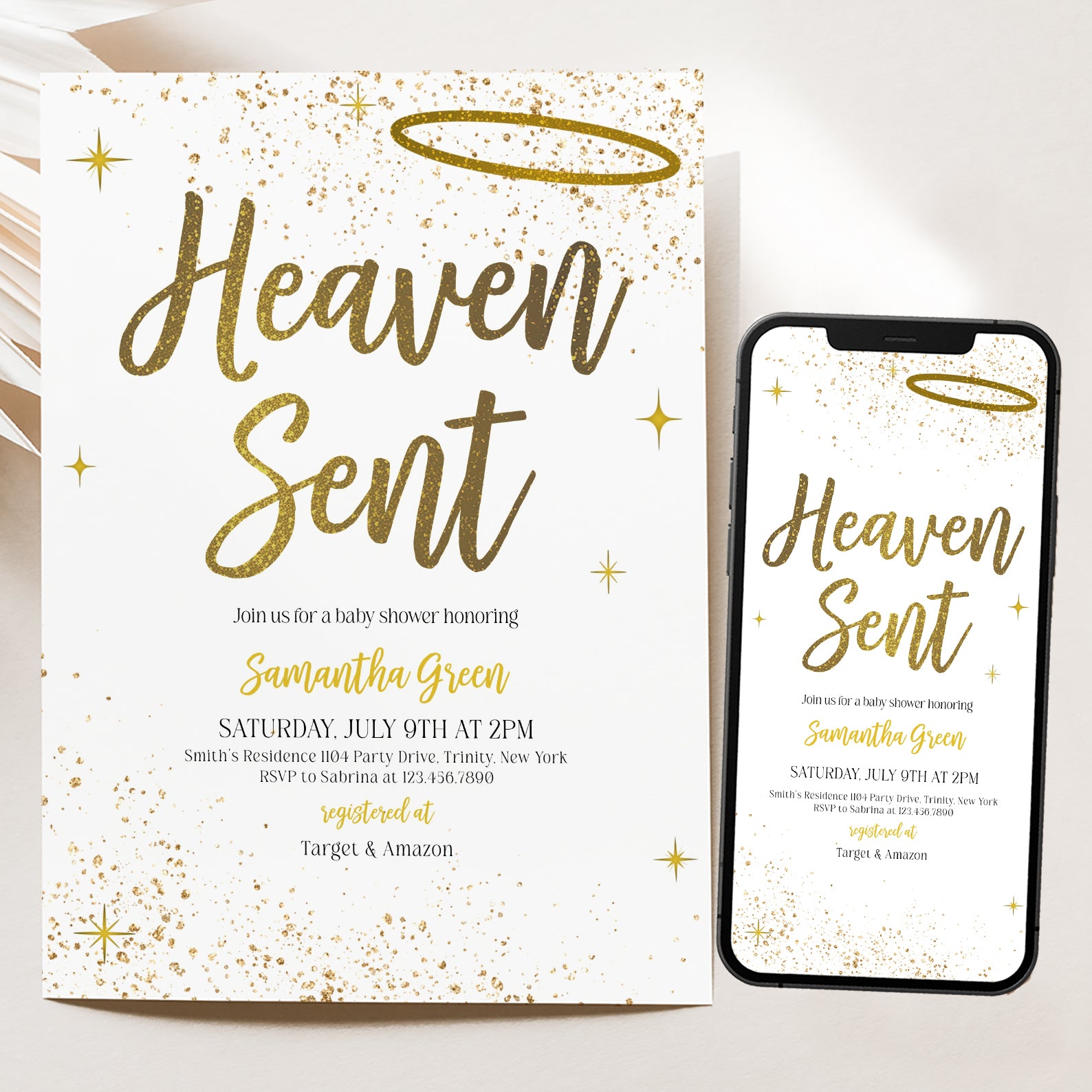 - Purchase this Heaven Sent Baby Shower Digital Invite Bundle: Gold Angel Theme template