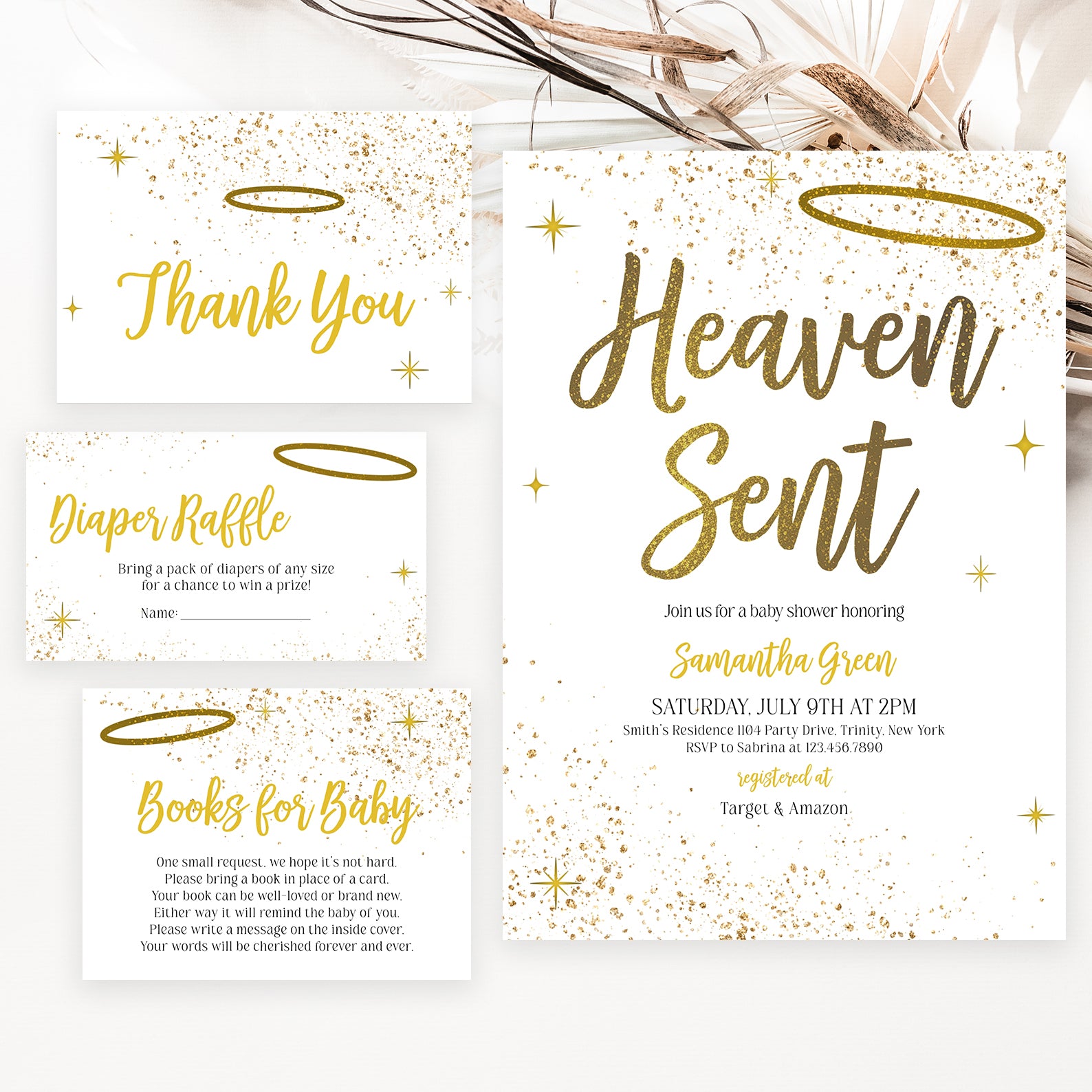Celebrate your baby shower with a heavenly touch using our gold-themed "Heaven Sent" invitation bundle. This elegant set includes a main invitation, mobile version, diaper raffle card, books for baby card, and a thank you card all featuring gold accents, sparkles, and an angelic halo. A beautiful way to announce and commemorate your little angel’s upcoming arrival.