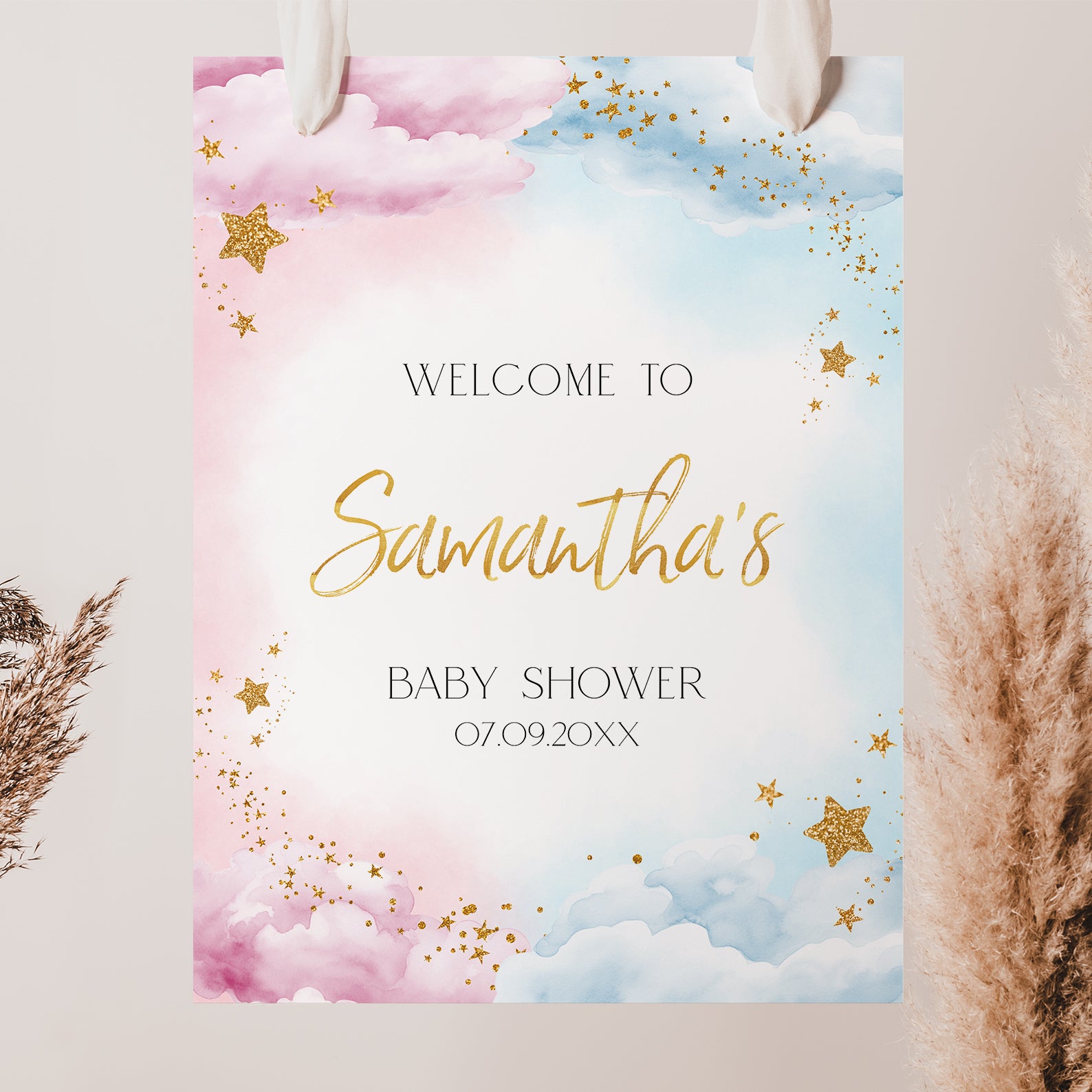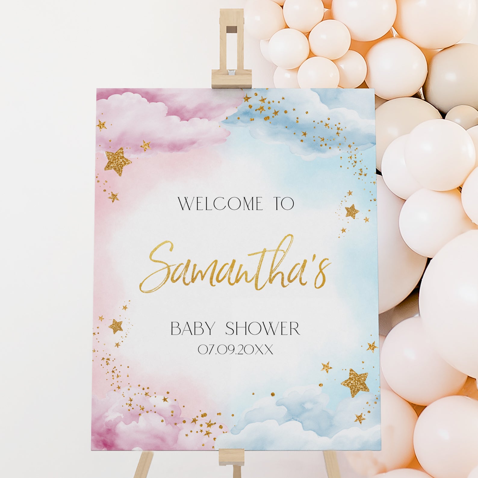 Welcome your guests in style with our Twinkle Twinkle Little Star Baby Shower Welcome Sign! Featuring a whimsical design of pastel blue and pink clouds surrounded by shimmering gold stars, this sign sets the perfect tone for your magical celebration. Easy to customize and print, it’s a beautiful addition to your baby shower decor that will captivate your guests from the moment they arrive.