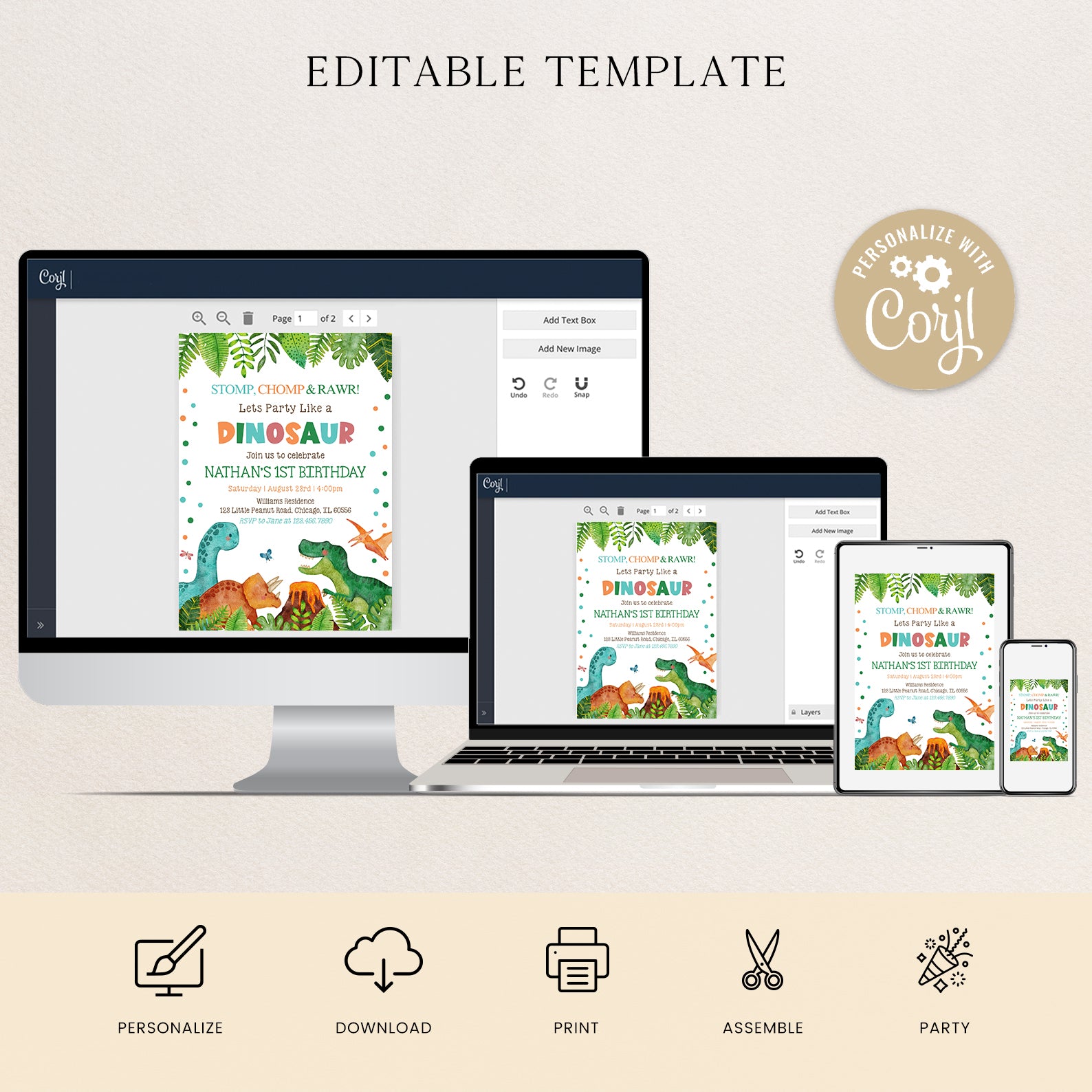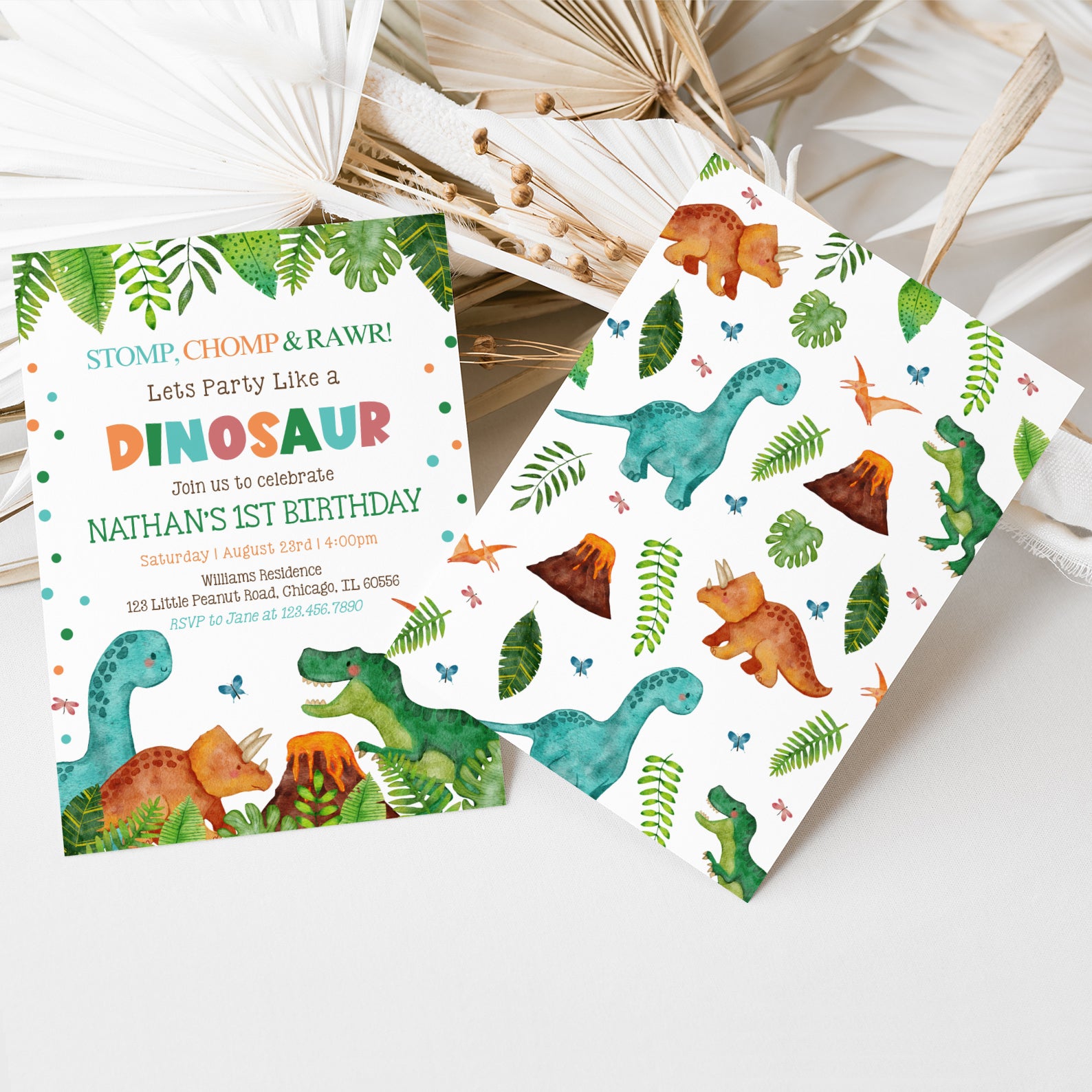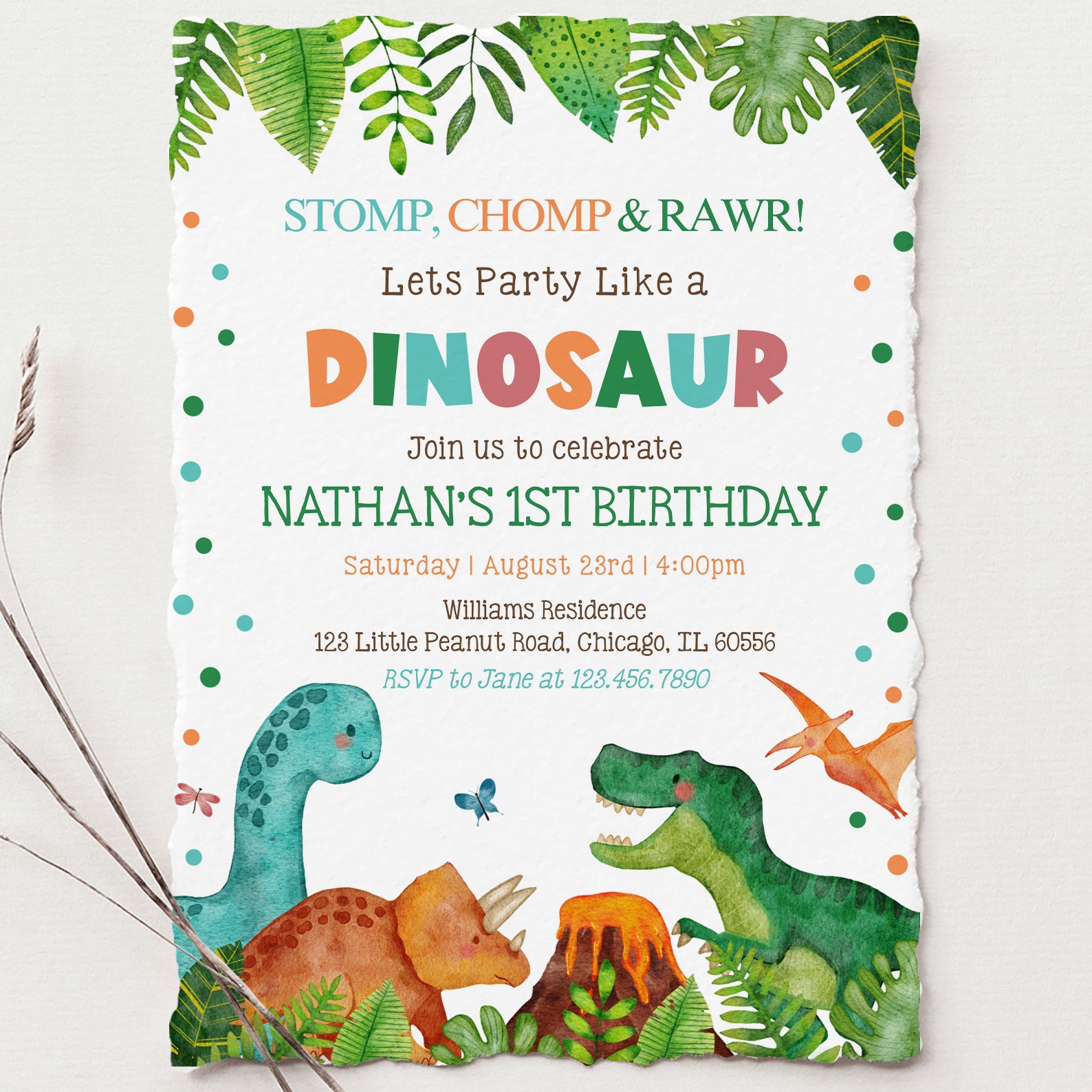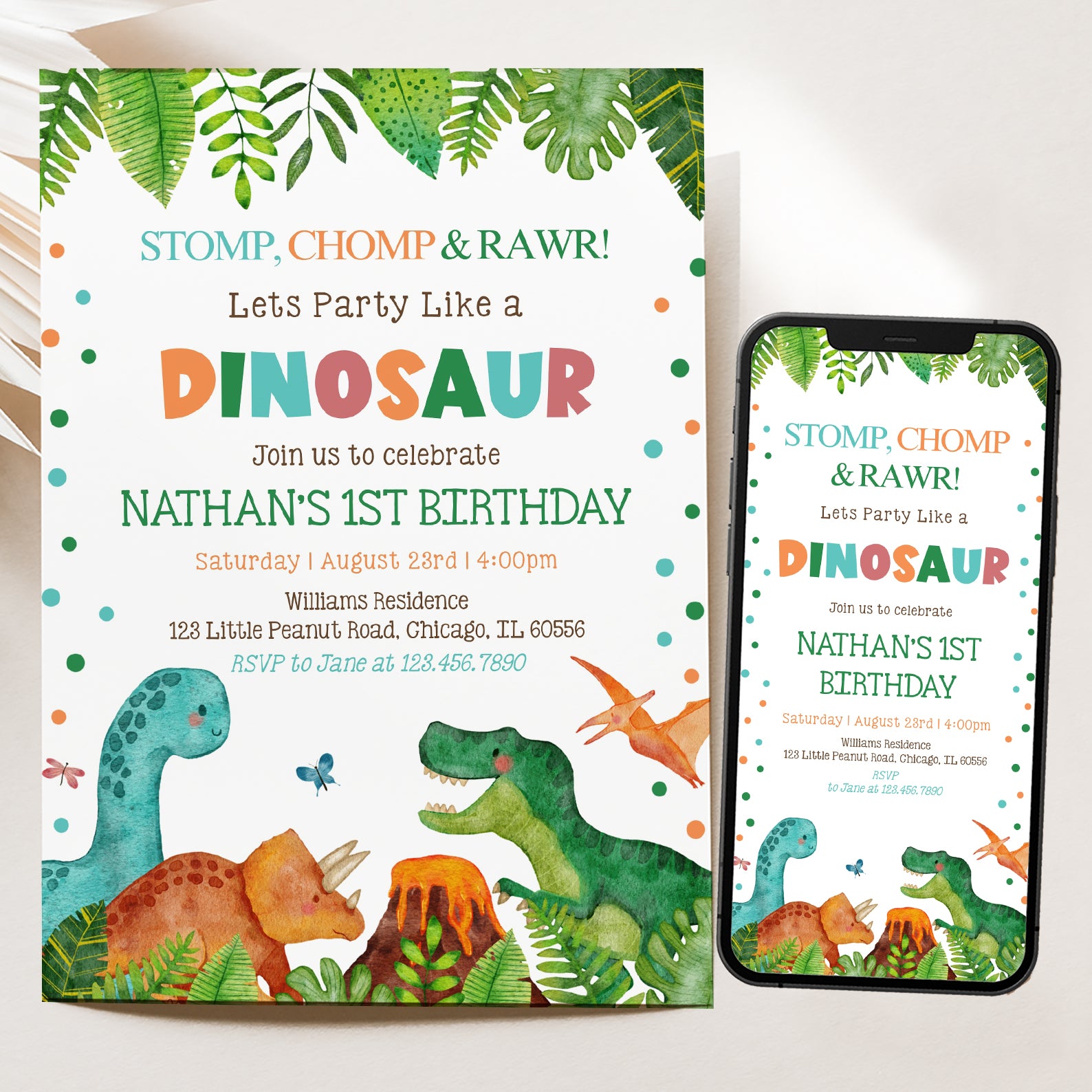 - Purchase this Stomp Chomp Roar Dino 1st Birthday Invite: Jungle Theme template
