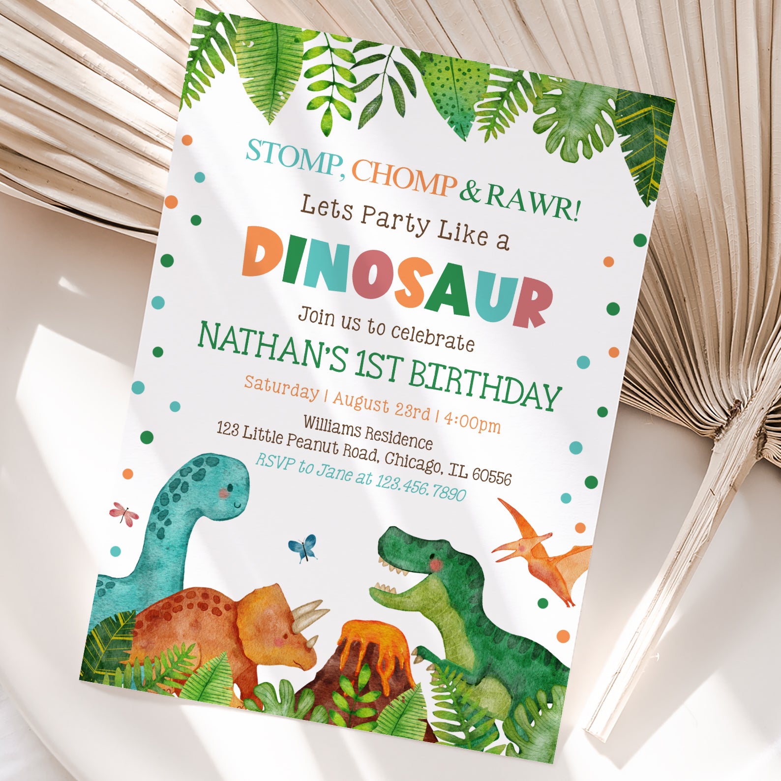Stomp Chomp Roar Dino 1st Birthday Invite: Jungle Theme