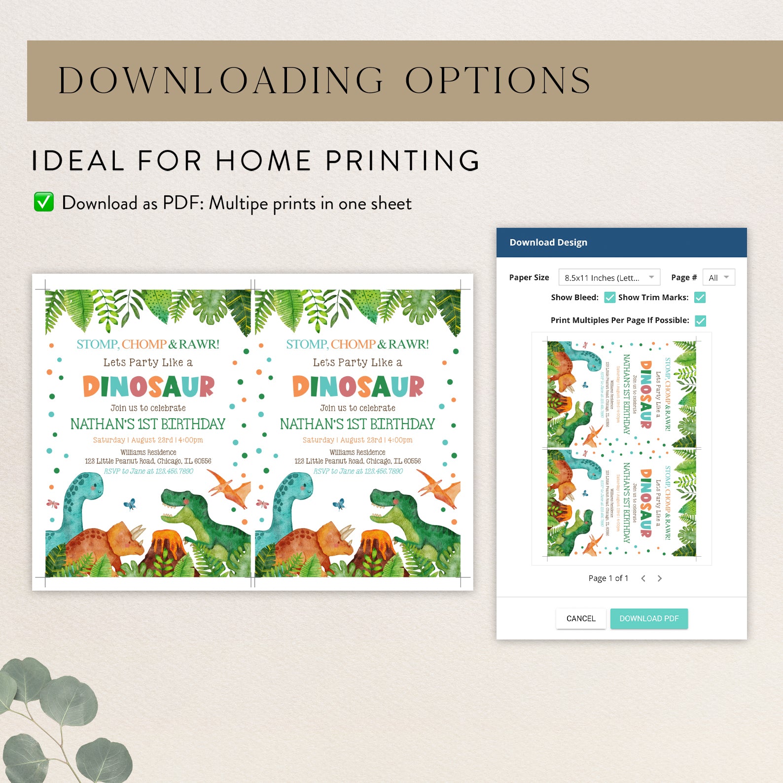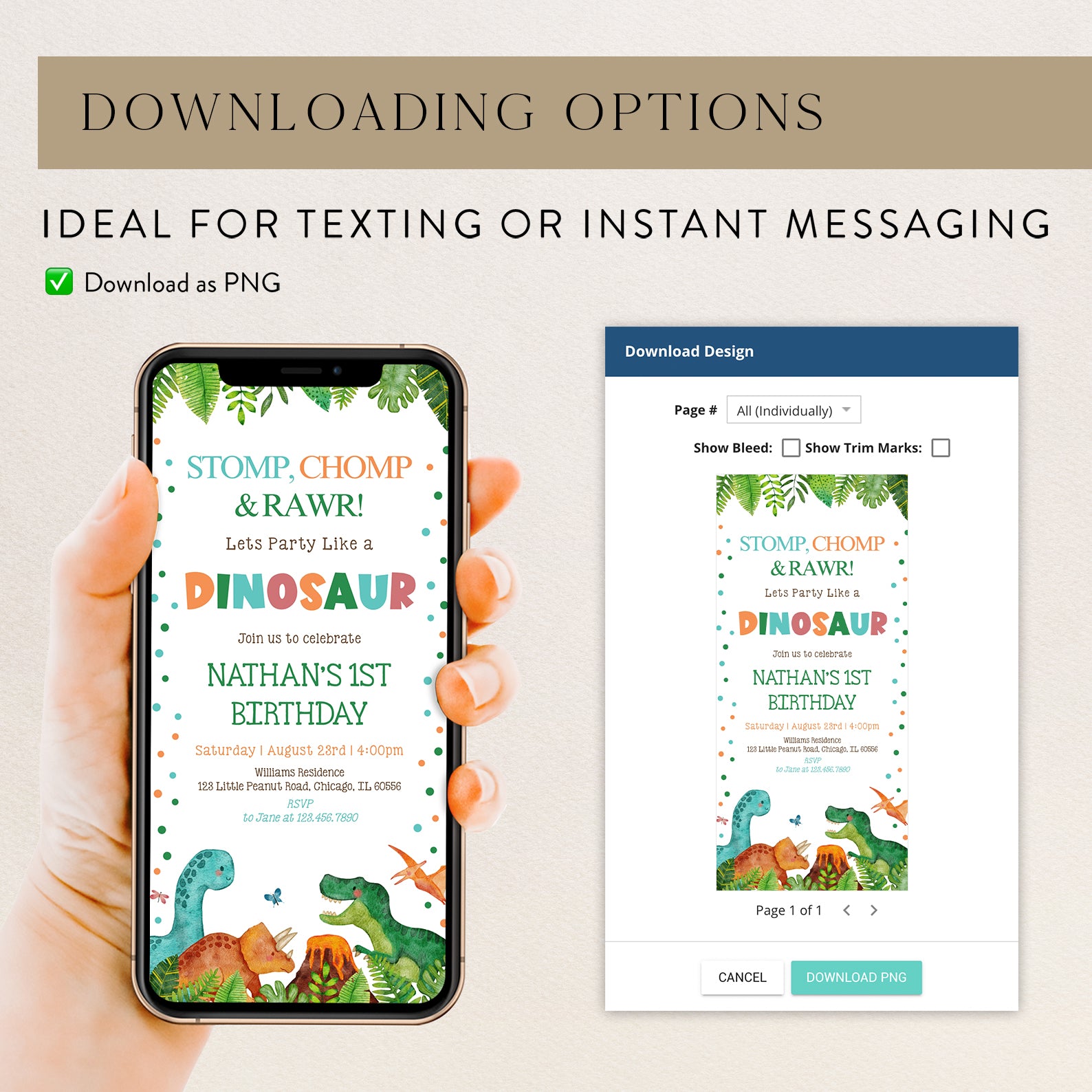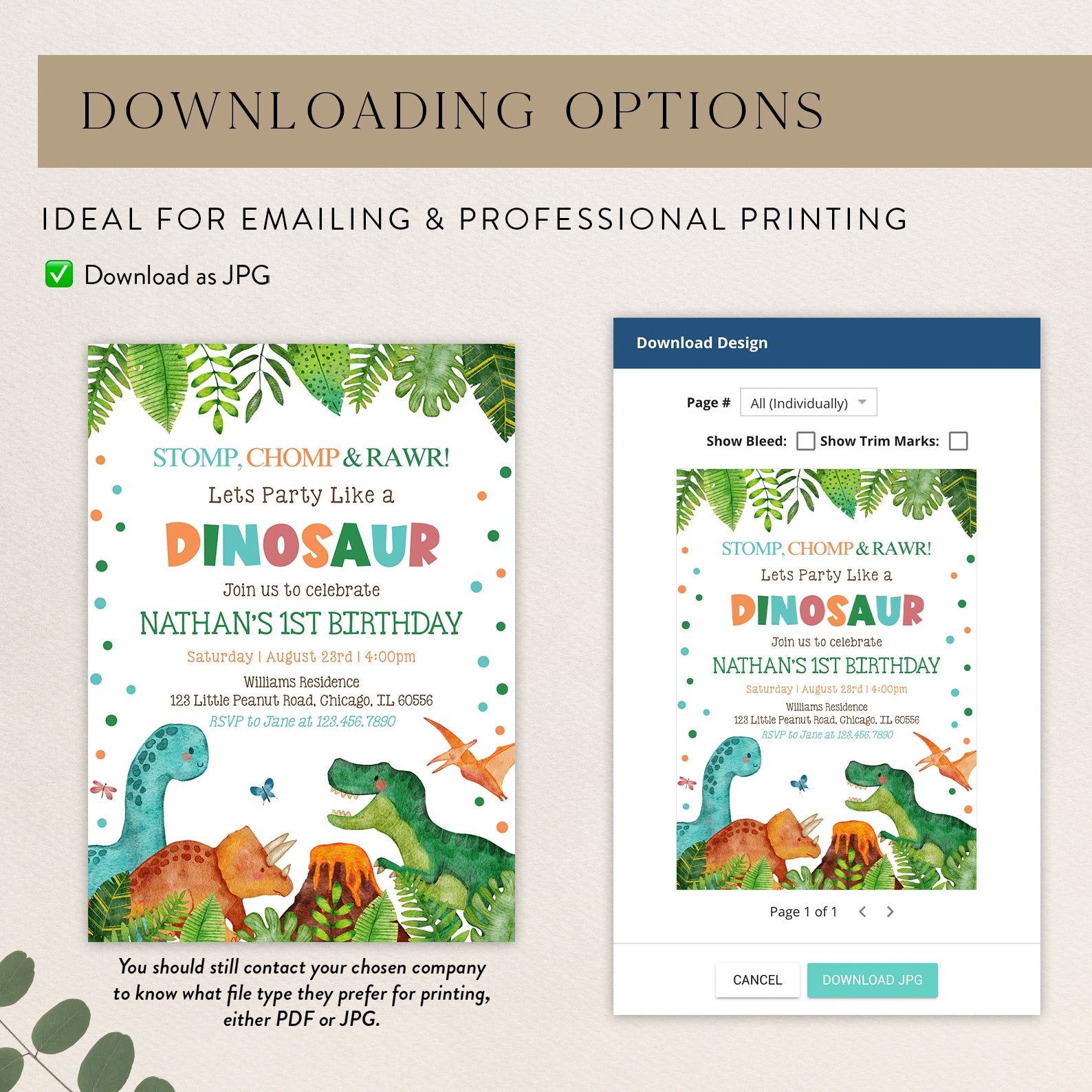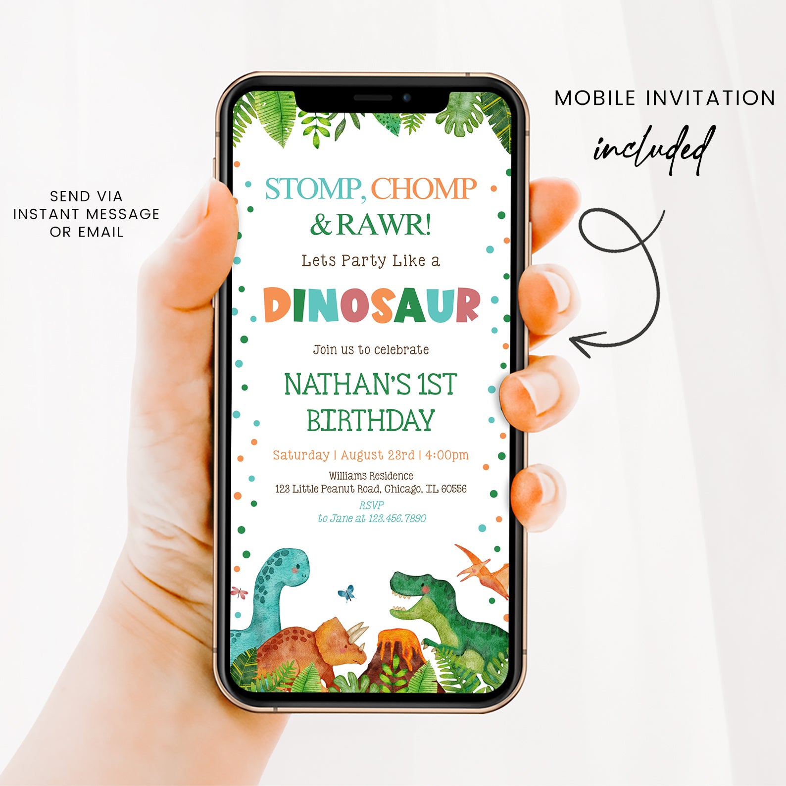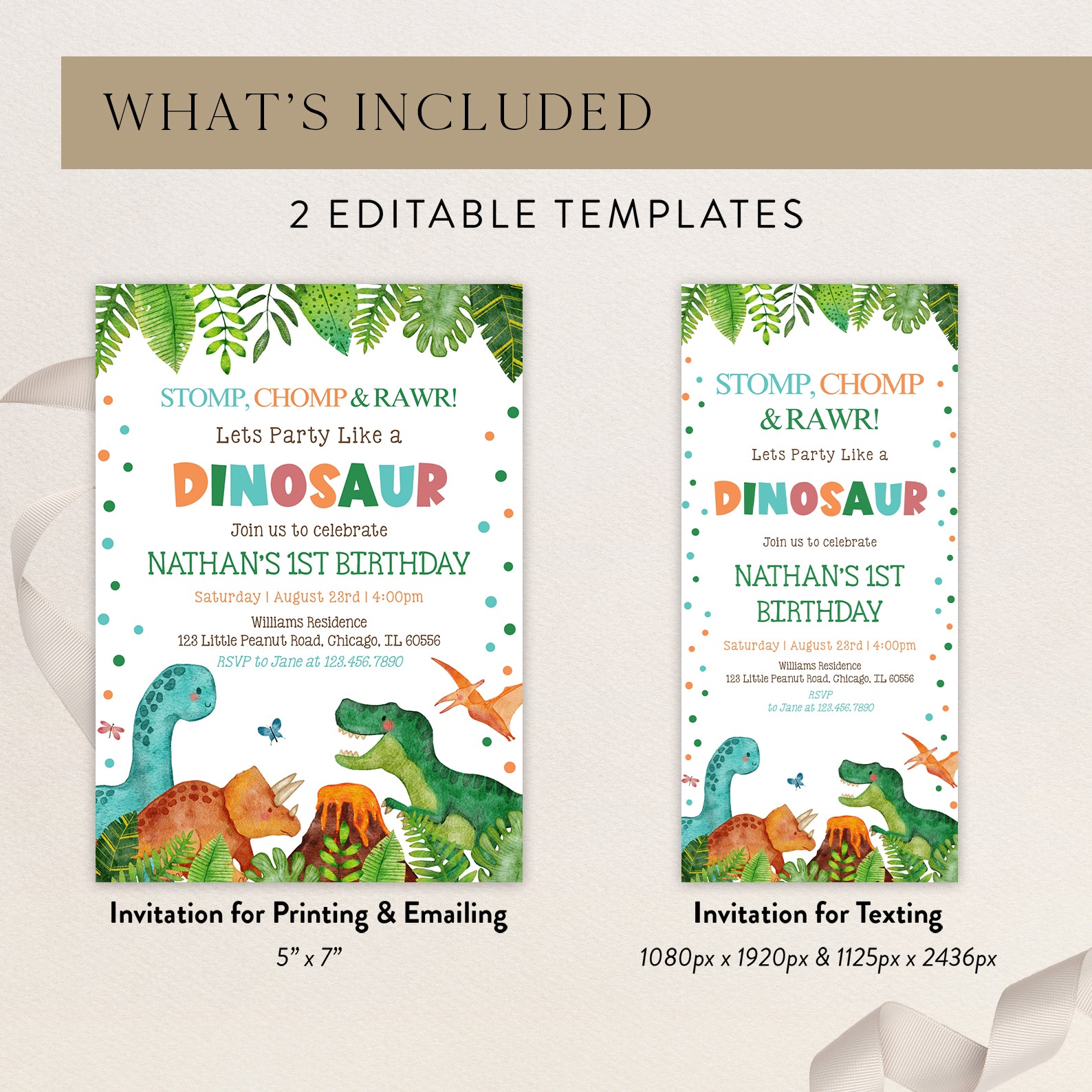Get ready to roar with excitement for your little one's 1st birthday! Our Stomp, Chomp, and Rawr Dinosaur-themed digital invitation is the perfect way to set the stage for a wild jungle adventure. Featuring vibrant green leaves framing the top and bottom, this playful design showcases adorable dinosaurs and a small erupting volcano that will delight guests of all ages. Easy to customize and send, this invitation ensures your celebration is as unforgettable as your little dino's first year!