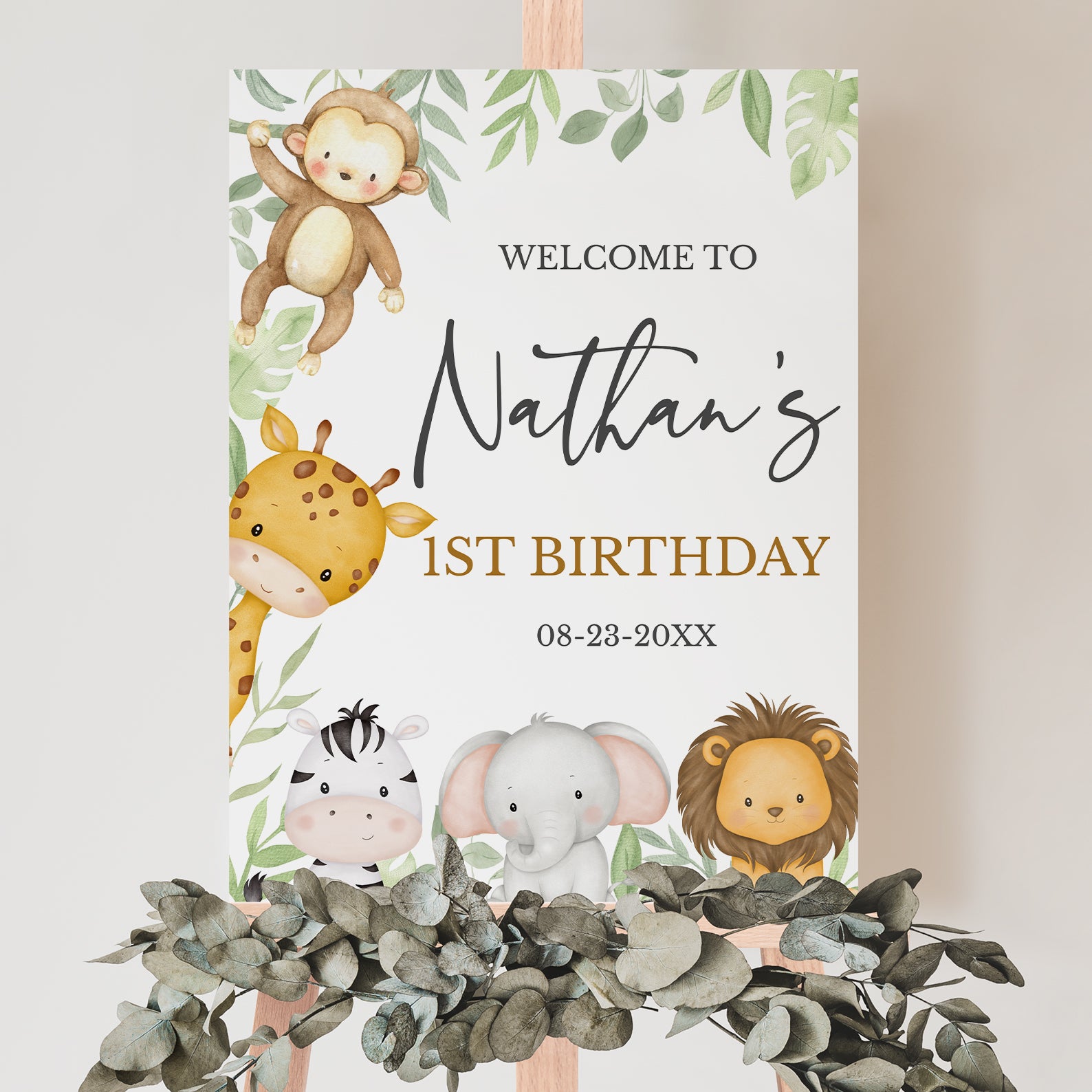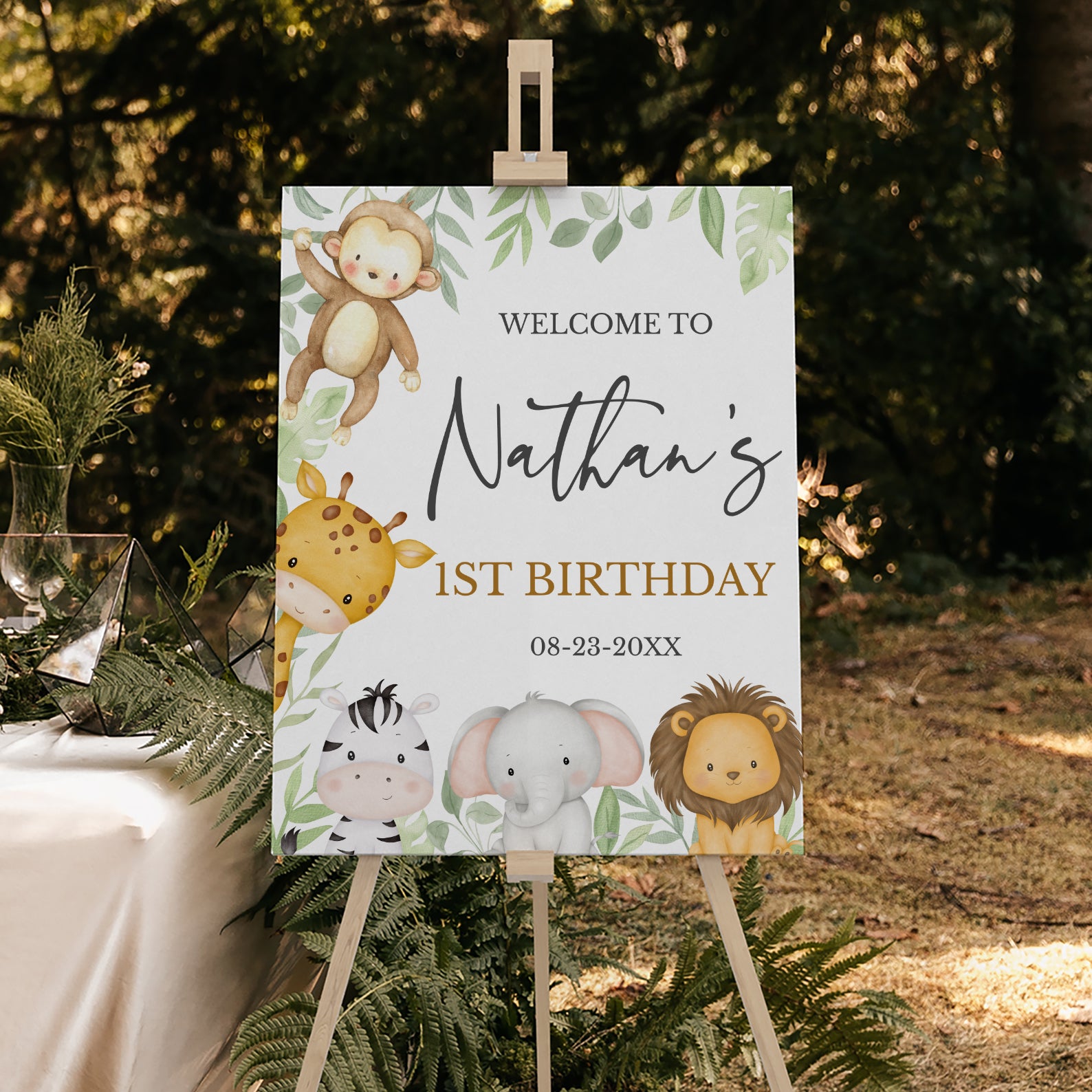 Welcome your guests to a wild celebration with our charming "Wild One" digital welcome sign! Designed with an adorable lineup of jungle baby animals—including a curious monkey, tall giraffe, striped zebra, playful elephant, and brave little lion—this sign is framed by lush green leaves for a tropical touch. Perfect for setting the scene at your little one’s first birthday party, it adds a fun and festive vibe right from the entrance. Easy to personalize and print, this jungle-themed sign makes a delightful first impression at your child’s big milestone event!