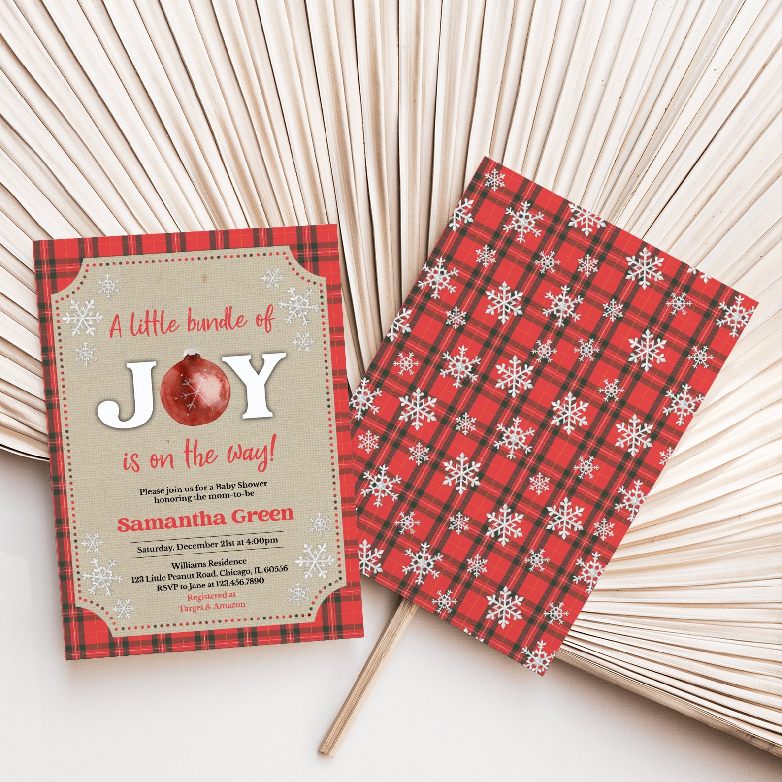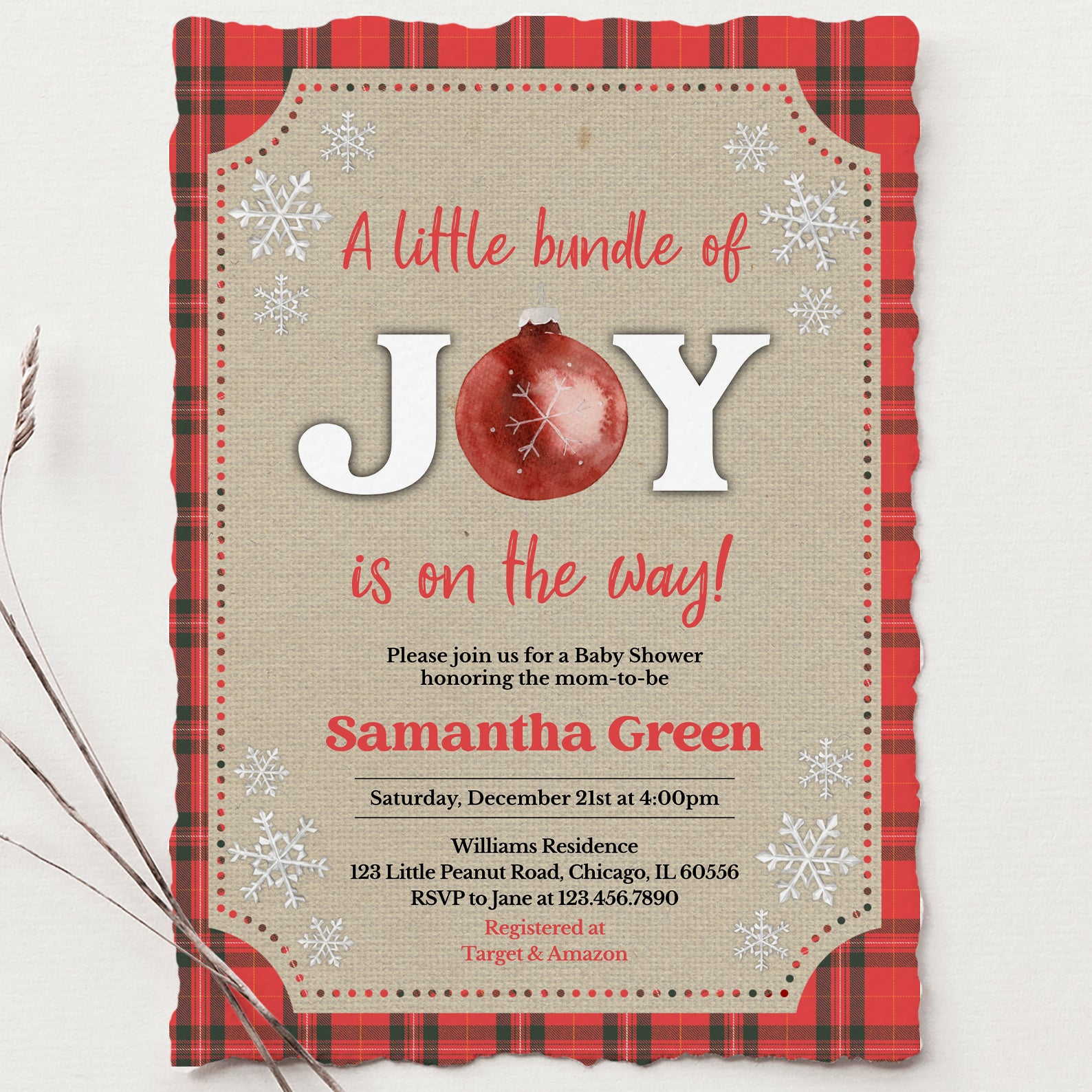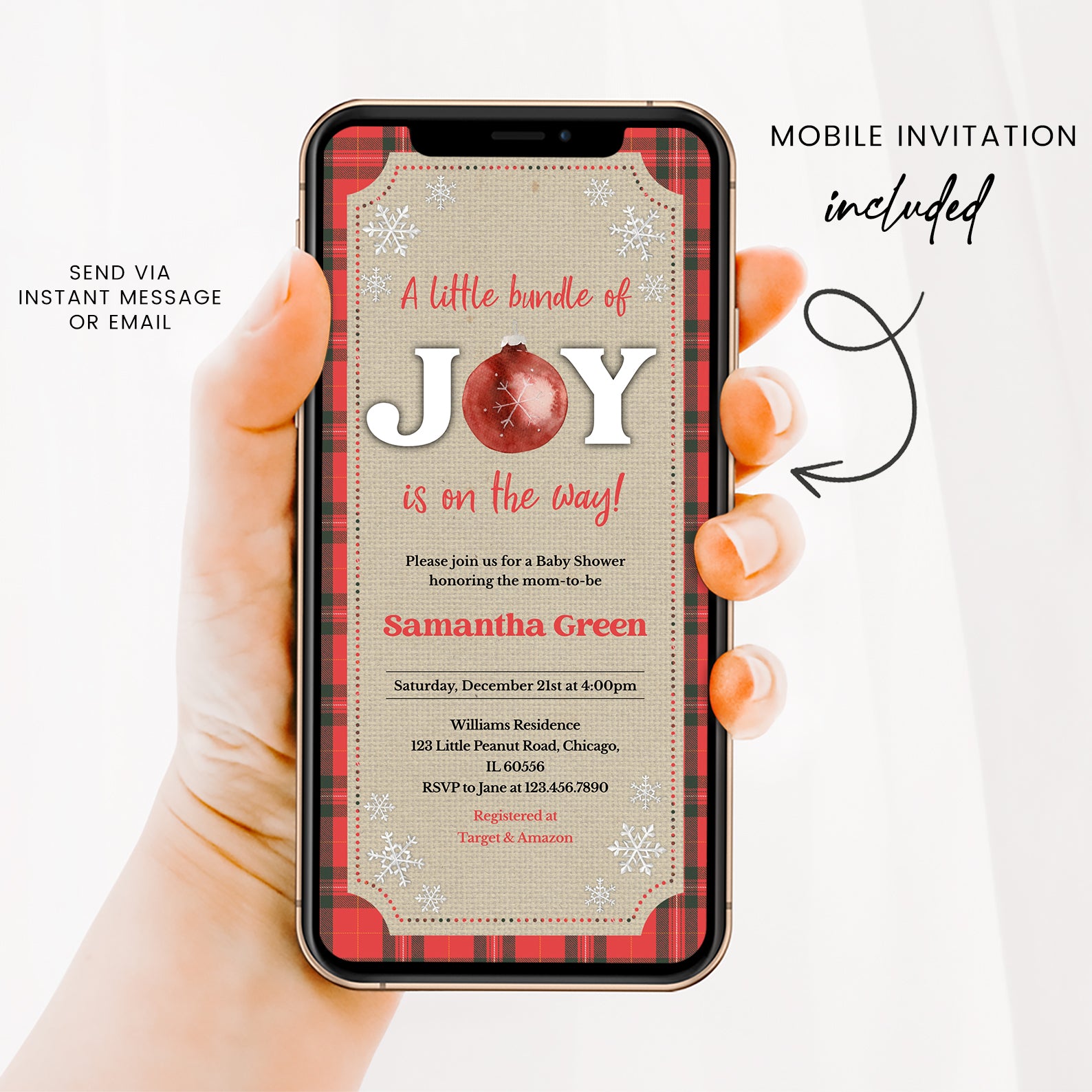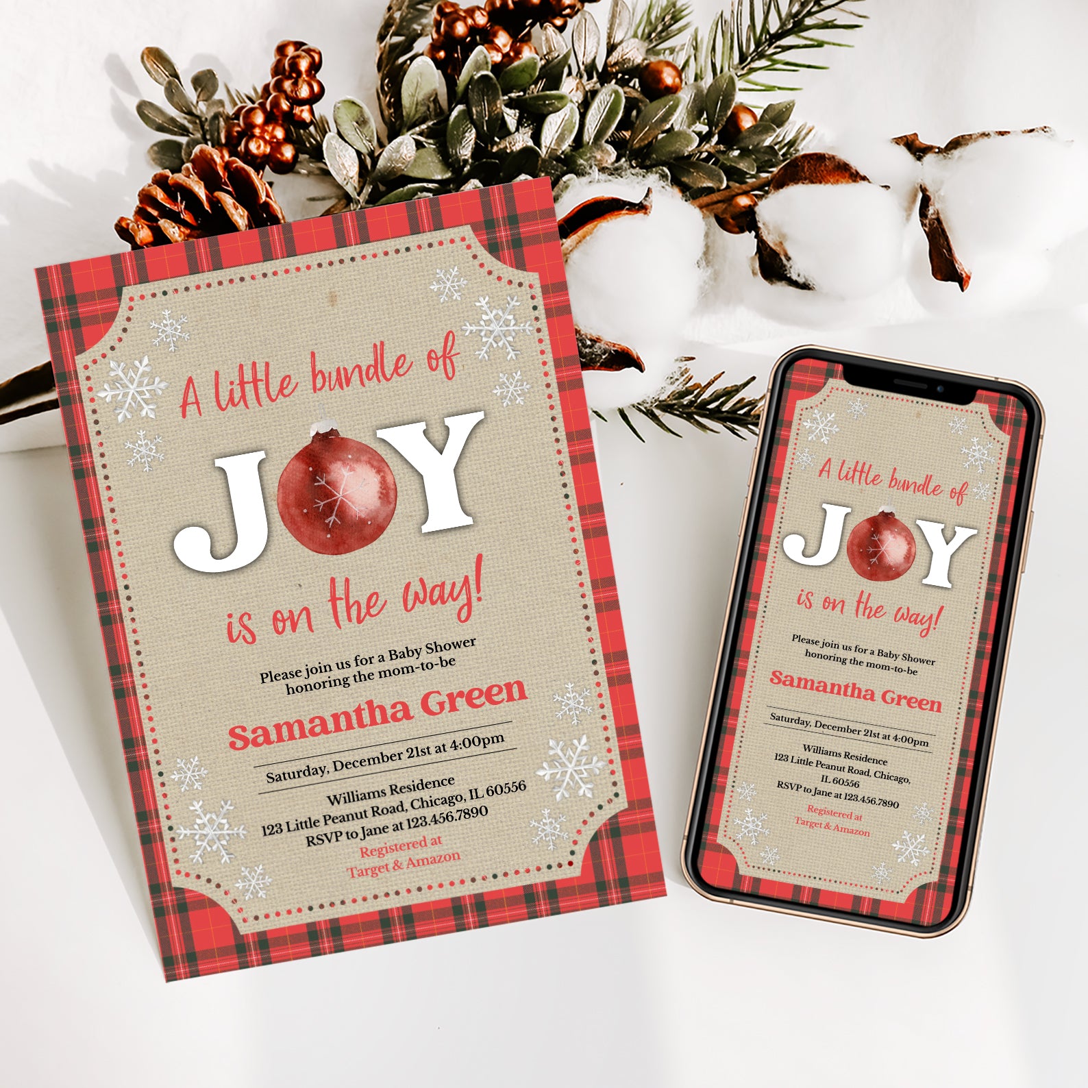 Celebrate the arrival of your little one with our charming winter baby shower digital invitation! Featuring a delightful red Christmas ball accentuating the heartfelt message, this design is beautifully complemented by minimal silver snowflakes that dance along the edges. Set against a warm brown backdrop and a festive red checkered pattern, this invitation perfectly captures the cozy spirit of the season, making it an ideal choice for your joyous occasion.
