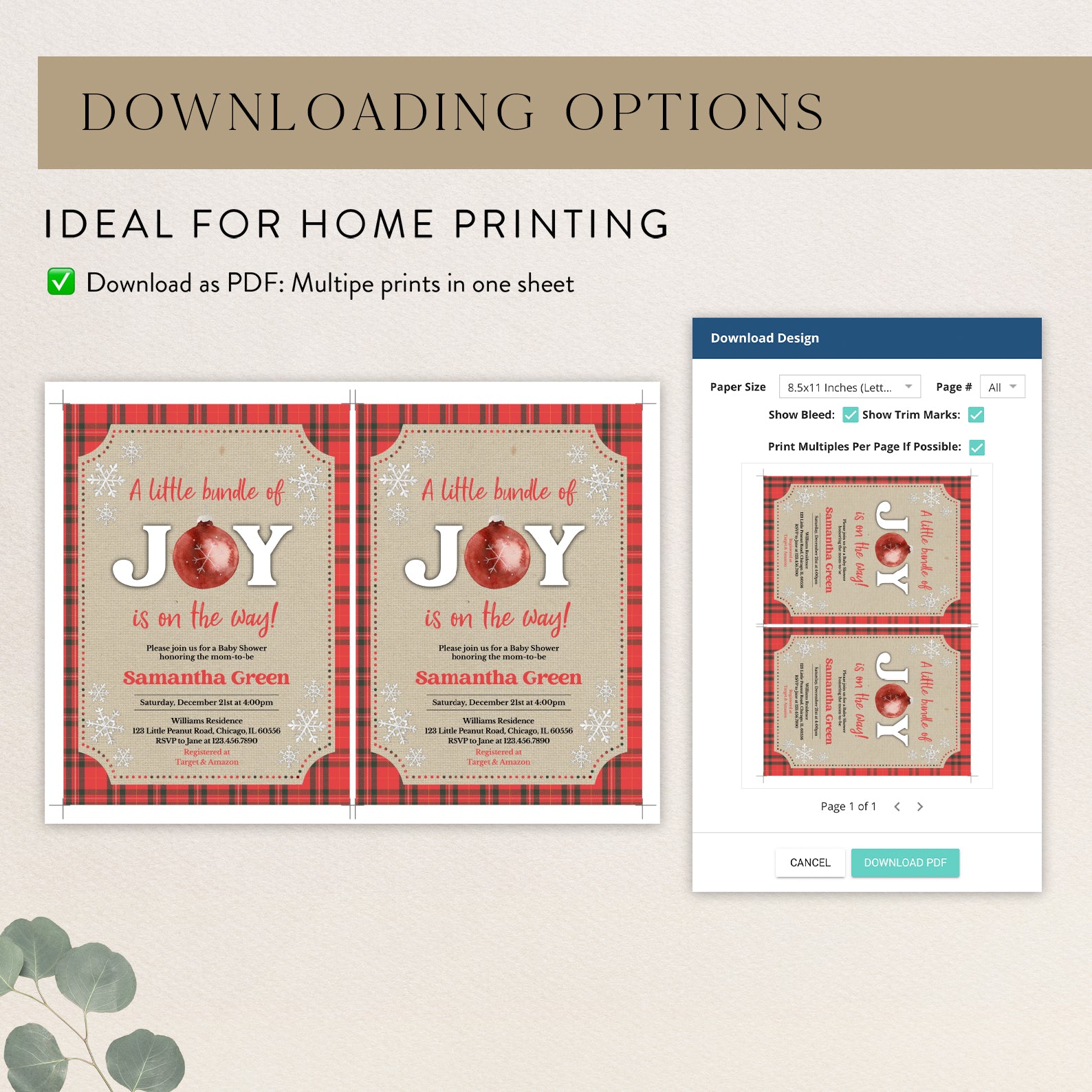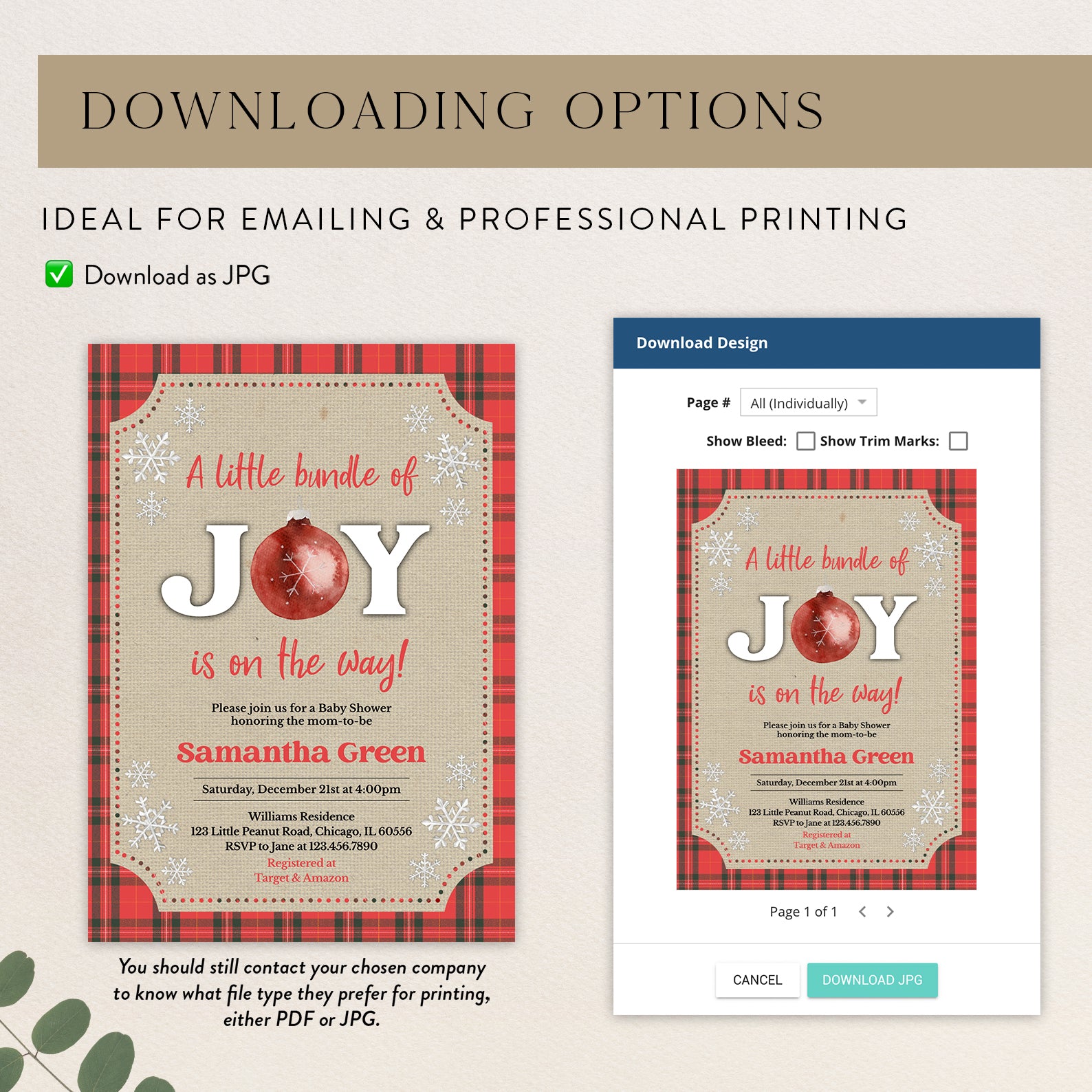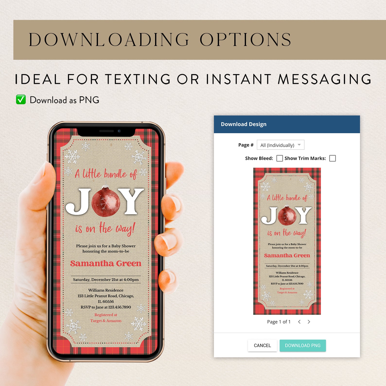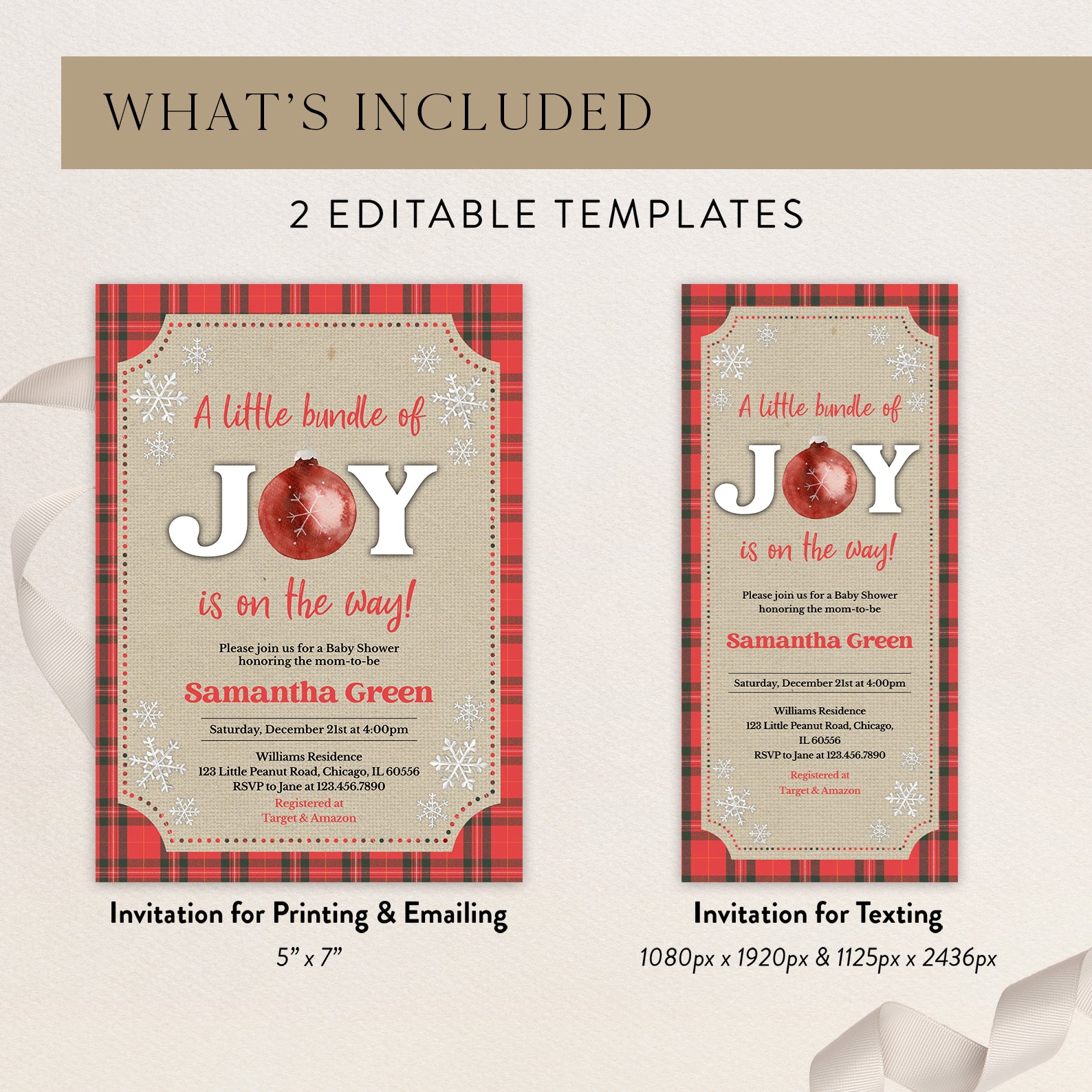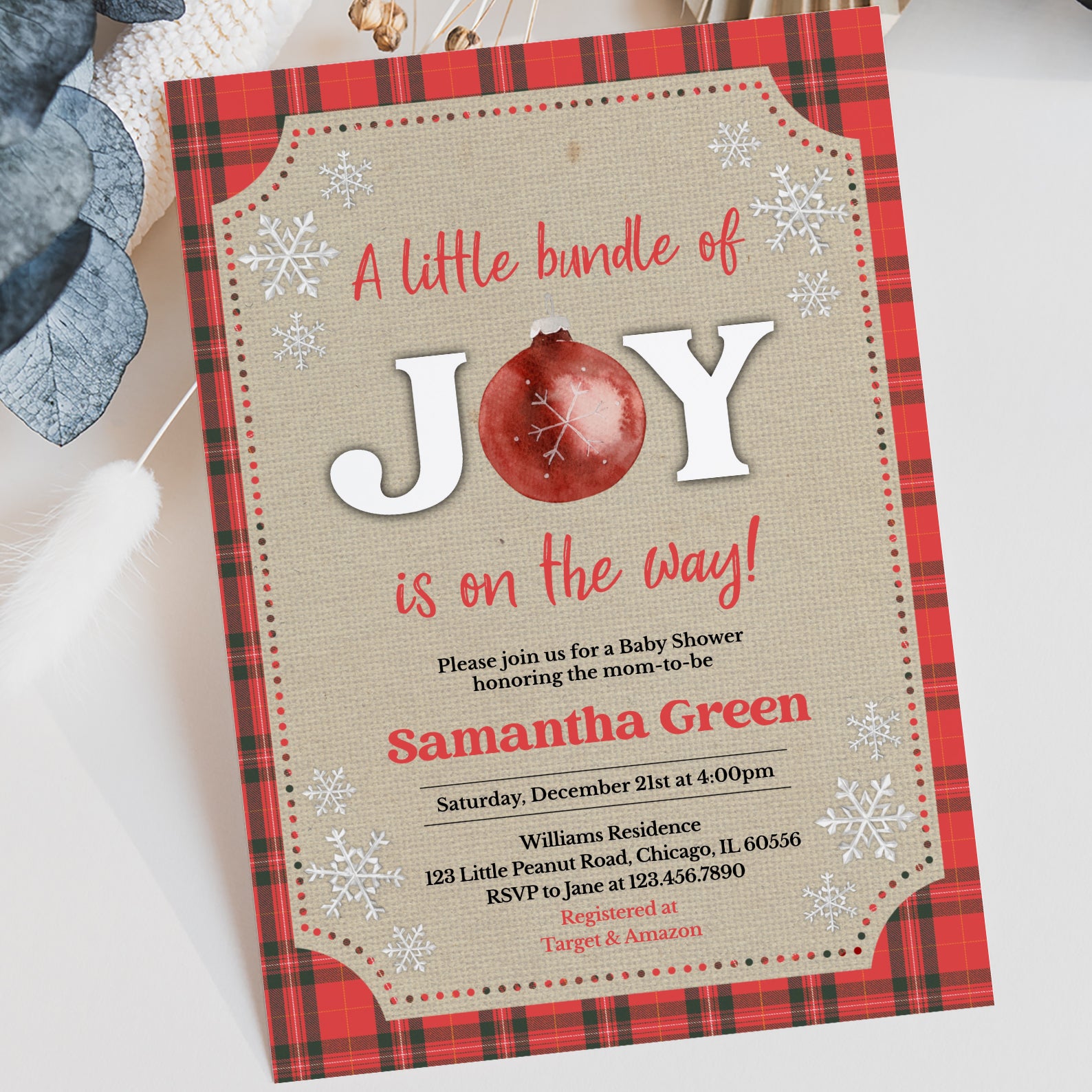 Celebrate the arrival of your little one with our charming winter baby shower digital invitation! Featuring a delightful red Christmas ball accentuating the heartfelt message, this design is beautifully complemented by minimal silver snowflakes that dance along the edges. Set against a warm brown backdrop and a festive red checkered pattern, this invitation perfectly captures the cozy spirit of the season, making it an ideal choice for your joyous occasion.