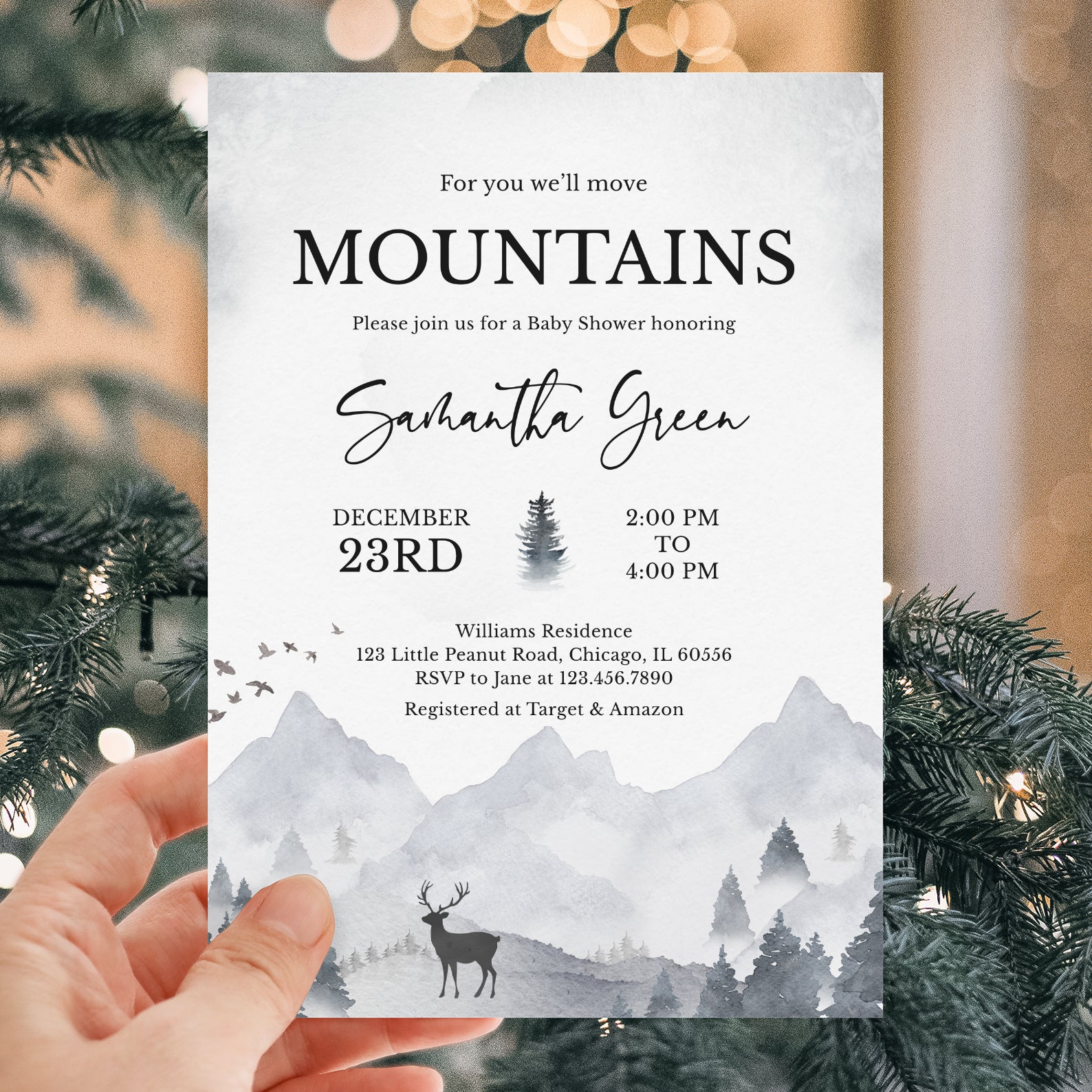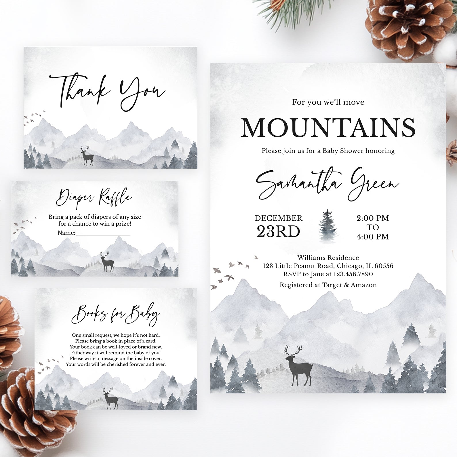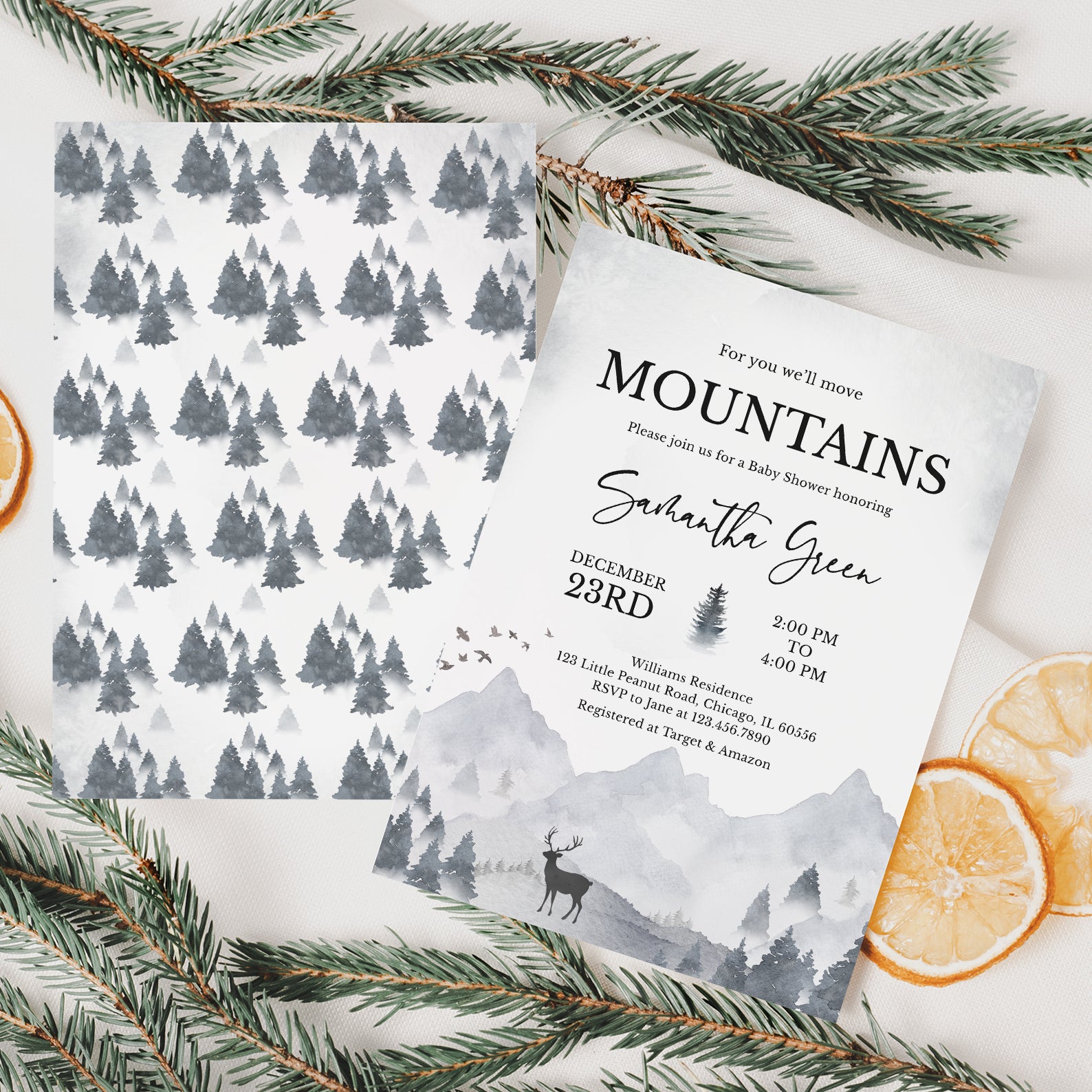- Purchase this Cozy Winter Baby Shower Invite Bundle: Mountains & Pine Trees template
