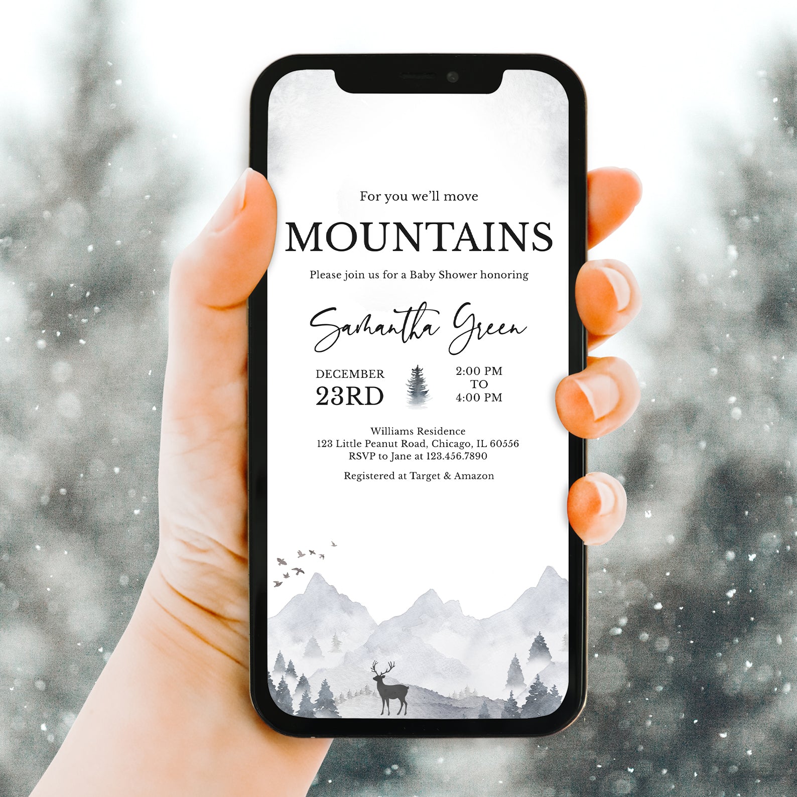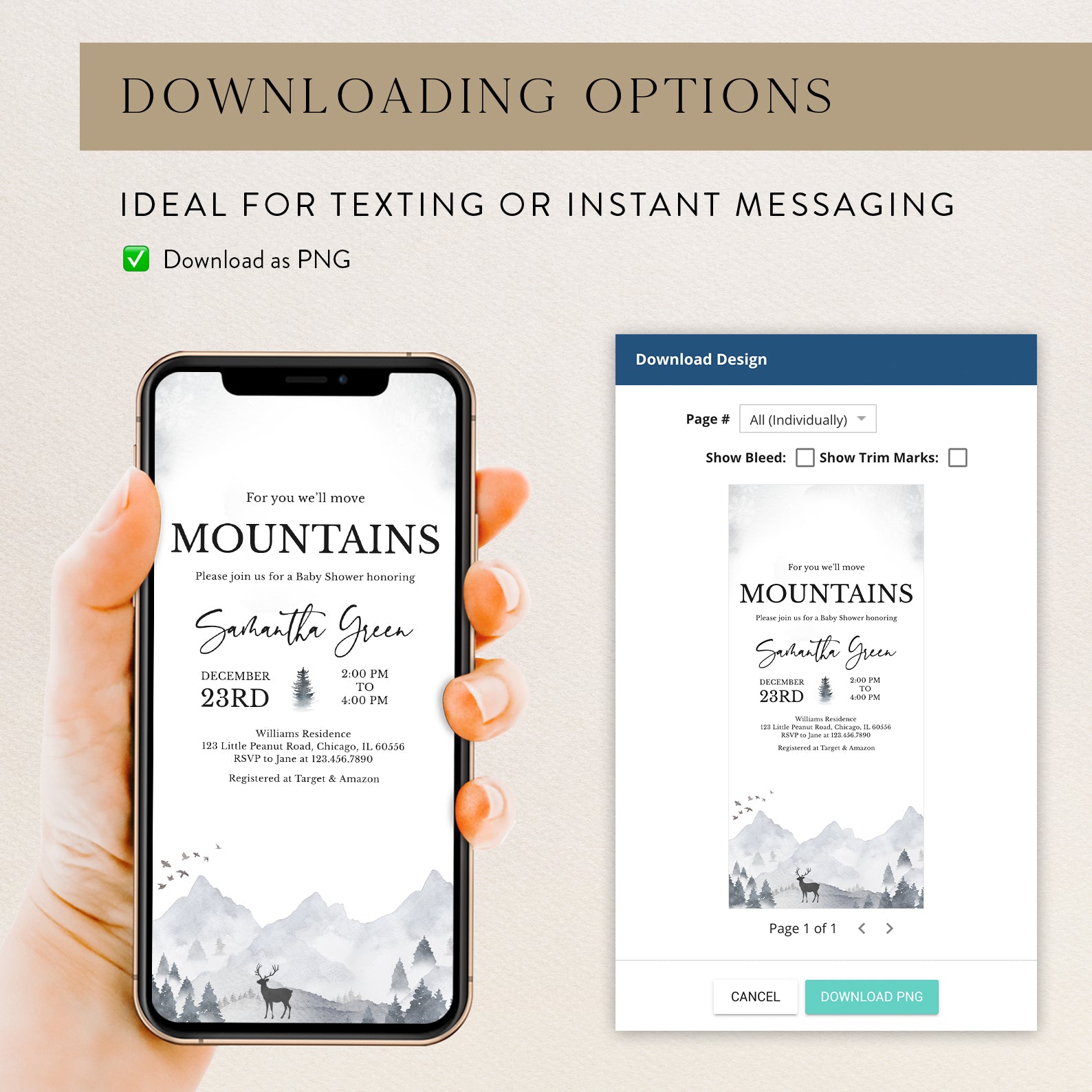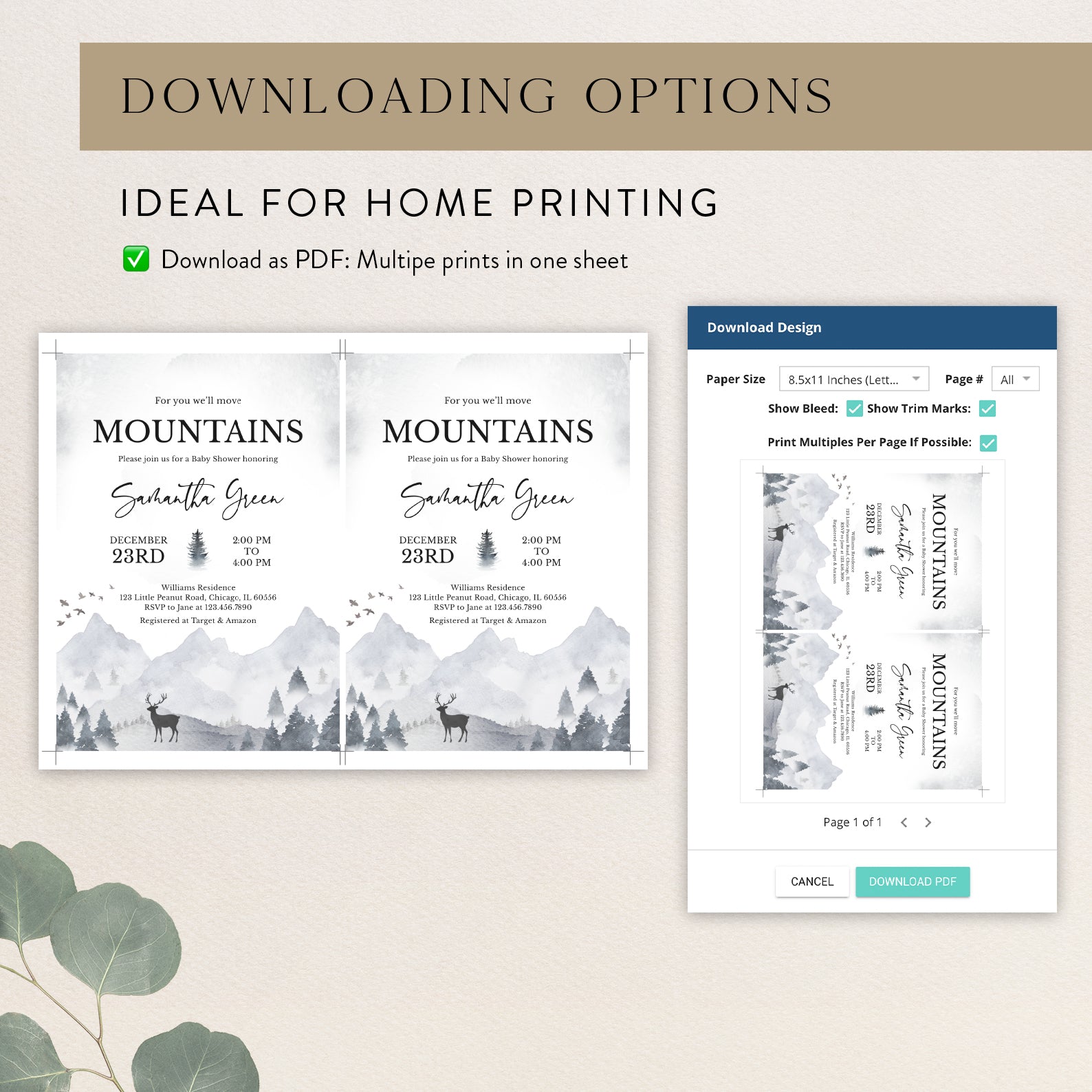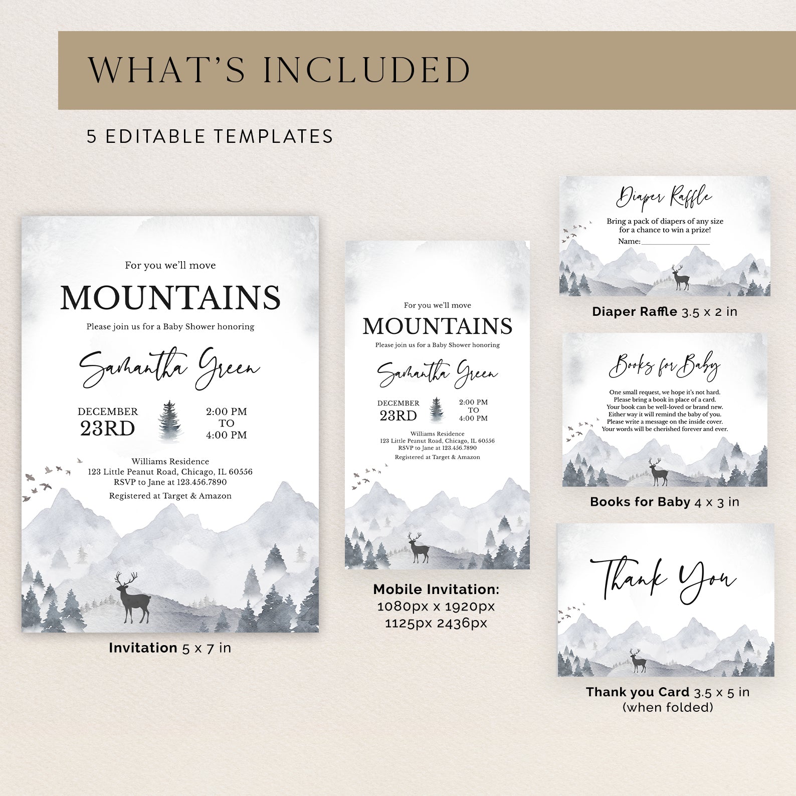 - Purchase this Cozy Winter Baby Shower Invite Bundle: Mountains & Pine Trees template
