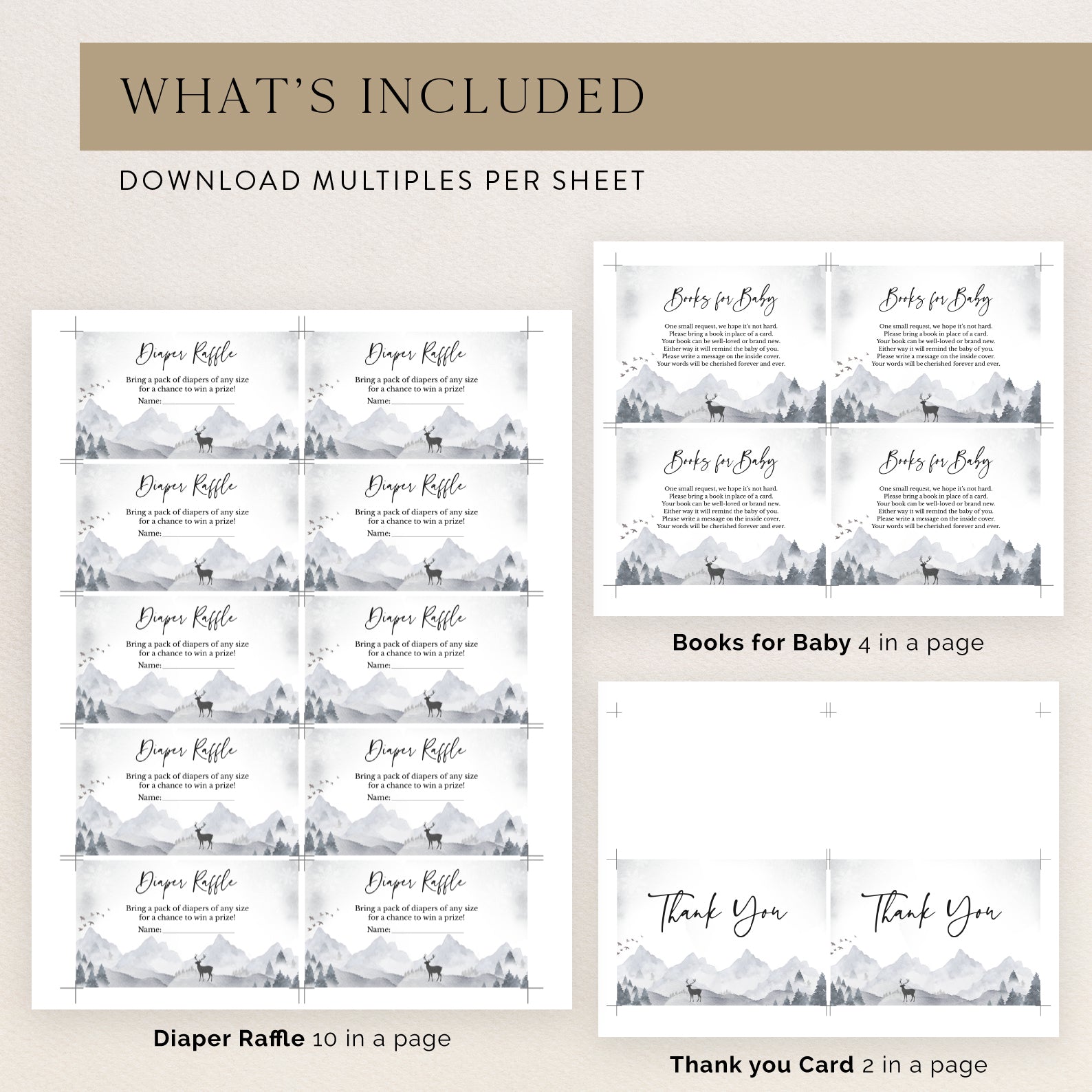 Bring the magic of the season to life with our Winter Baby Shower Invitation Bundle. Featuring a majestic reindeer, snowy mountains, soaring birds, and lush pine trees, this cozy woodland design sets the tone for your celebration. The bundle includes an invitation, mobile invite, diaper raffle card, books for baby card, and thank you card. Everything you need to start your winter-themed baby shower in style.