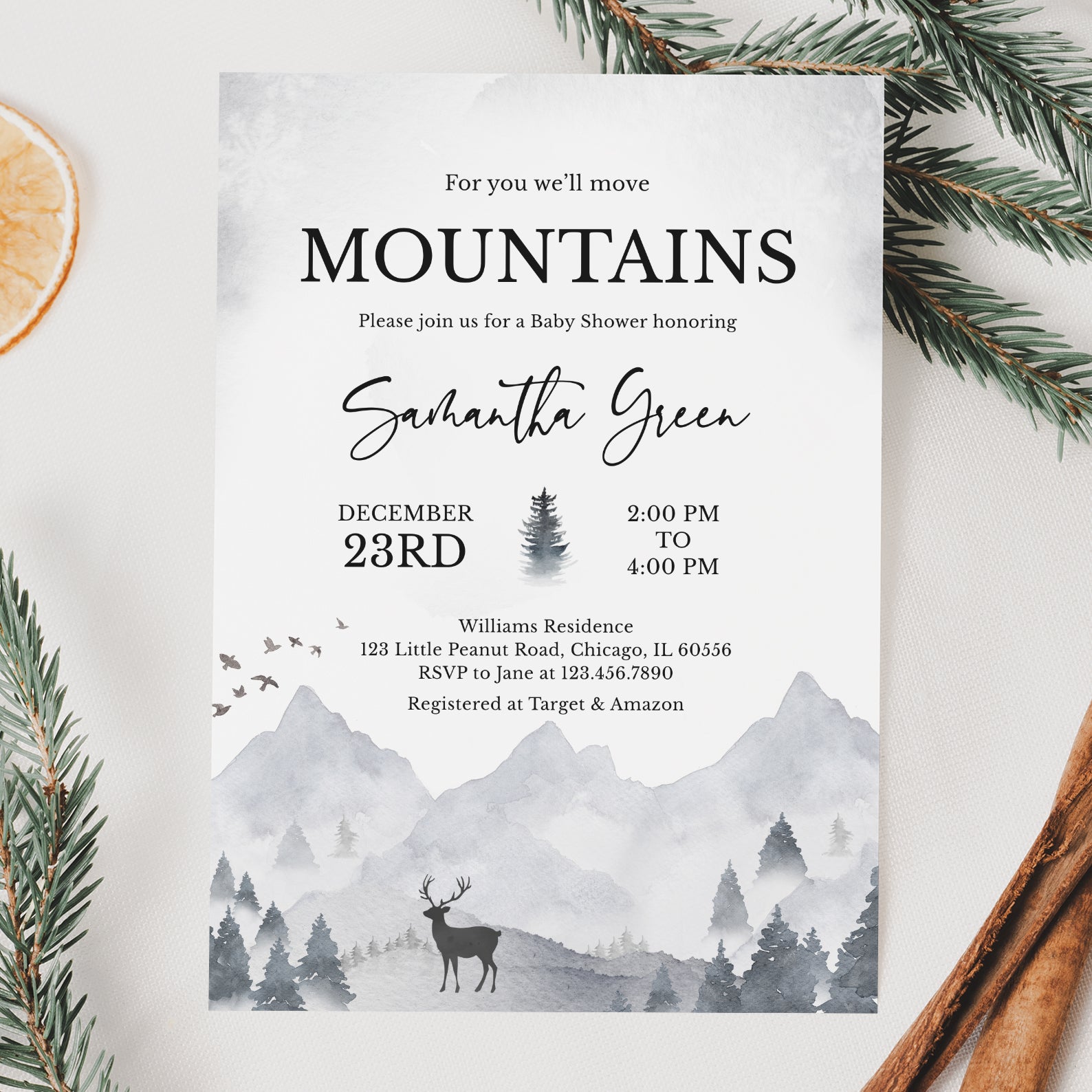 - Purchase this Cozy Winter Baby Shower Invite: Mountains & Pine Trees template