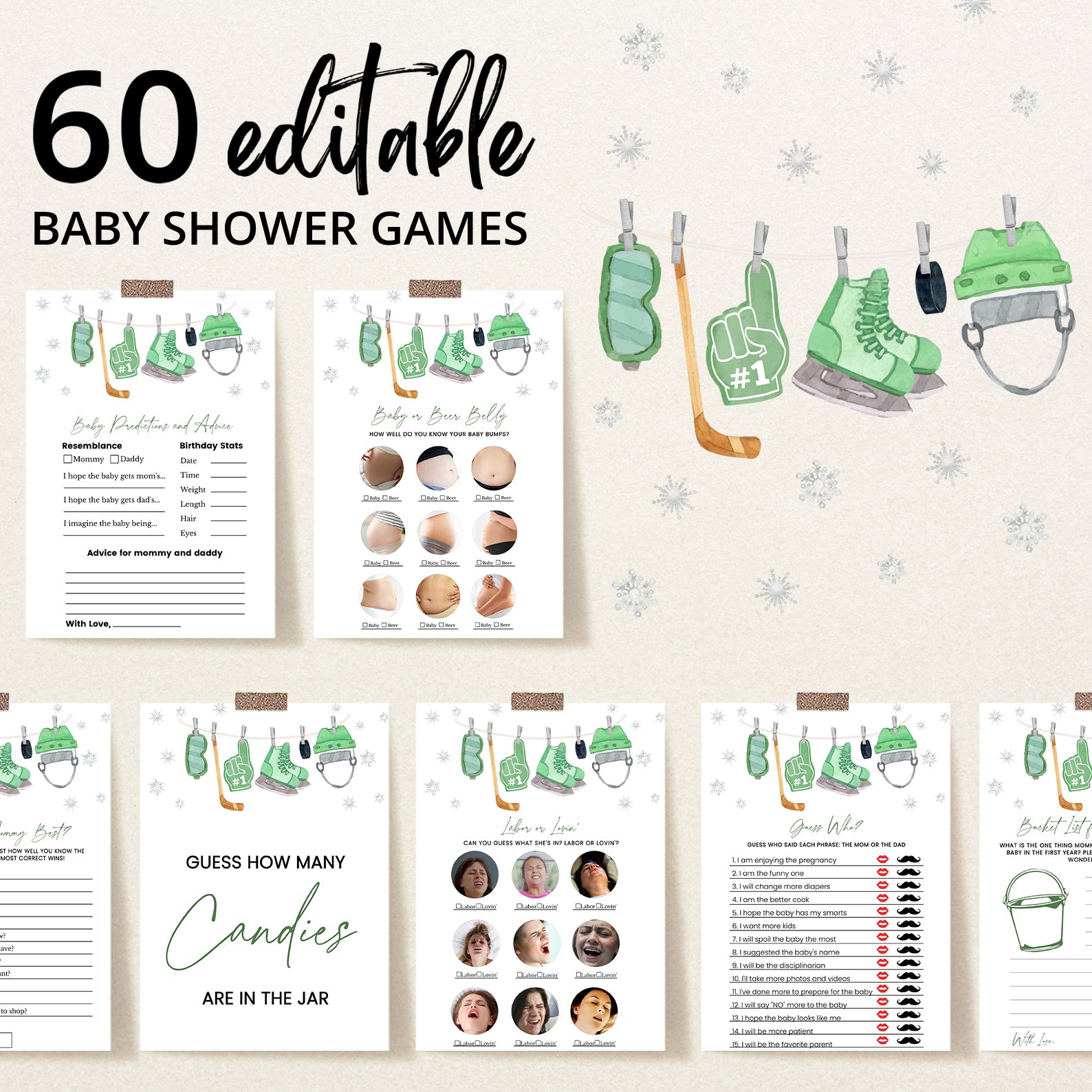 Keep guests entertained with this 60-game editable baby shower bundle, styled in a playful green hockey theme with winter snowflakes and sports gear accents. Each game is fully customizable and designed to match your décor, from trivia to icebreakers. Perfect for hockey-loving families, this set adds fun, laughter, and a sporty twist to your winter baby shower celebration.