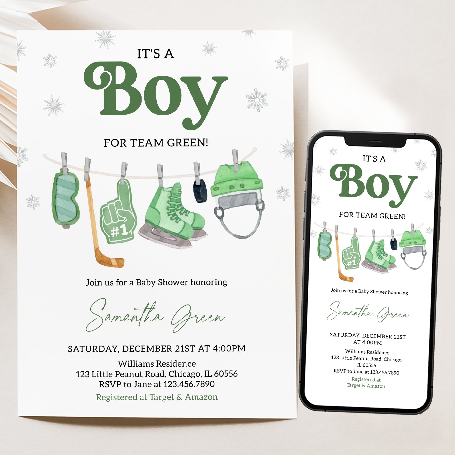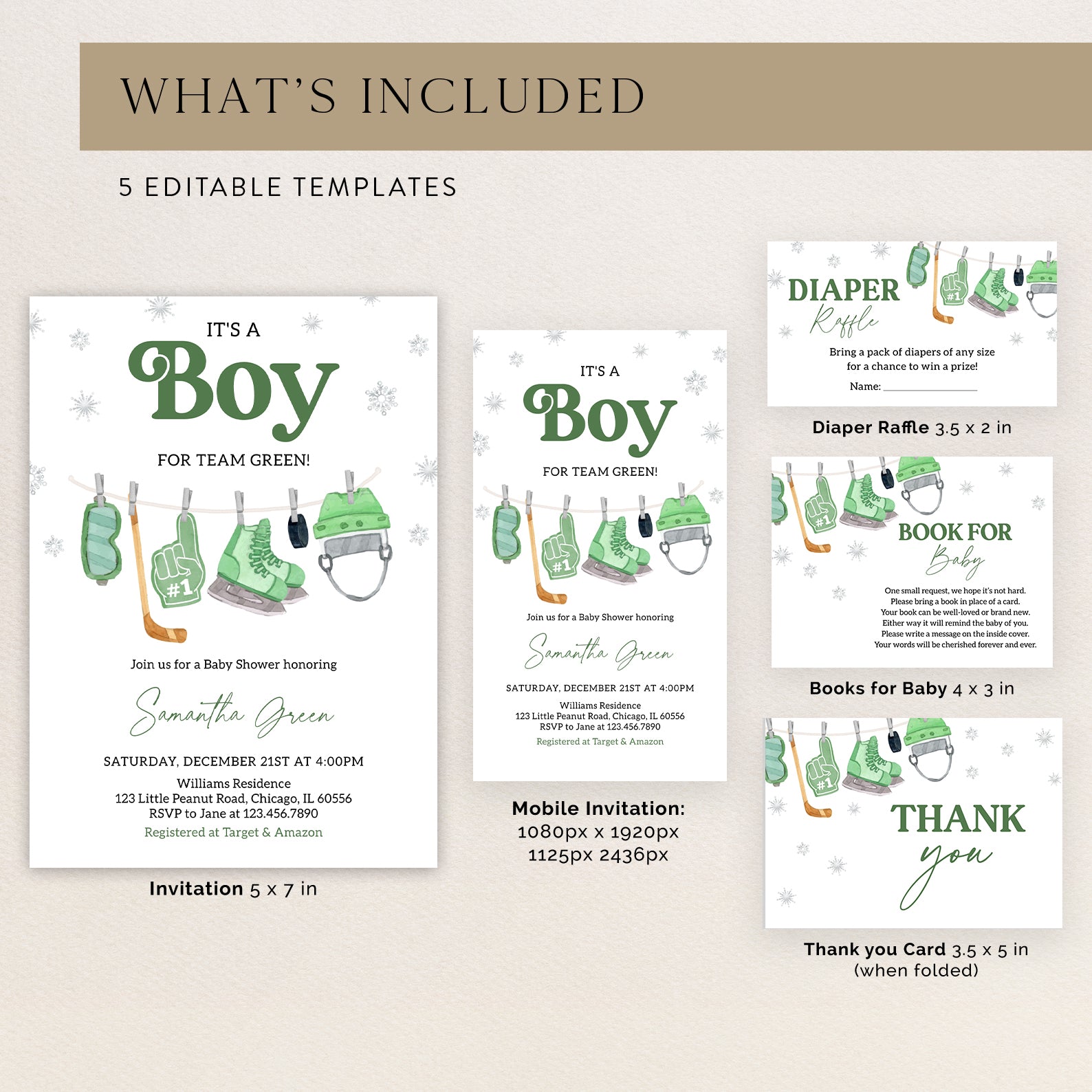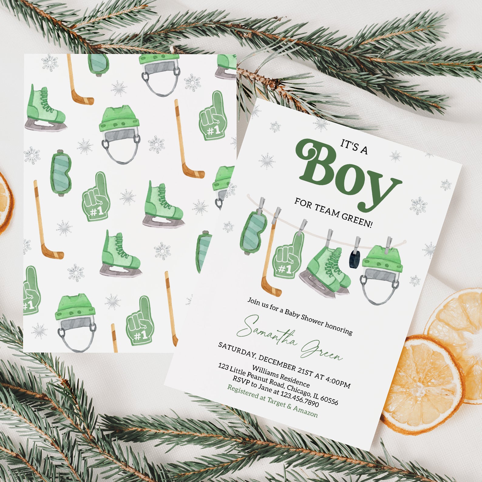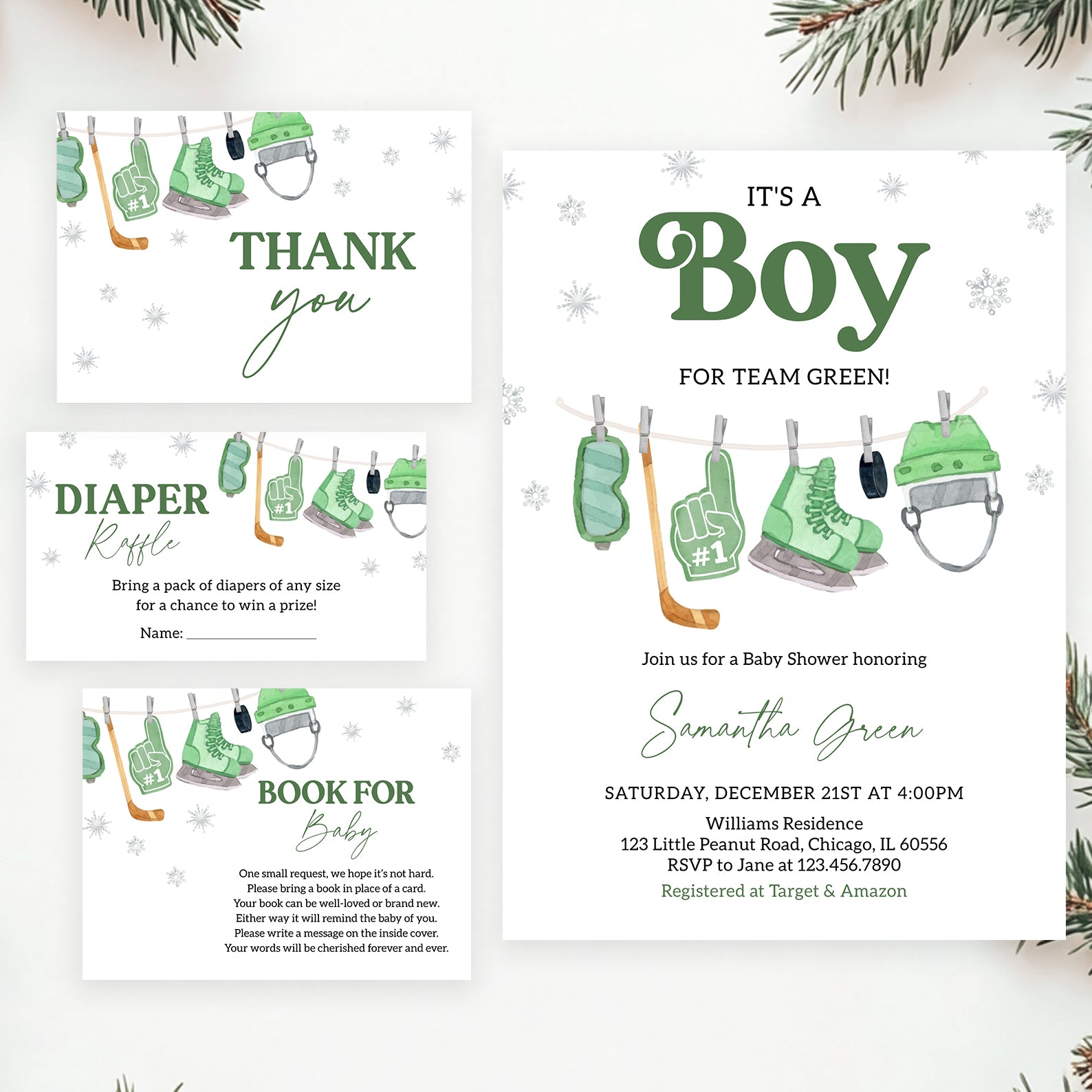 - Purchase this It's a Boy Winter Baby Shower Invite Bundle – Green Hockey Theme template