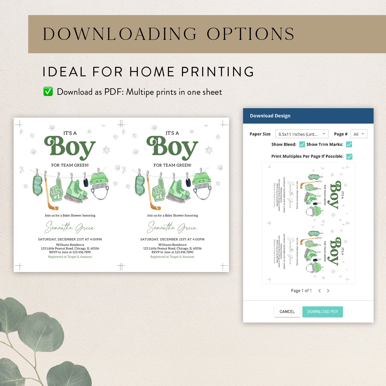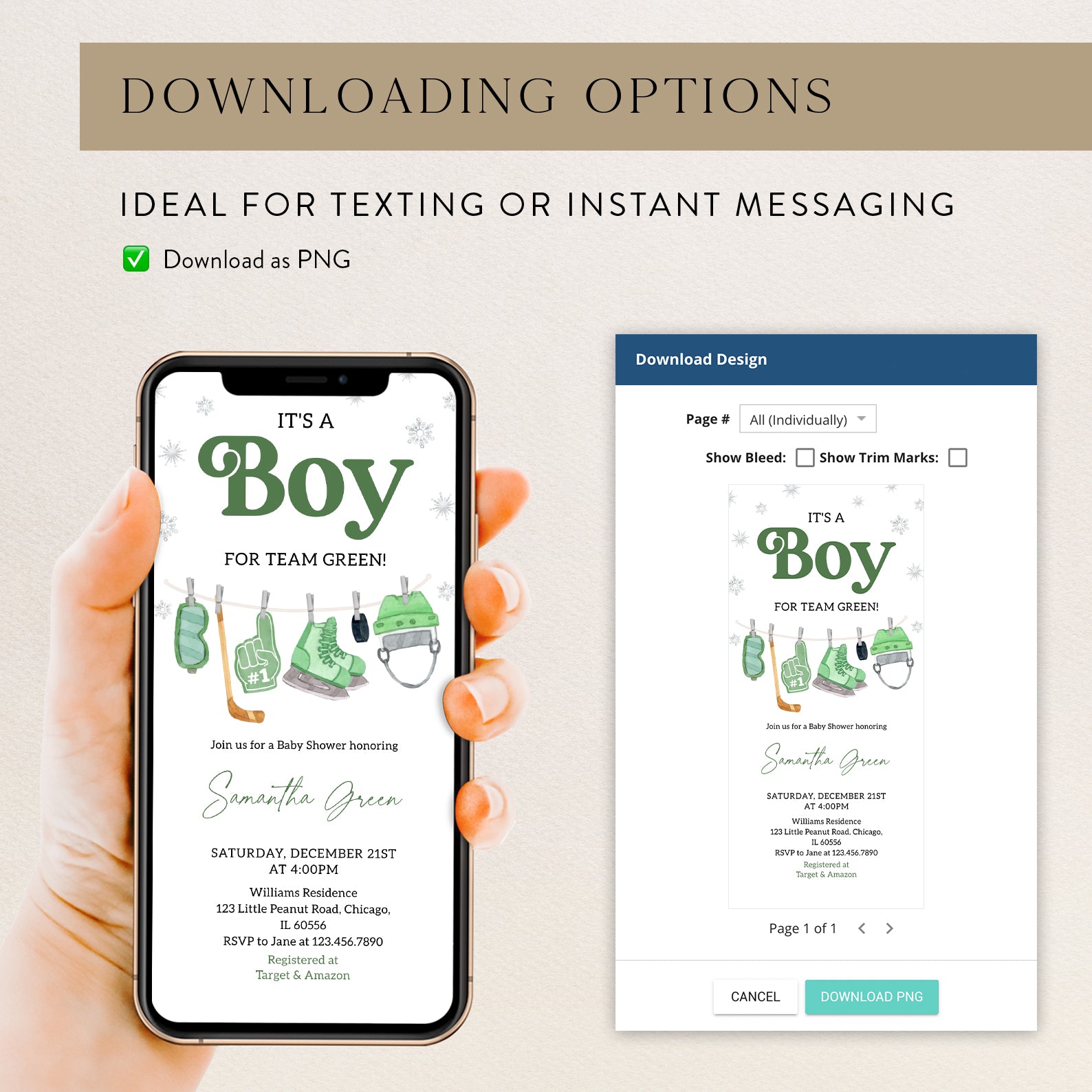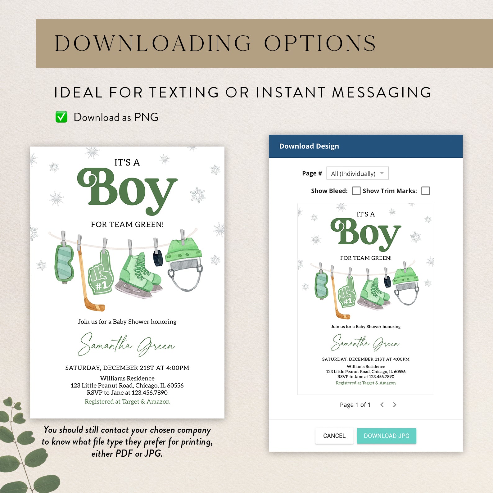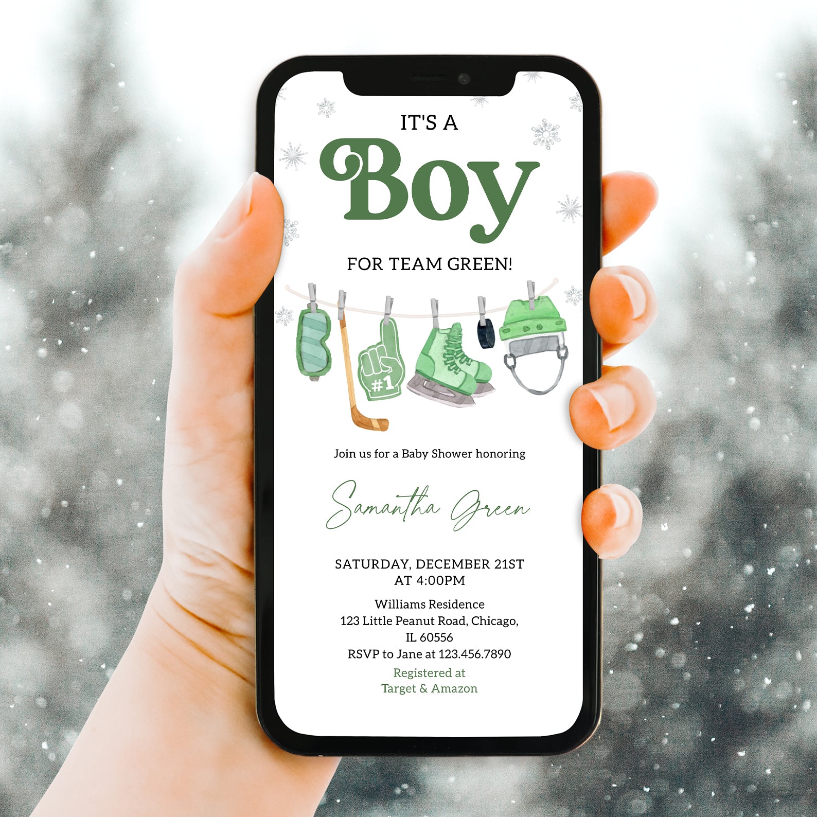 - Purchase this It's a Boy Winter Baby Shower Invite Bundle – Green Hockey Theme template