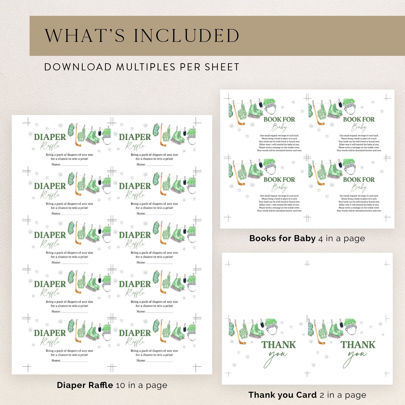Welcome your little one with our winter baby shower invitation bundle in a playful green hockey theme! Featuring snowflakes and classic hockey gear—like goggles, skates, and a hockey stick—this cozy design is perfect for hockey-loving families. This bundle includes a full set: invitation, mobile invitation, diaper raffle, books-for-baby card, and thank you card. Perfect for a warm winter celebration!