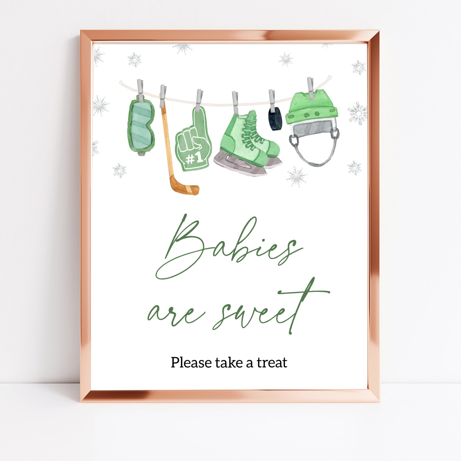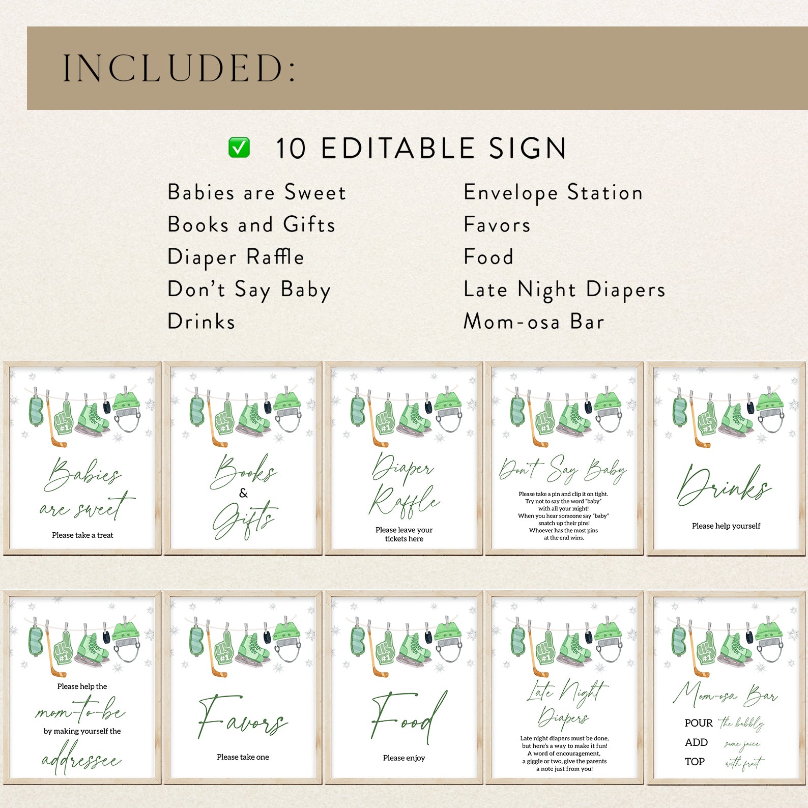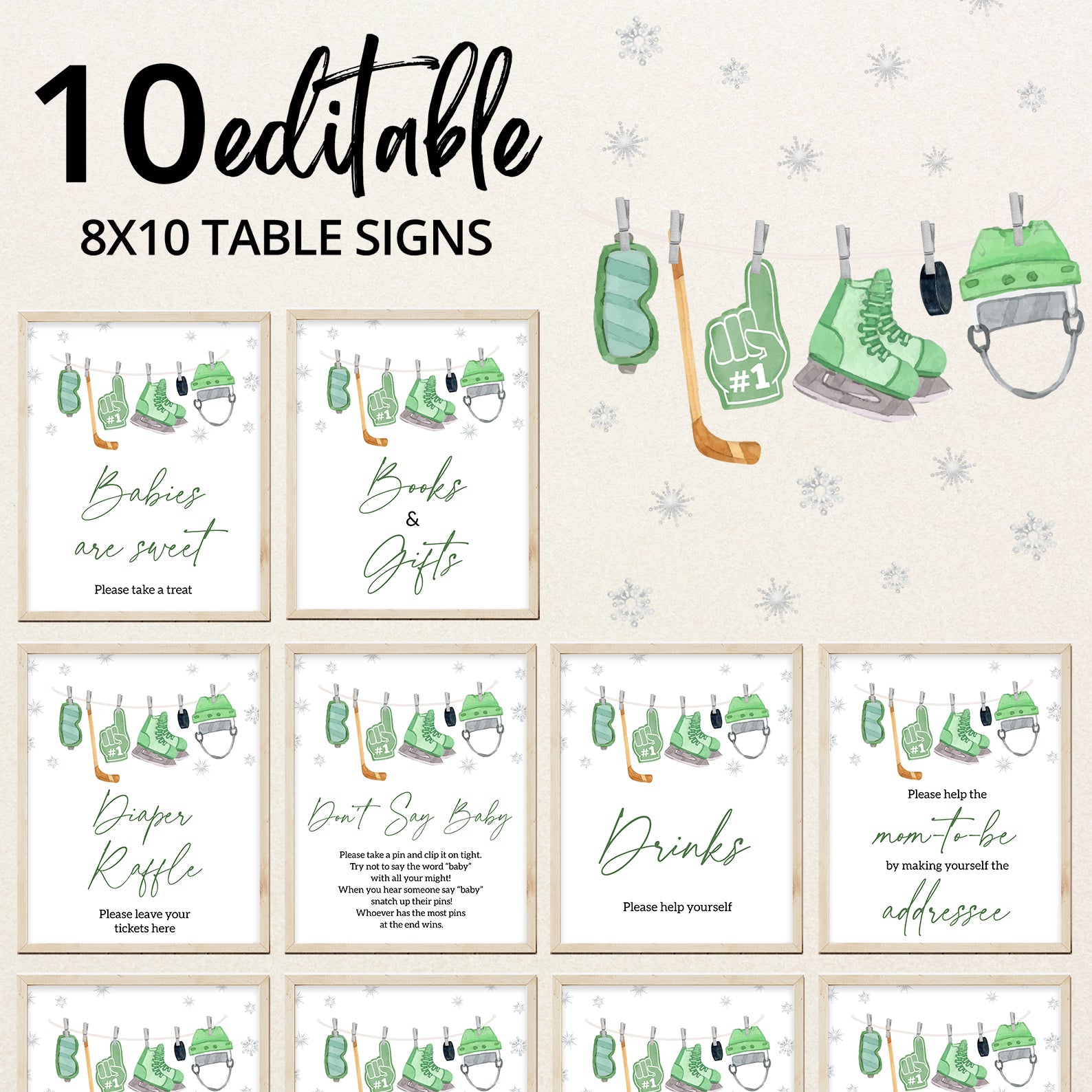 Score style points at your winter baby shower with this set of 10 editable table signs, featuring a fun green hockey theme with playful snowflakes and sports gear like sticks, skates, helmets, gloves, and pucks. Includes Babies Are Sweet, Books and Gifts, Diaper Raffle, Don’t Say Baby, Drinks, Envelope Station, Favors, Food, Late Night Diapers, and Mom-osa Bar. Perfect for a sporty, cozy, and coordinated celebration.