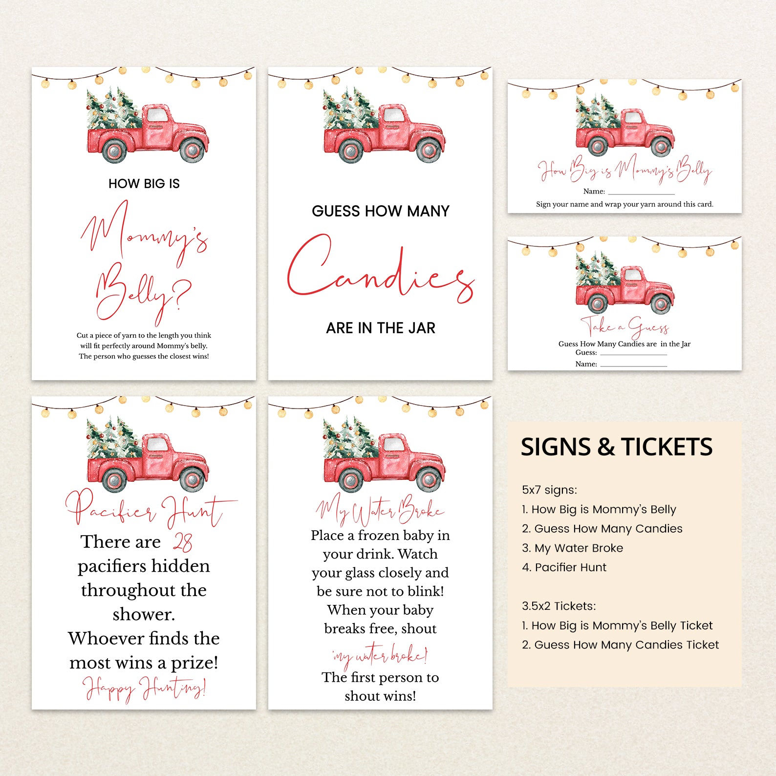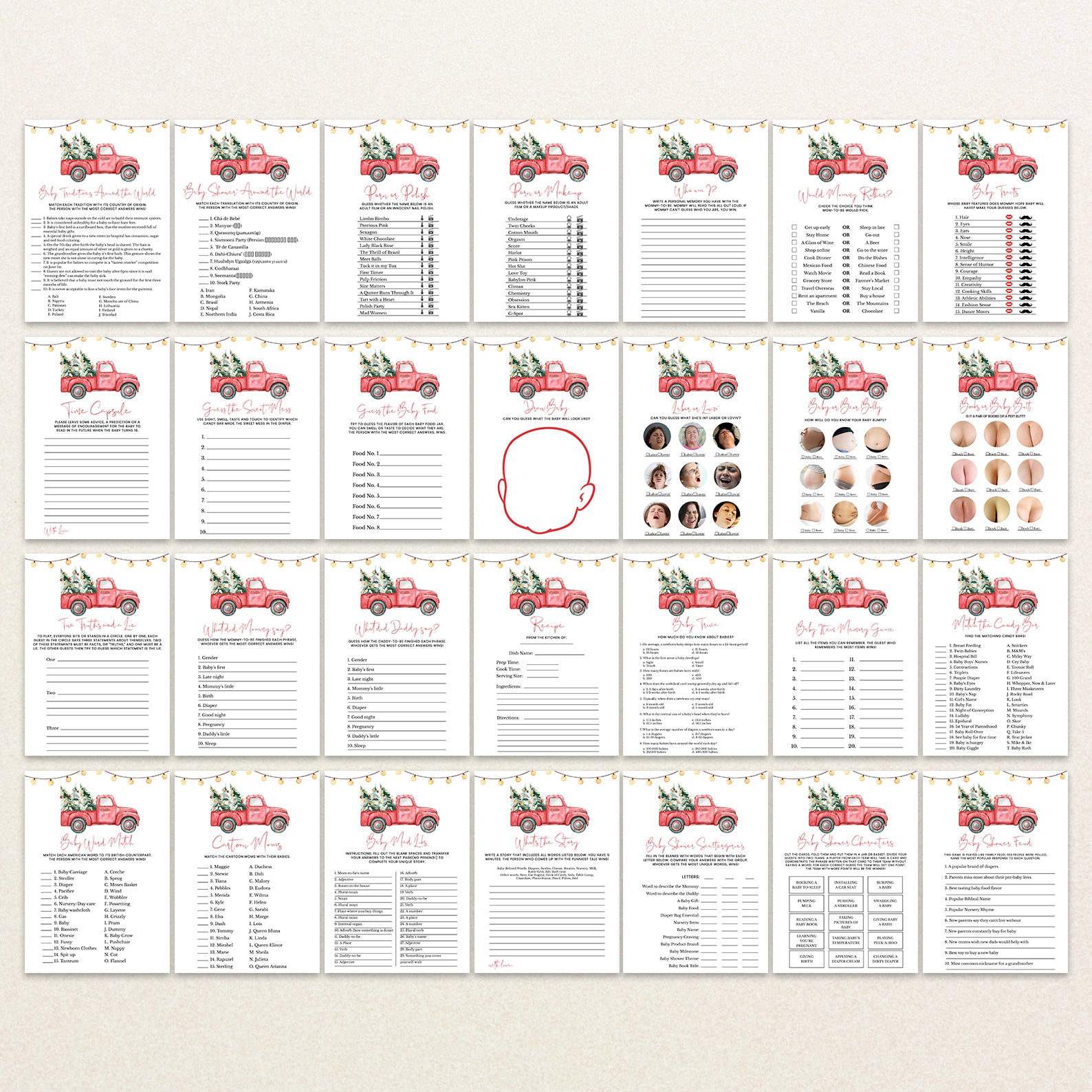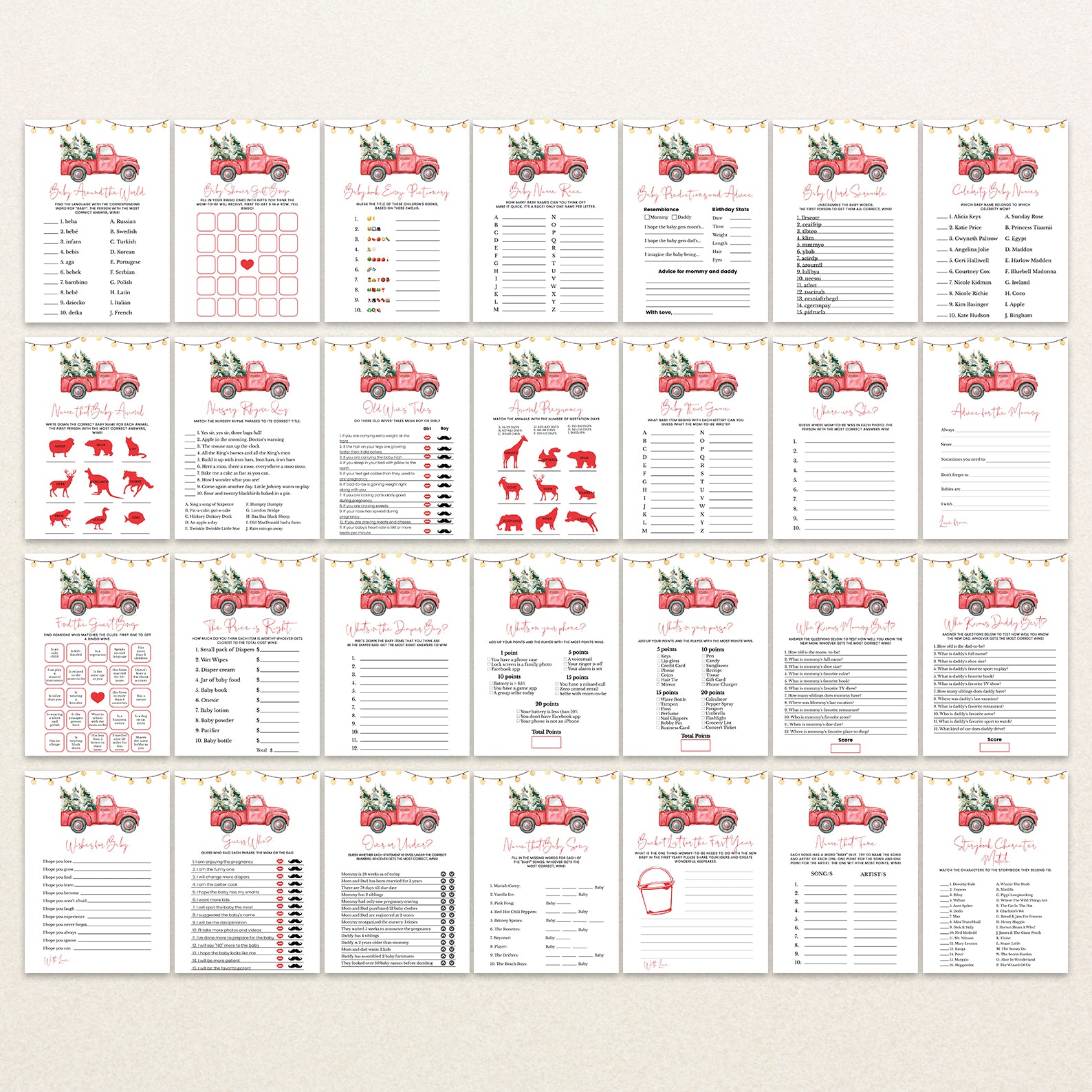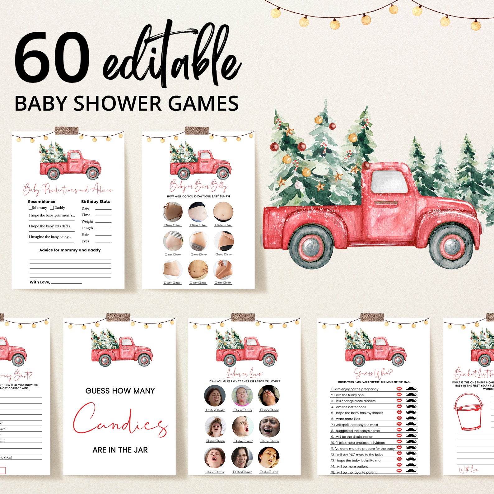 Keep guests entertained with our 60 editable baby shower games, designed with festive hanging light bulbs and a cheerful red pickup truck topped with a Christmas tree. From fun icebreakers to engaging challenges, each printable matches your winter theme perfectly, making it easy to host a lively and coordinated celebration.