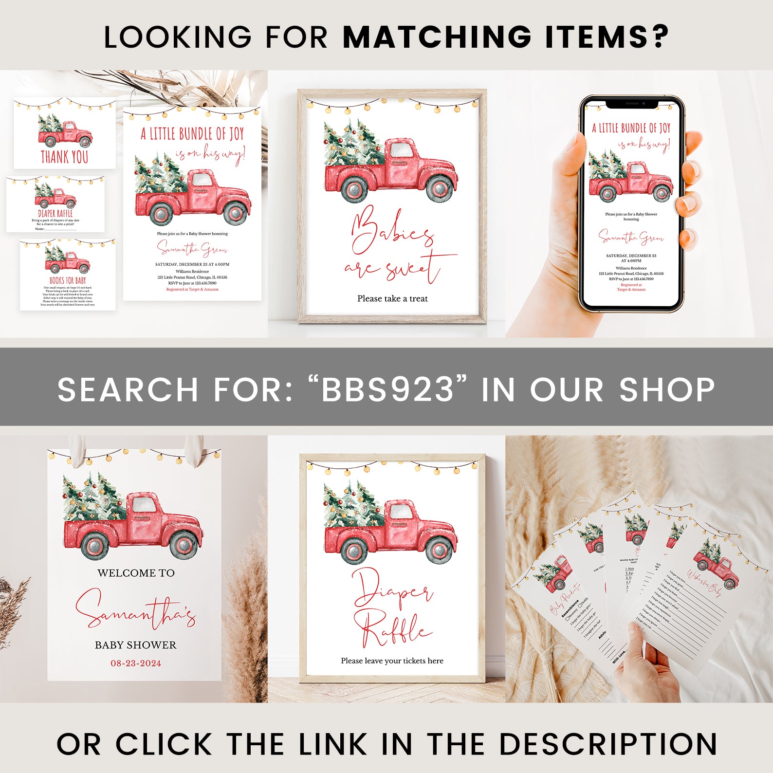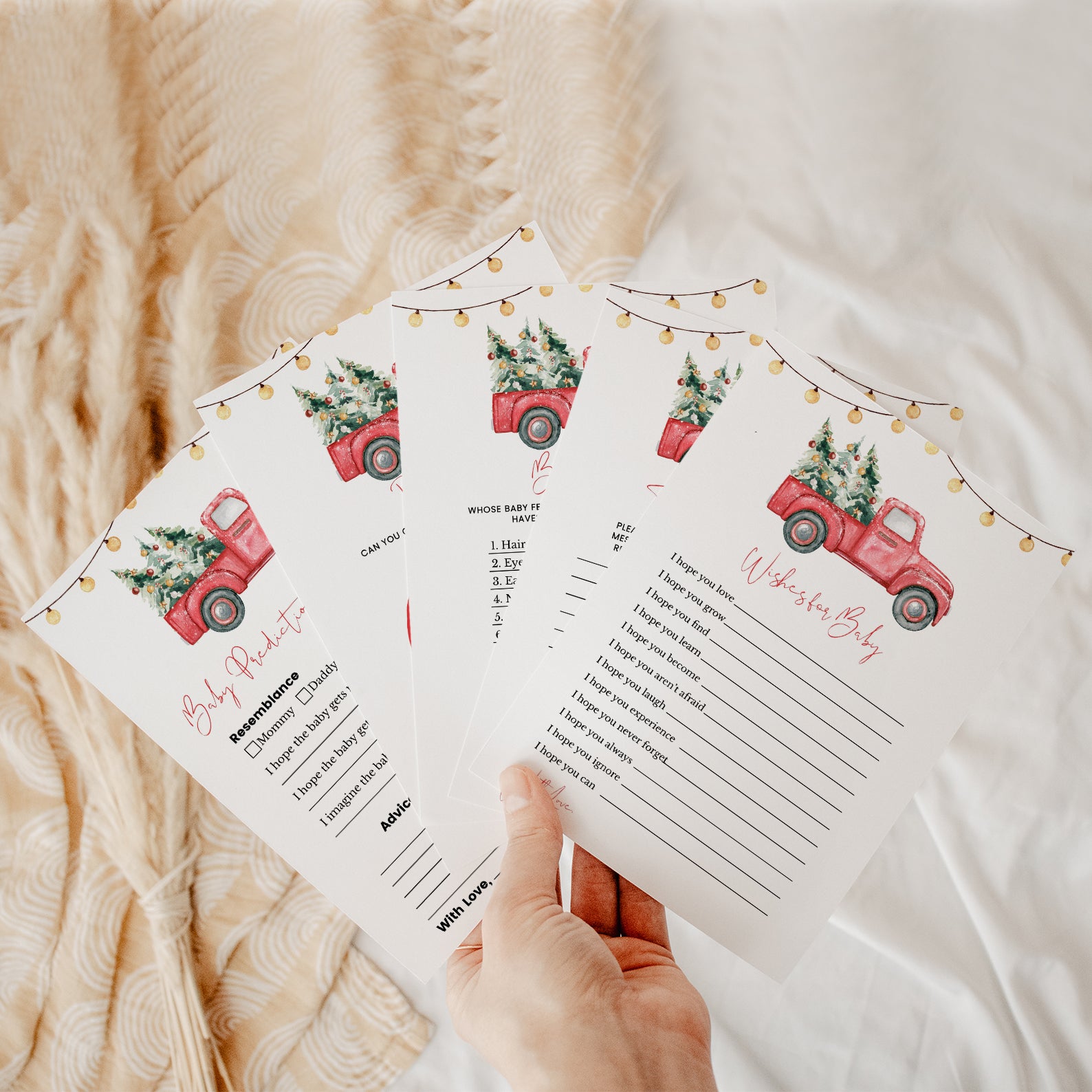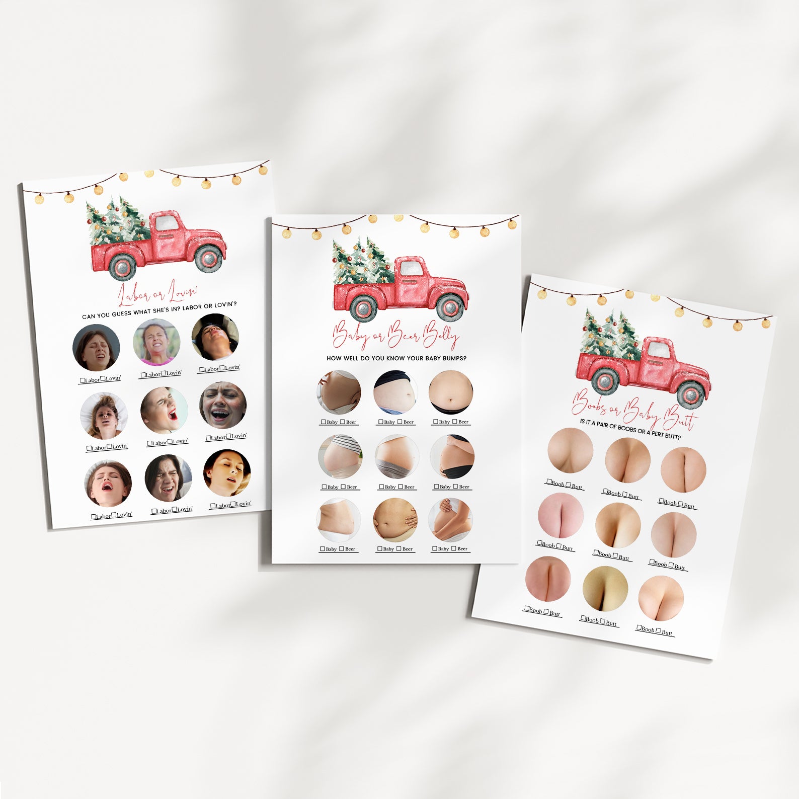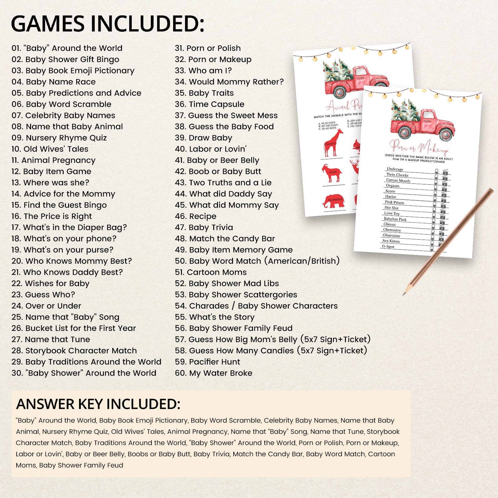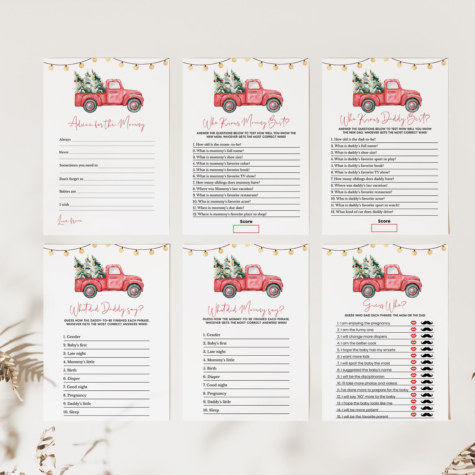 Keep guests entertained with our 60 editable baby shower games, designed with festive hanging light bulbs and a cheerful red pickup truck topped with a Christmas tree. From fun icebreakers to engaging challenges, each printable matches your winter theme perfectly, making it easy to host a lively and coordinated celebration.