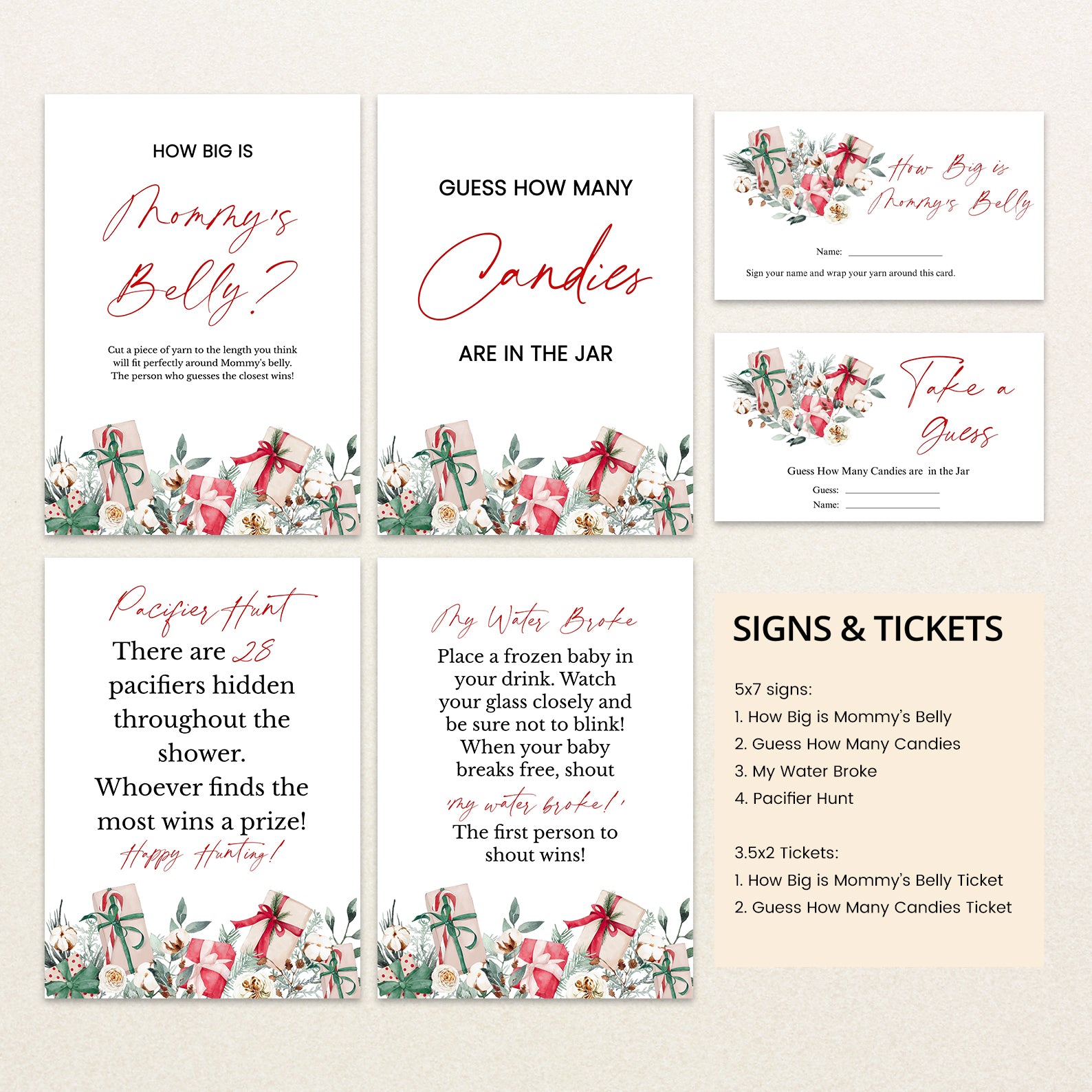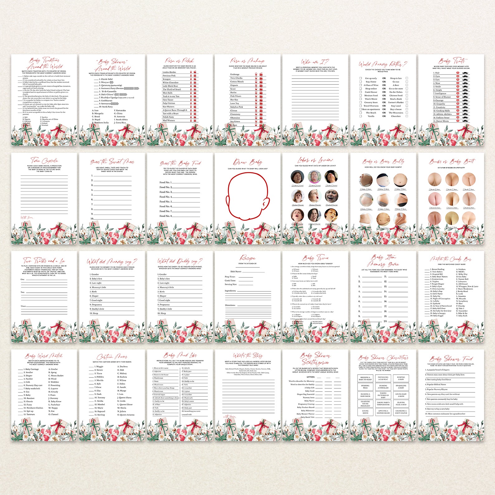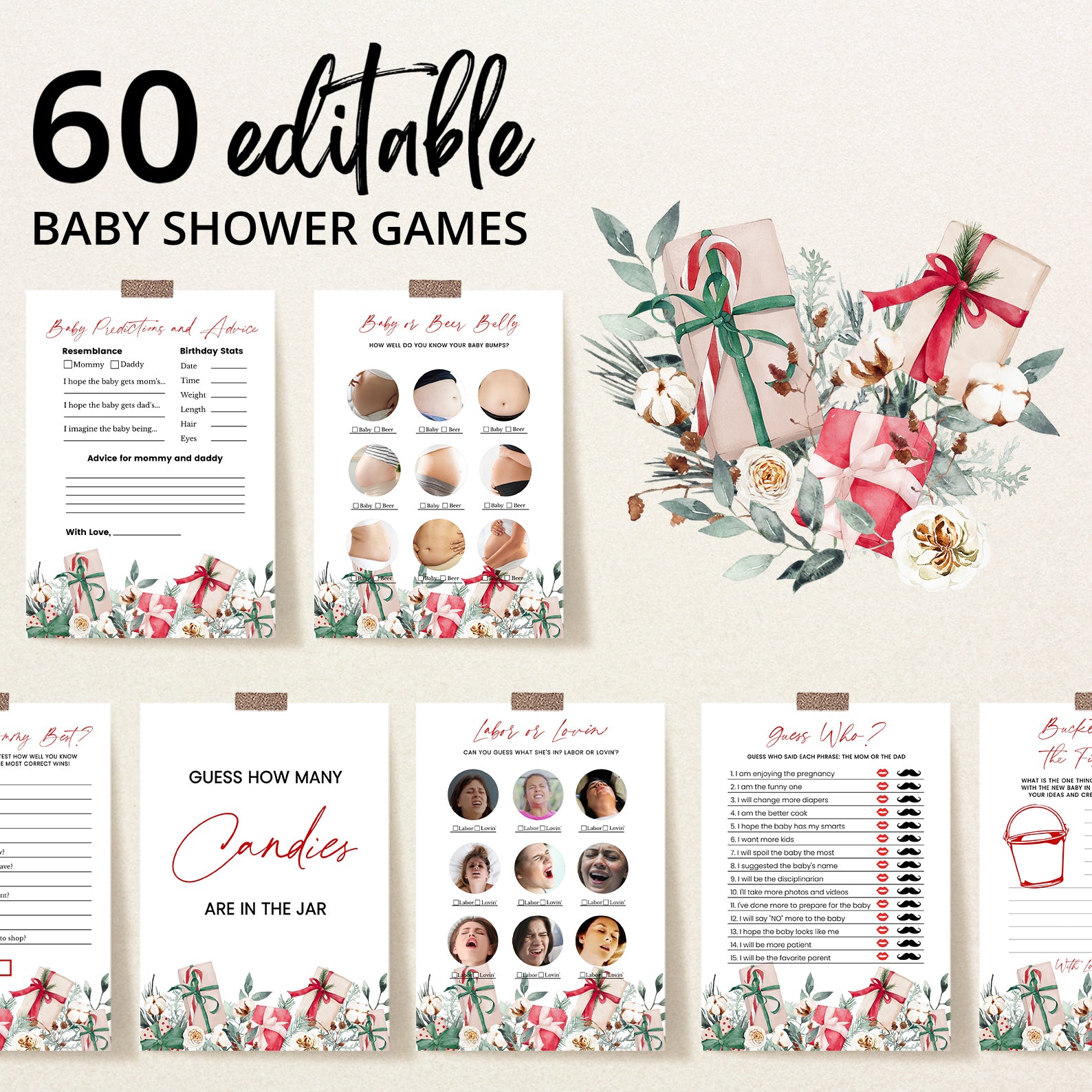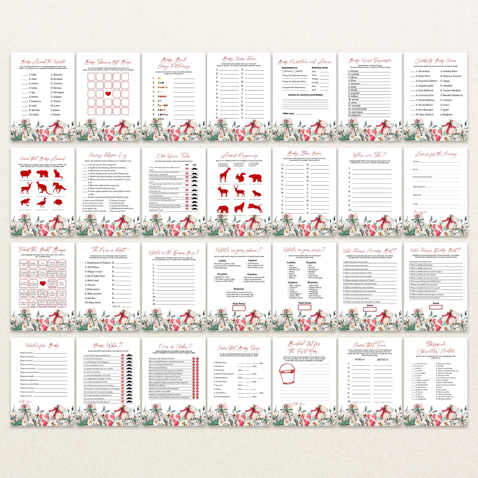 Keep your guests entertained with this 60-game editable baby shower bundle, styled with delicate winter florals and festive Christmas gifts. Each game is fully customizable, offering a mix of fun challenges and classic activities to keep the celebration lively. Designed to match your seasonal décor, this bundle adds charm, joy, and a coordinated look to your holiday-themed baby shower.