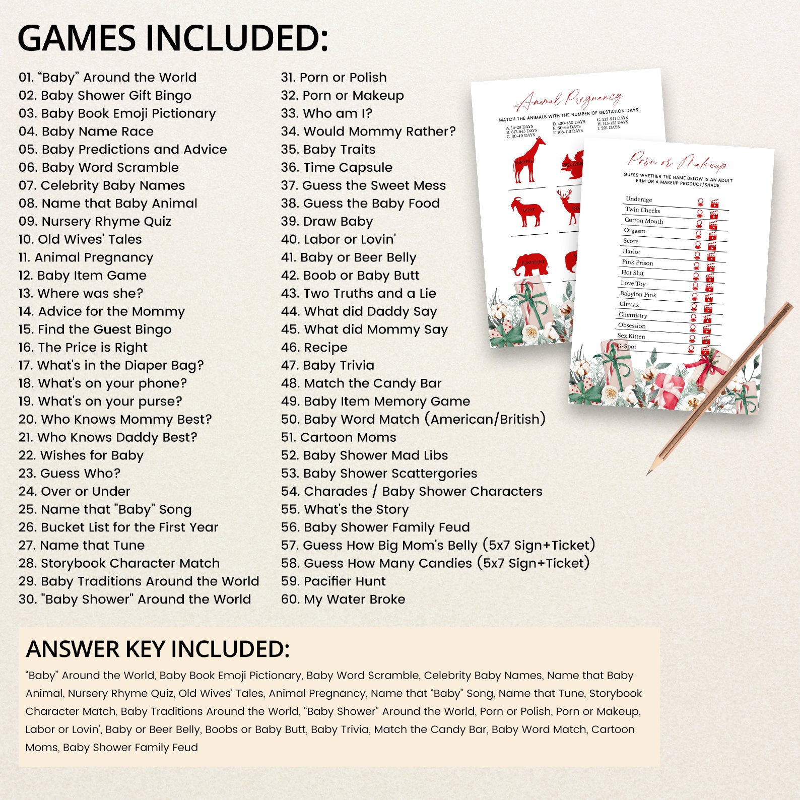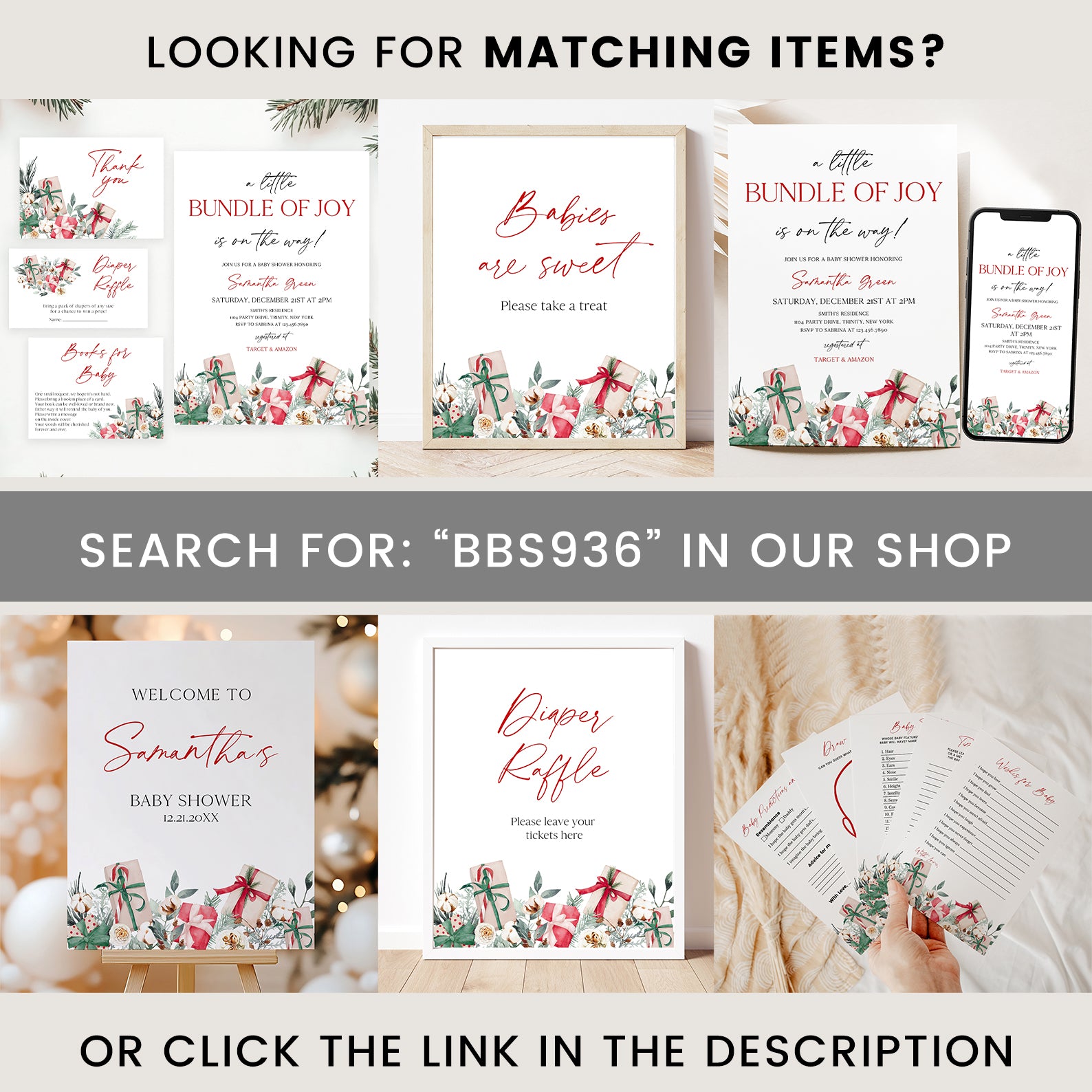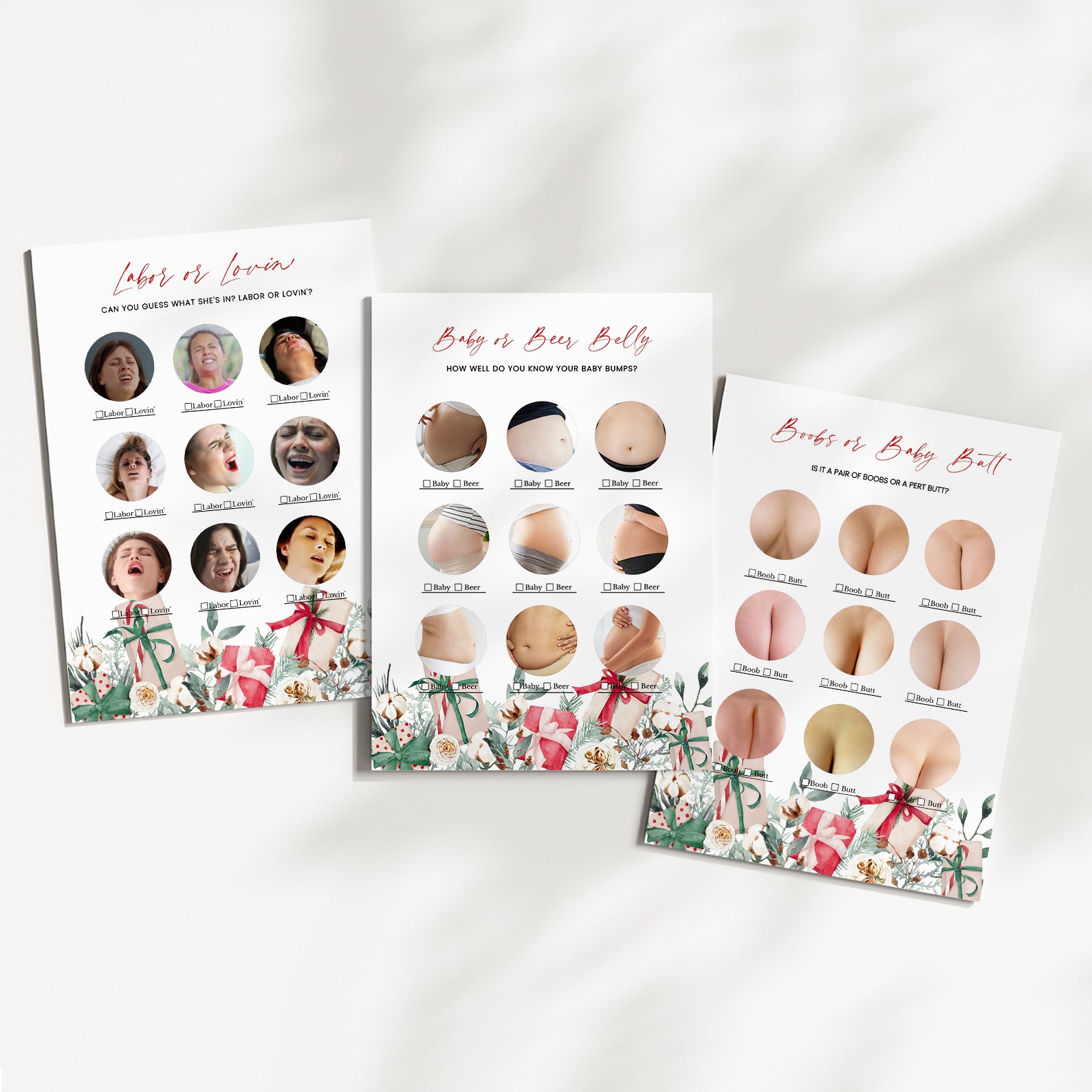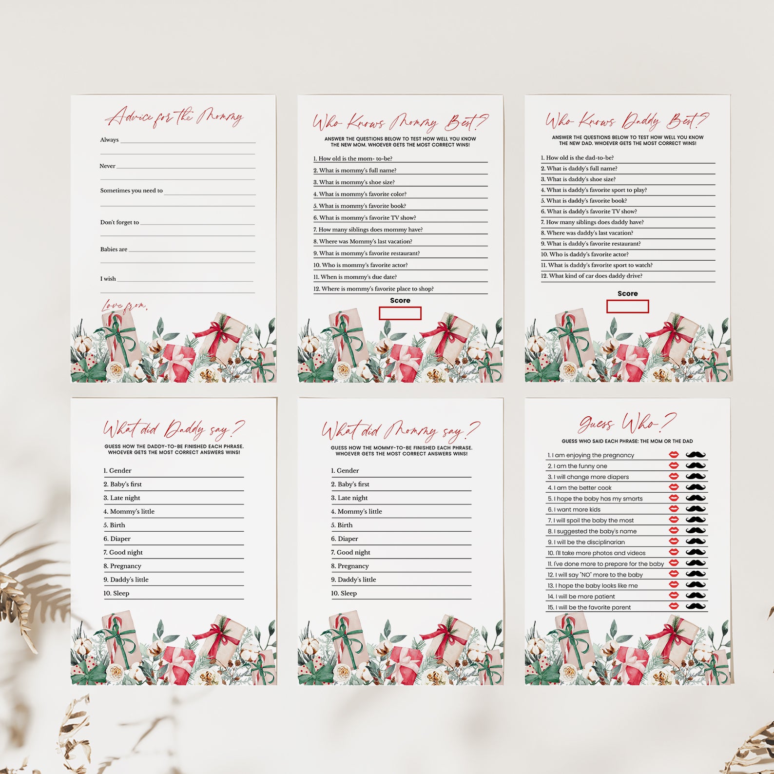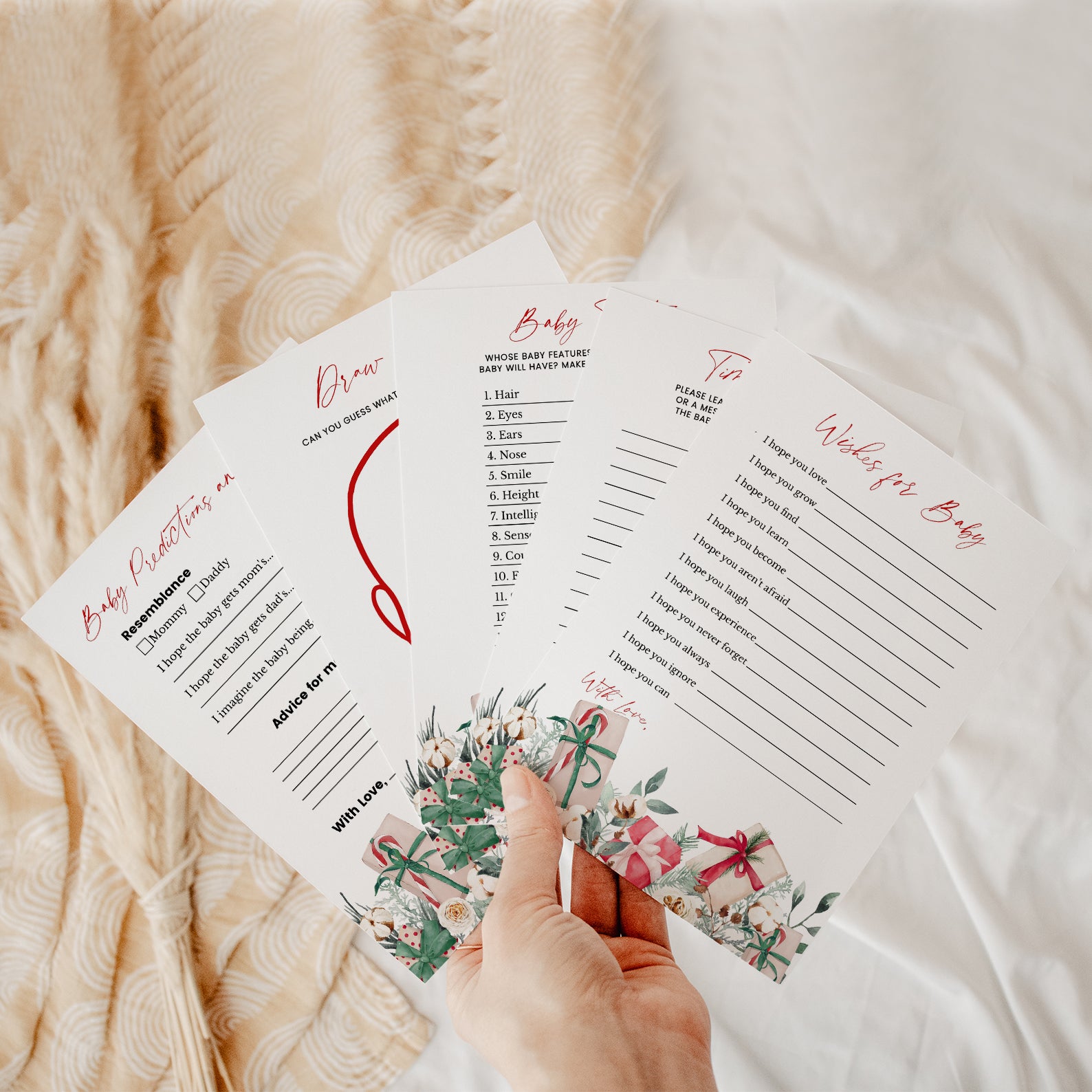 Keep your guests entertained with this 60-game editable baby shower bundle, styled with delicate winter florals and festive Christmas gifts. Each game is fully customizable, offering a mix of fun challenges and classic activities to keep the celebration lively. Designed to match your seasonal décor, this bundle adds charm, joy, and a coordinated look to your holiday-themed baby shower.