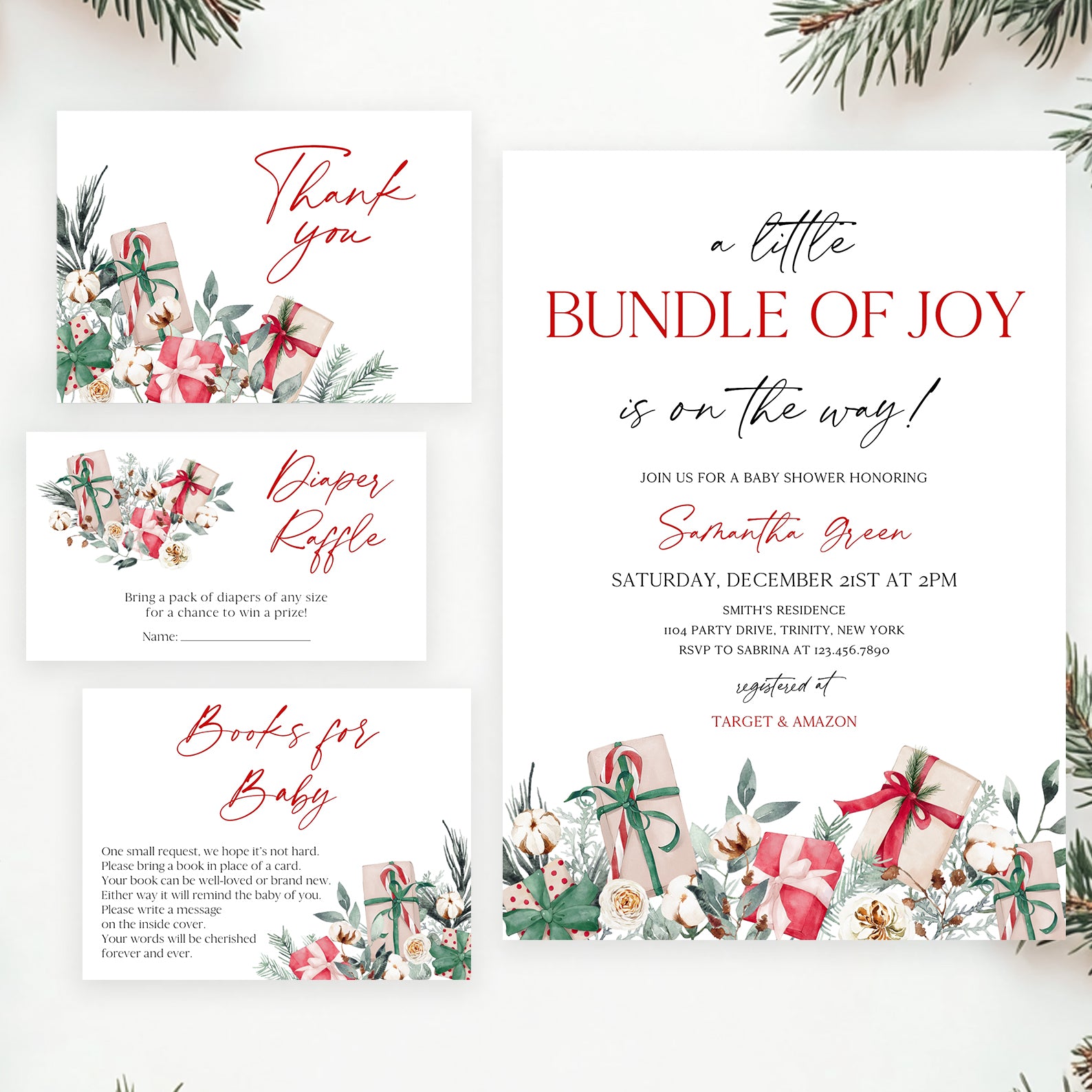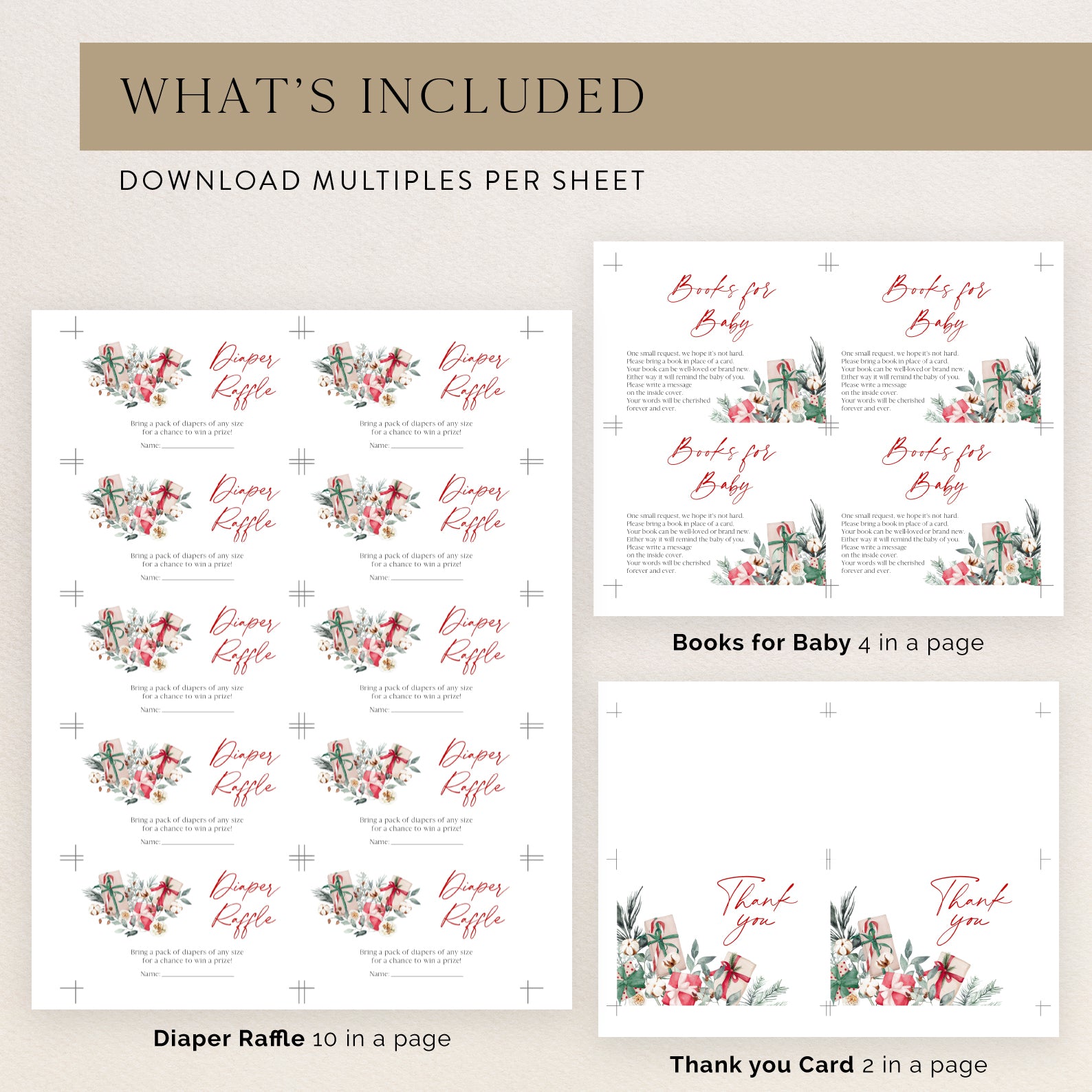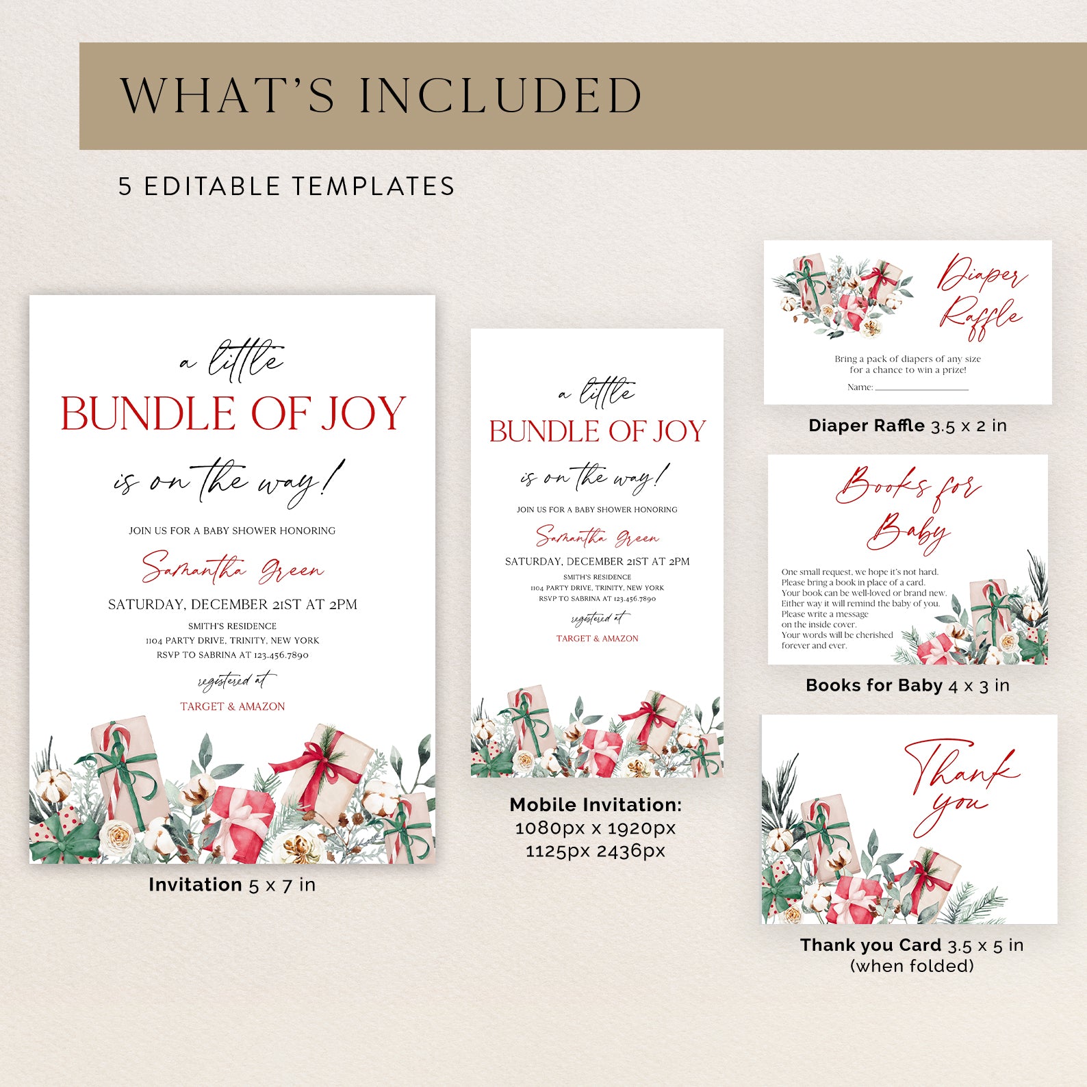 Welcome the arrival of your little one with our winter baby shower invitation bundle! This charming set includes an invitation, mobile invite, diaper raffle, books for baby cards, and thank you cards, all featuring delightful Christmas gifts and elegant florals. Easy to customize and share, it creates a festive atmosphere for your special celebration.