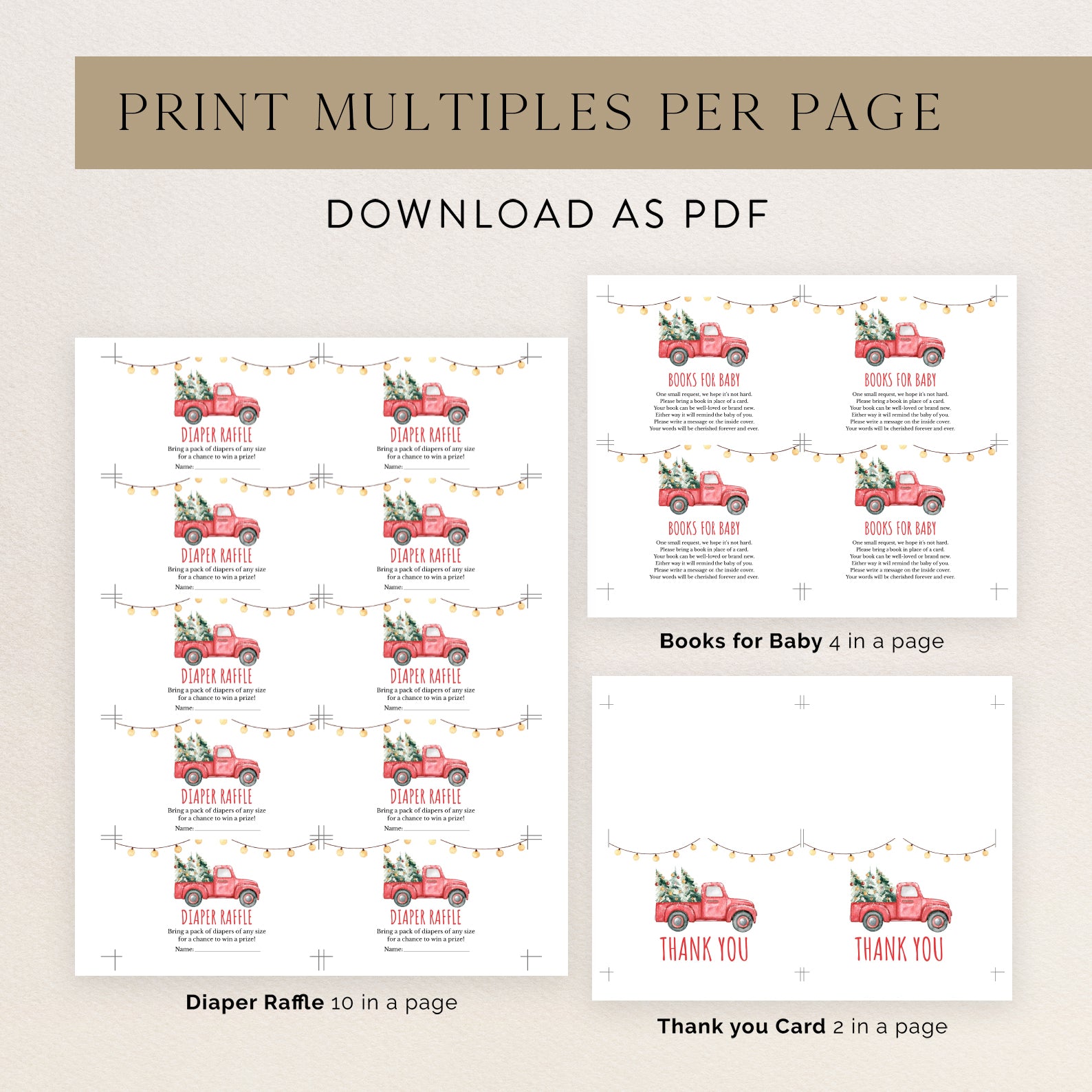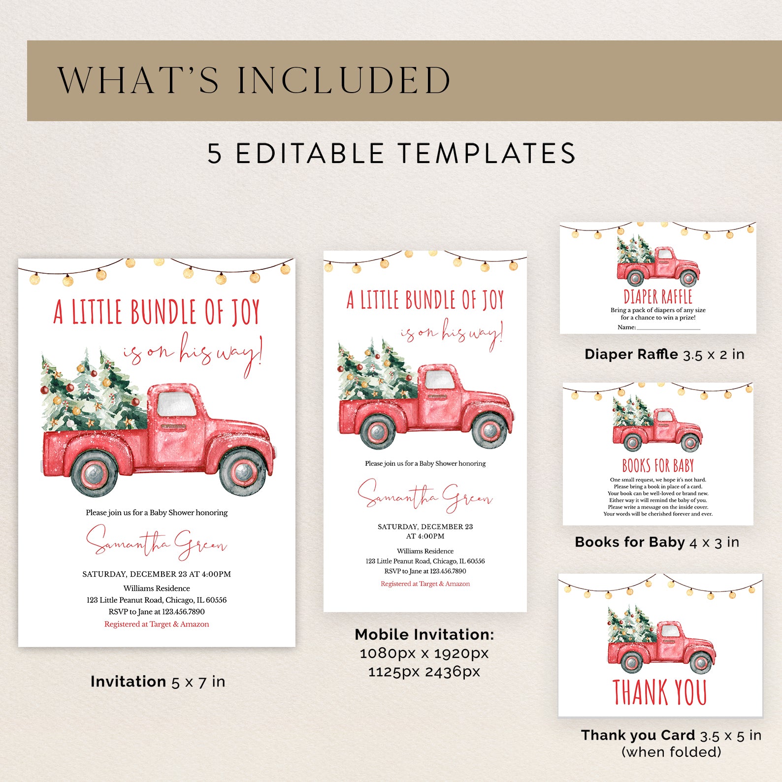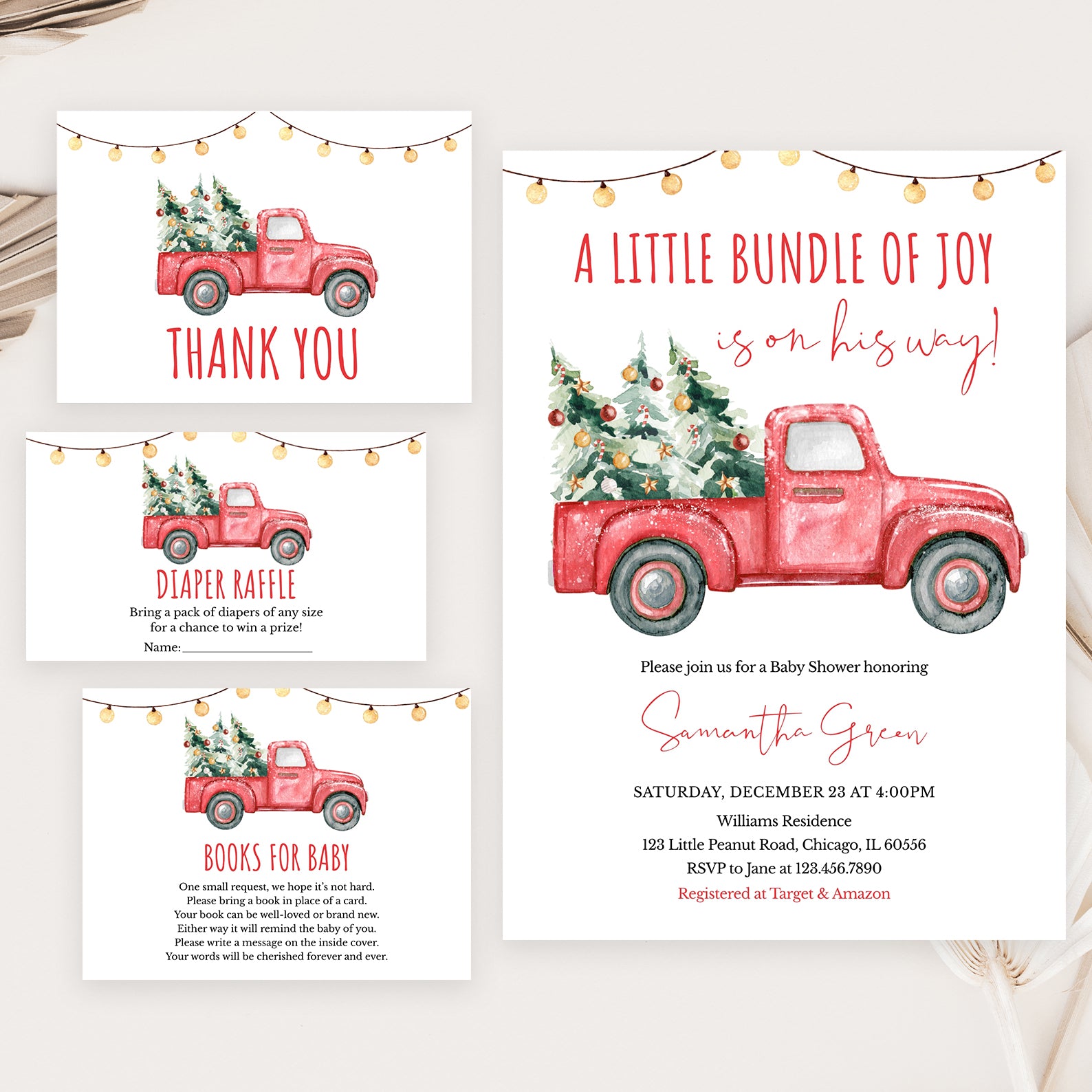 Announce your little one’s arrival with our winter baby shower bundle. This set includes a digital invitation, mobile invite, diaper raffle, books for baby cards, and thank you cards, featuring whimsical light bulbs and a red pickup truck with a Christmas tree. Perfect for a festive and joyful celebration.
