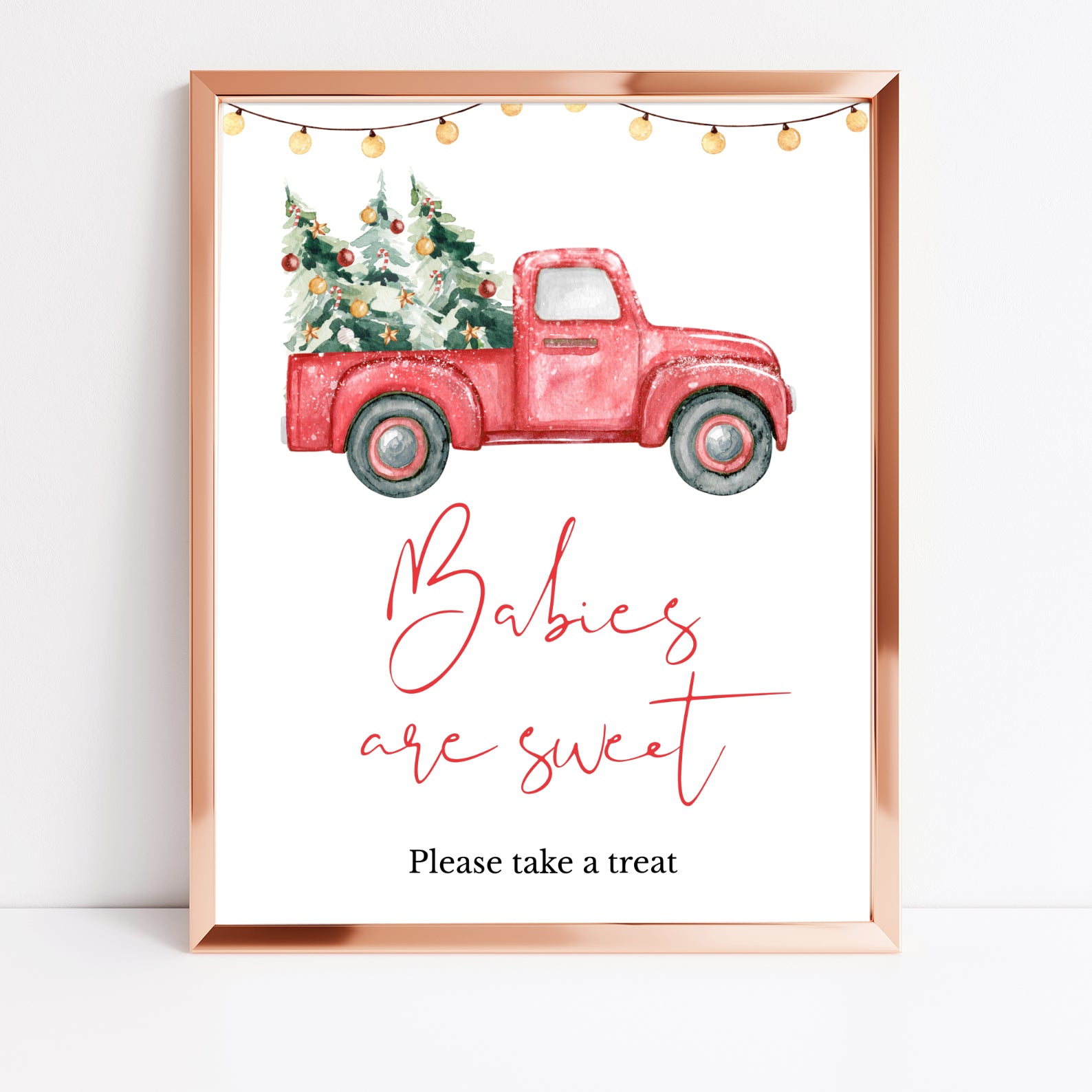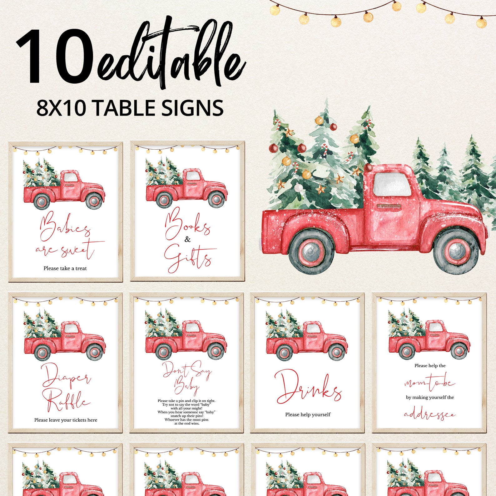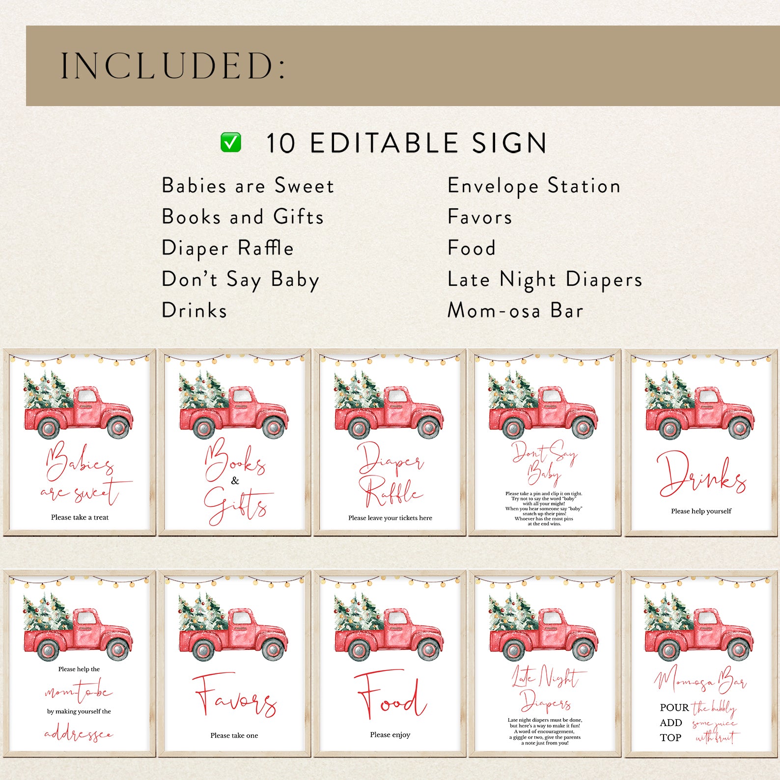 Brighten your winter celebration with our 10 editable baby shower table signs, featuring whimsical hanging light bulbs and a charming red pickup truck carrying a Christmas tree. This coordinated set includes Babies Are Sweet, Books and Gifts, Diaper Raffle, Don’t Say Baby, Drinks, Envelope Station, Favors, Food, Late Night Diapers, and Mom-osa Bar. Perfect for adding festive charm and style to your seasonal décor.