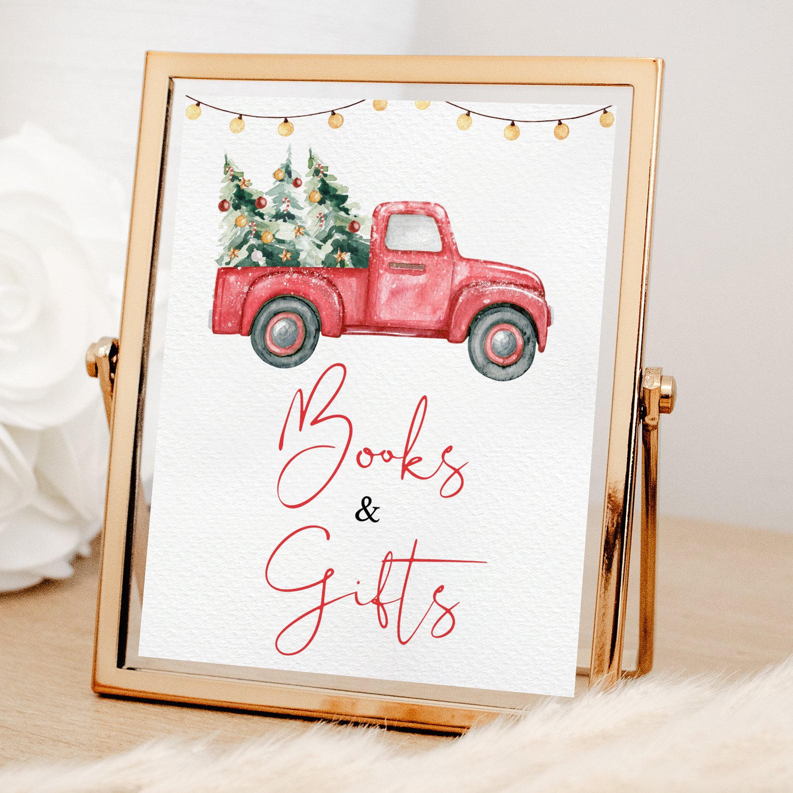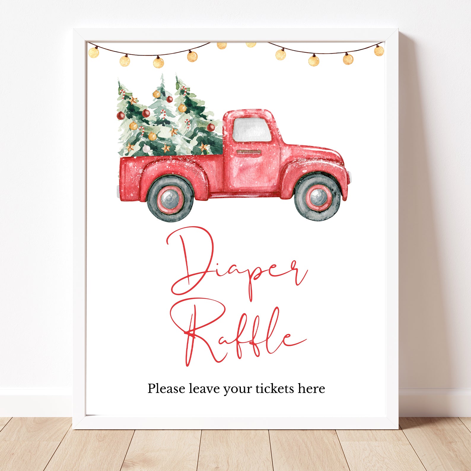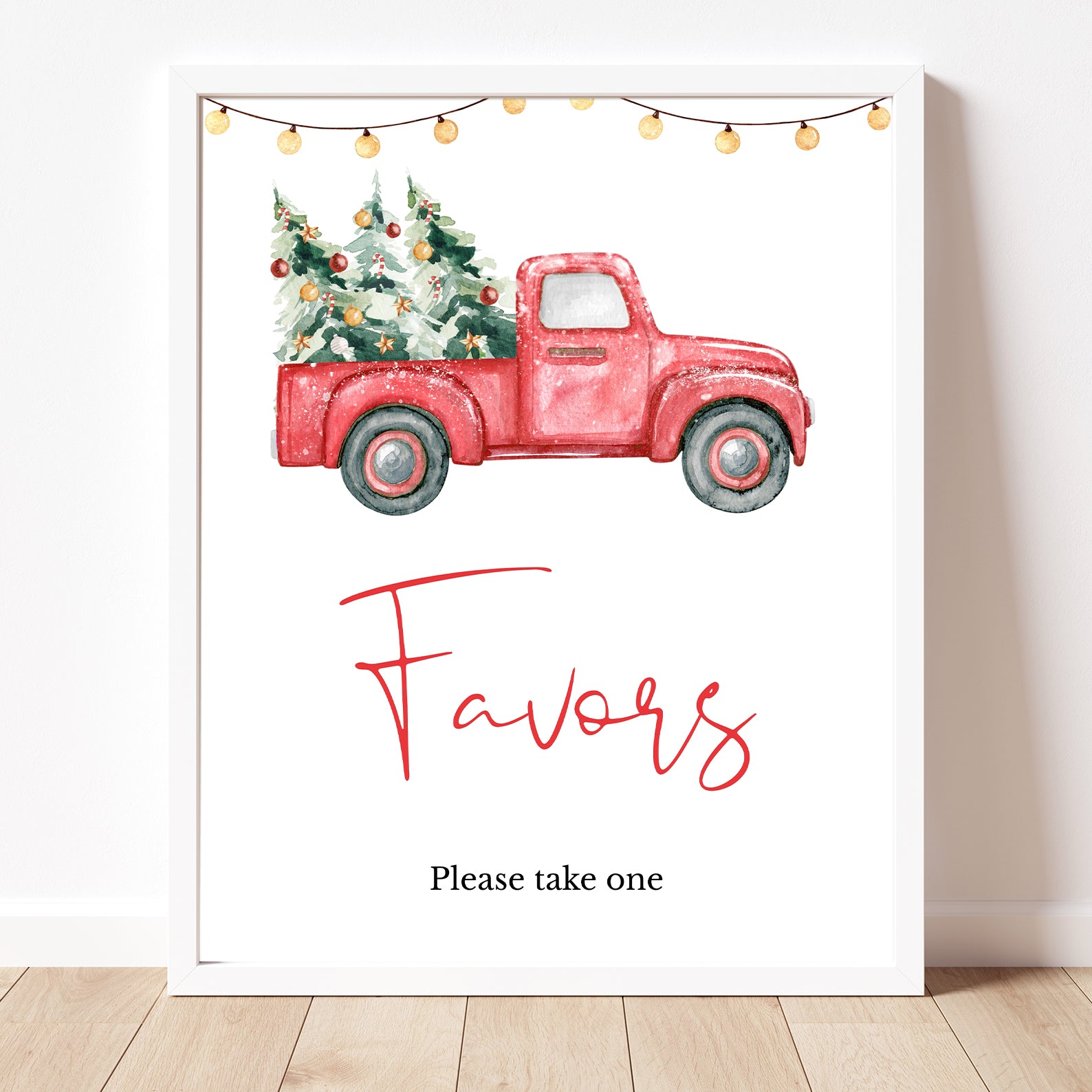 Brighten your winter celebration with our 10 editable baby shower table signs, featuring whimsical hanging light bulbs and a charming red pickup truck carrying a Christmas tree. This coordinated set includes Babies Are Sweet, Books and Gifts, Diaper Raffle, Don’t Say Baby, Drinks, Envelope Station, Favors, Food, Late Night Diapers, and Mom-osa Bar. Perfect for adding festive charm and style to your seasonal décor.