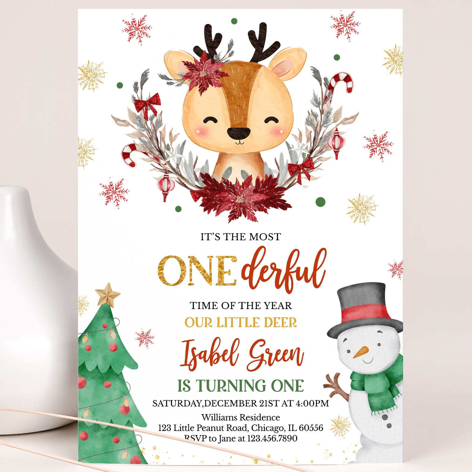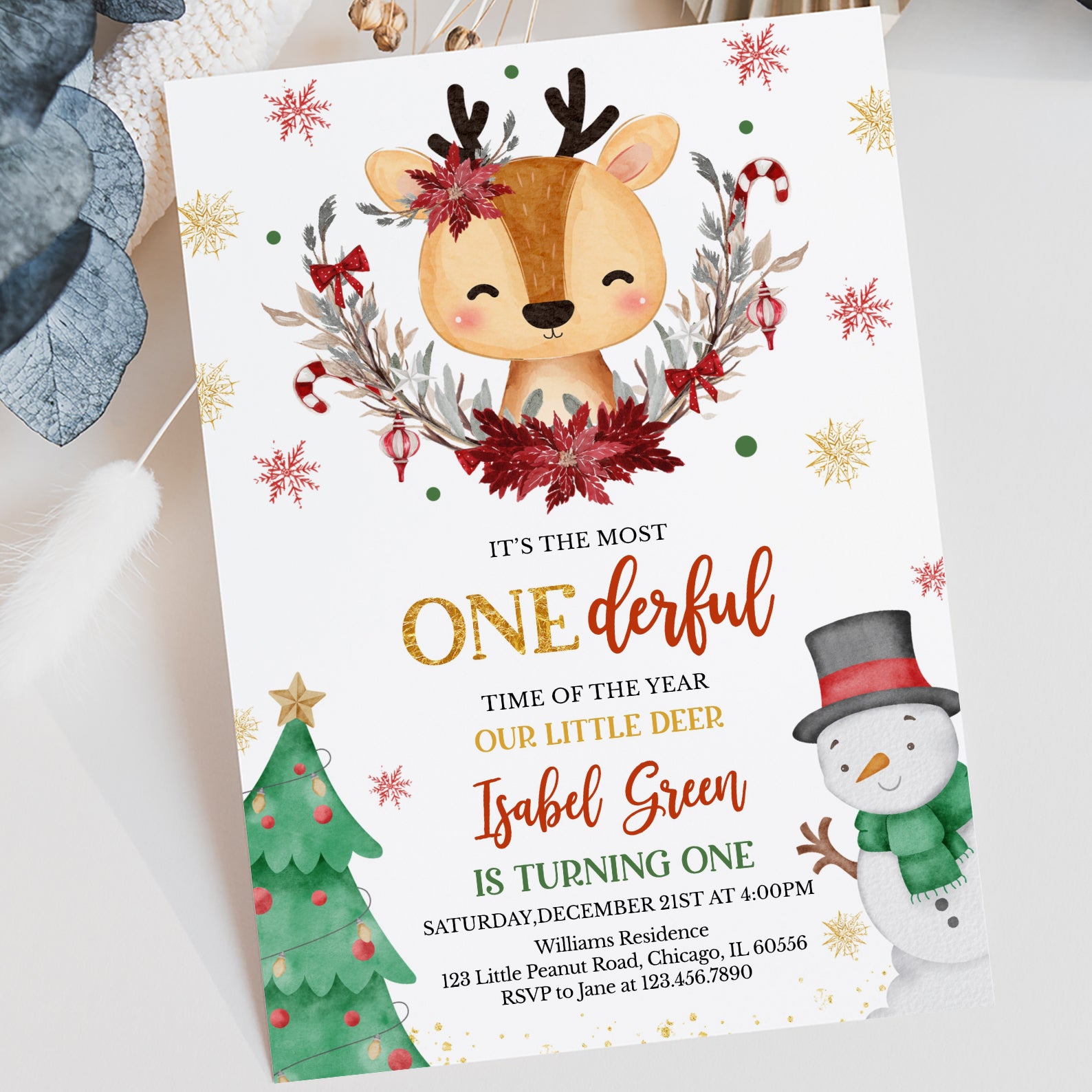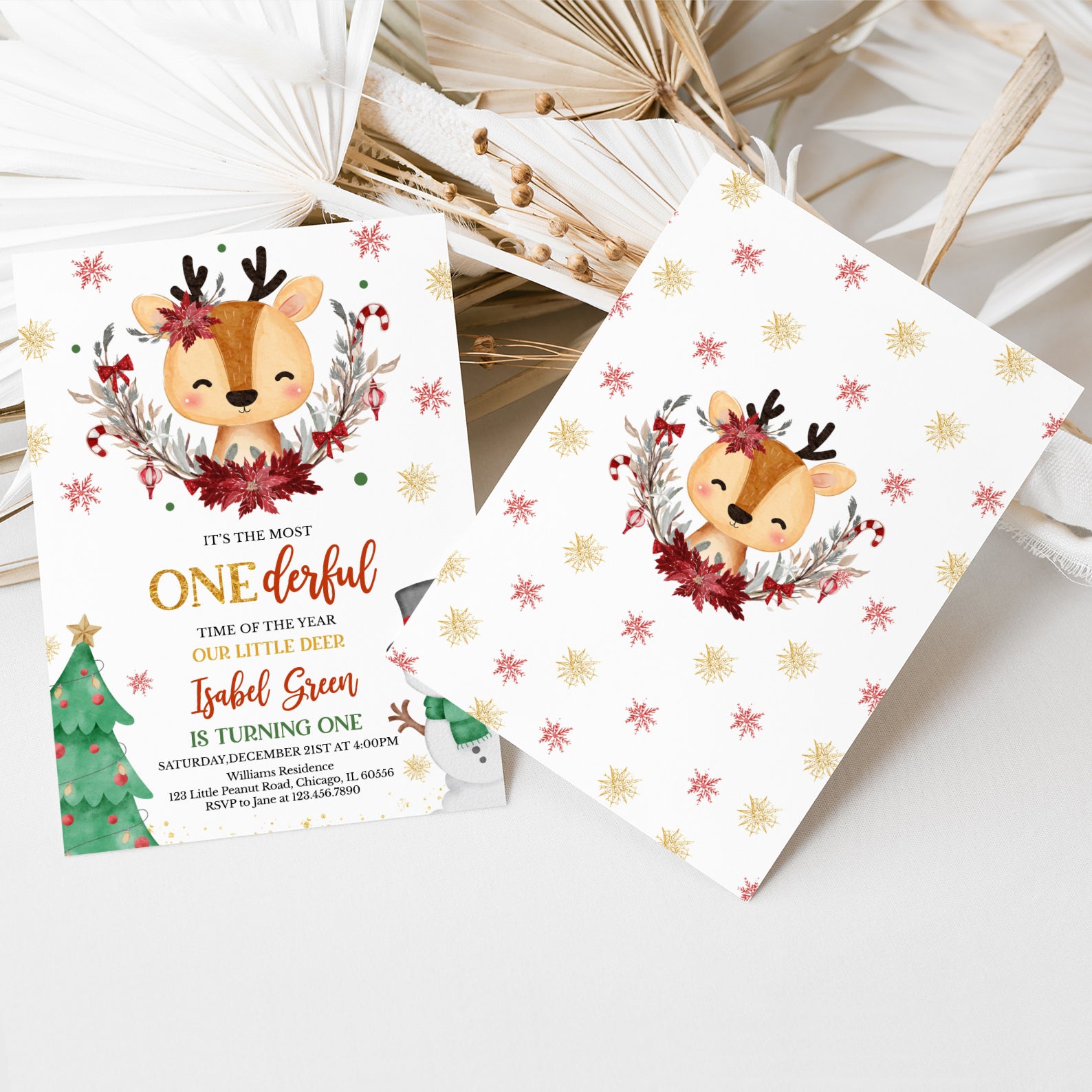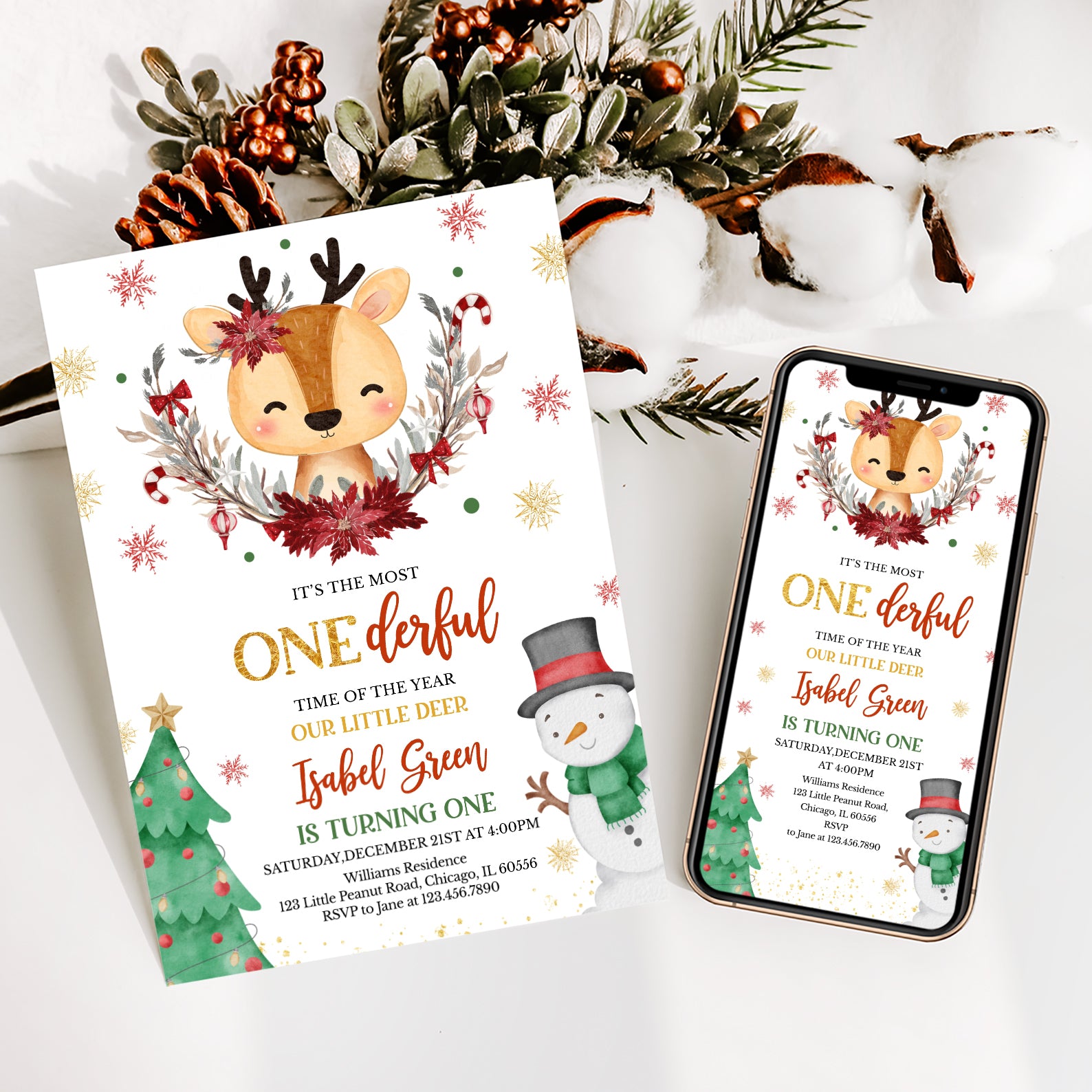 Celebrate your little one's first birthday in style with our enchanting Winter Birthday Digital Invitation! Featuring an adorable deer at the center, beautifully adorned with a half Christmas wreath and surrounded by whimsical snowflakes, this invitation captures the magic of the season. The charming design includes a festive Christmas tree on the bottom left and a cheerful snowman in a black hat and green scarf on the bottom right, making it the perfect way to invite friends and family to your winter wonderland celebration. Make your child's special day unforgettable with this delightful invitation!