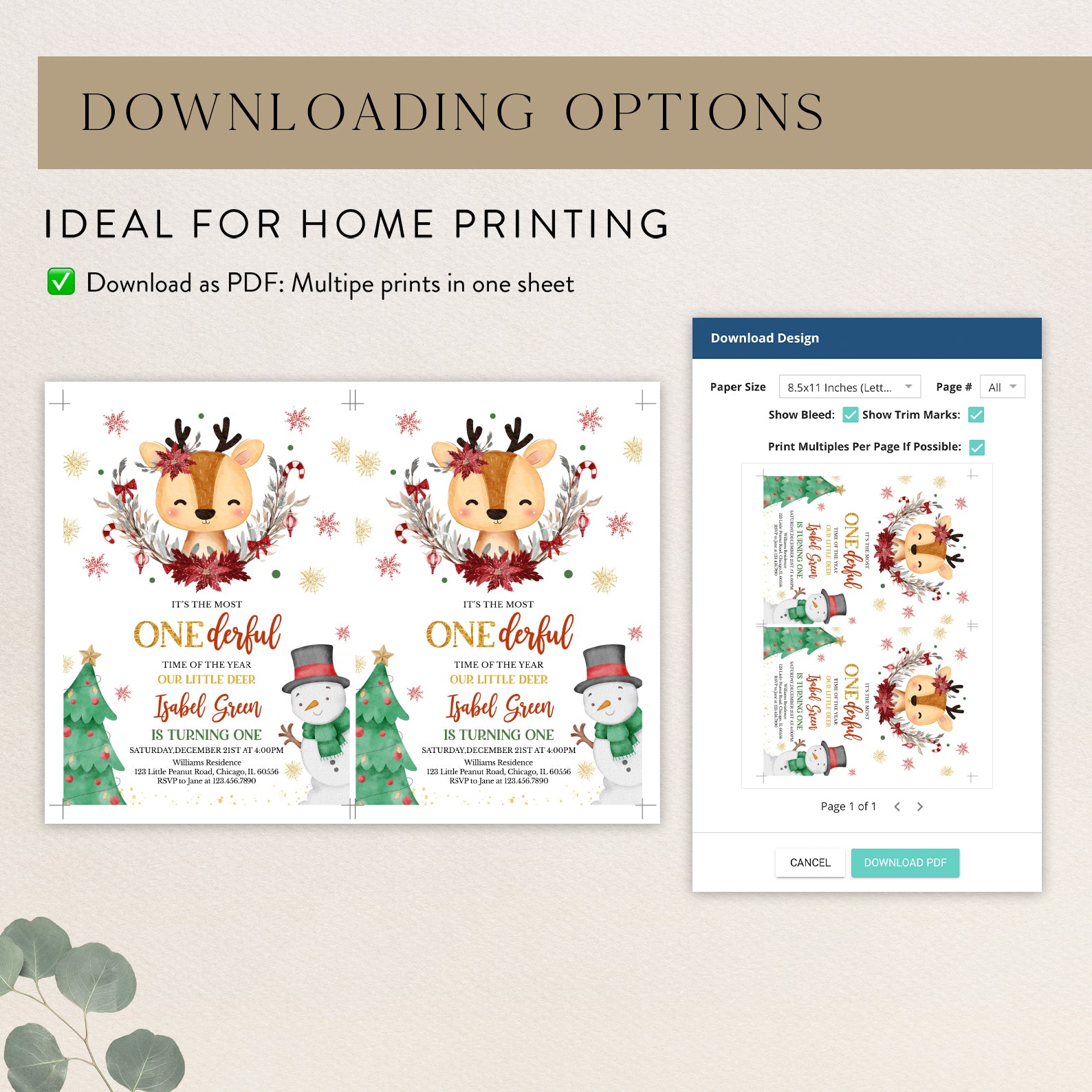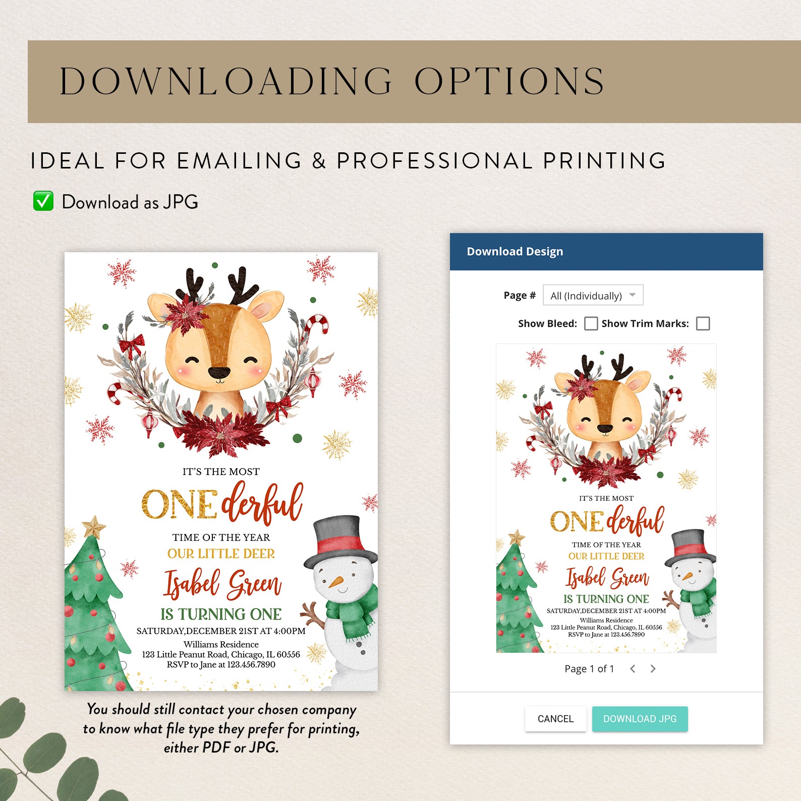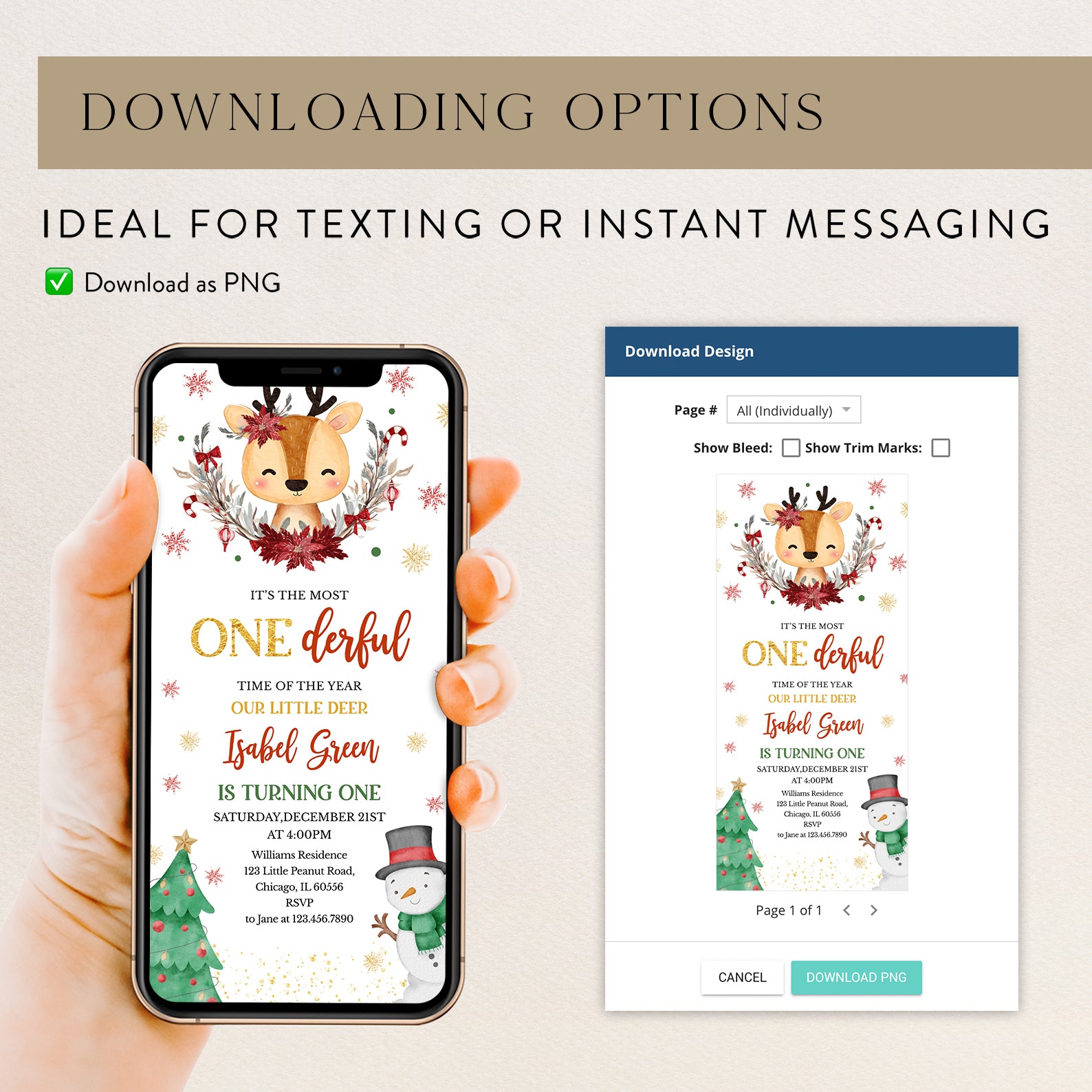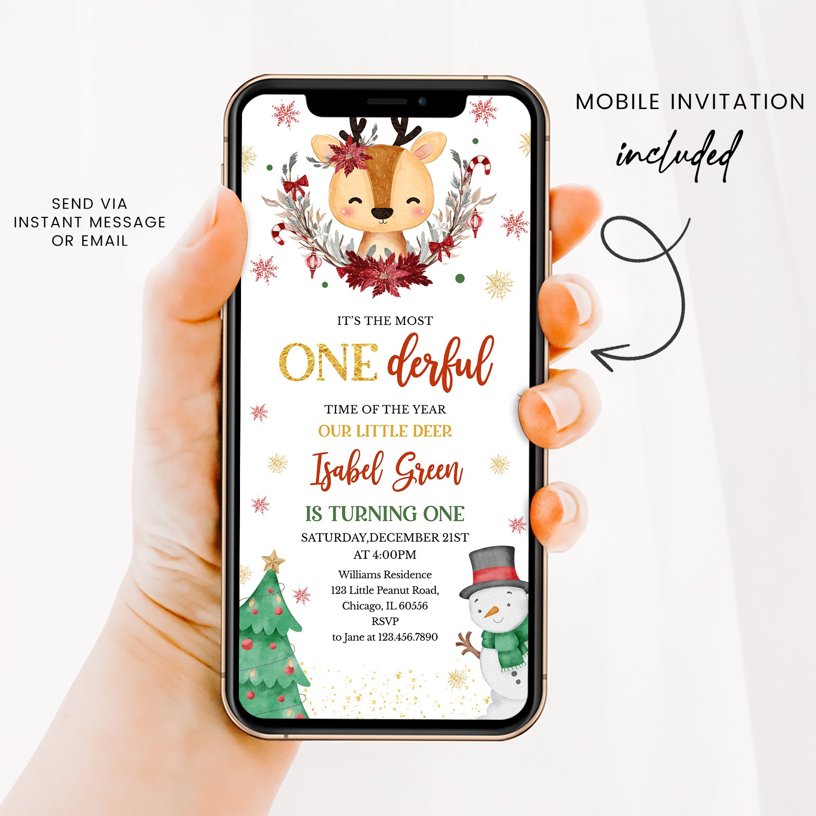 Celebrate your little one's first birthday in style with our enchanting Winter Birthday Digital Invitation! Featuring an adorable deer at the center, beautifully adorned with a half Christmas wreath and surrounded by whimsical snowflakes, this invitation captures the magic of the season. The charming design includes a festive Christmas tree on the bottom left and a cheerful snowman in a black hat and green scarf on the bottom right, making it the perfect way to invite friends and family to your winter wonderland celebration. Make your child's special day unforgettable with this delightful invitation!