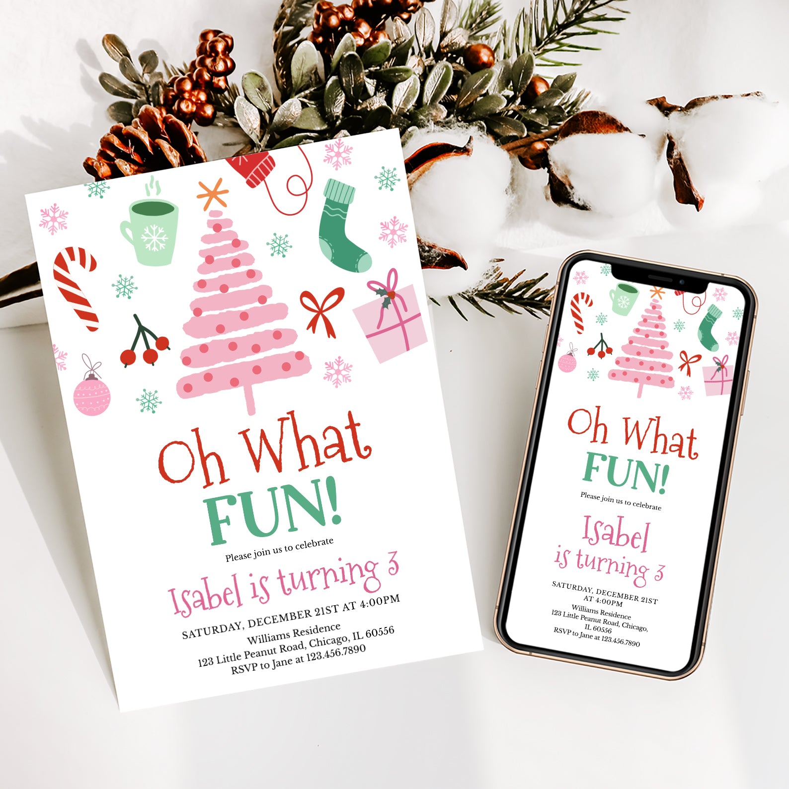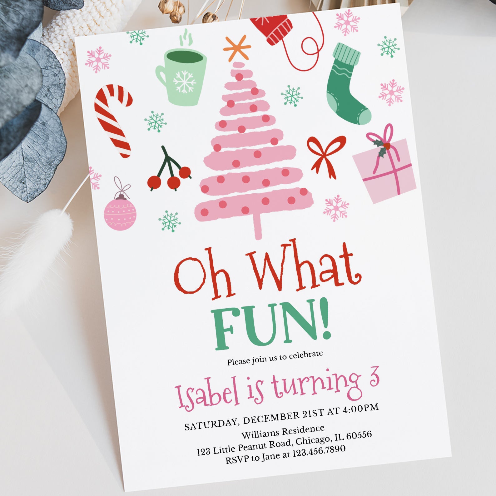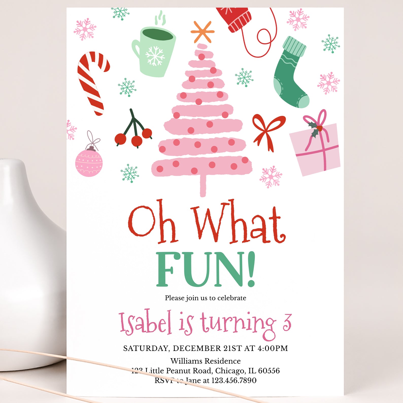 - Purchase this Winter 3rd Birthday Invite: Pink Christmas Tree & Snowflakes template