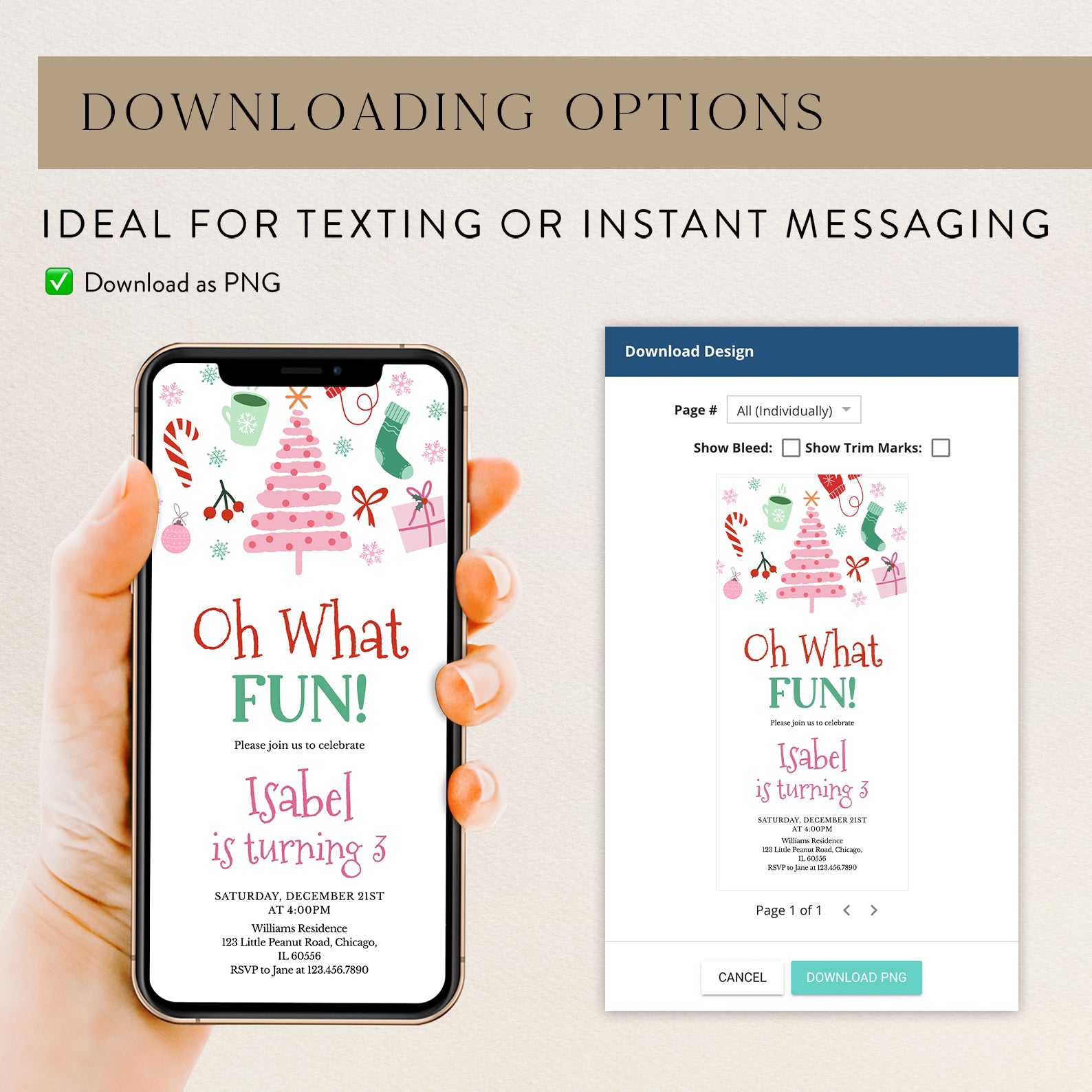 Celebrate your little one's 3rd birthday in style with our enchanting winter birthday digital invitation! Featuring a delightful pink Christmas tree adorned with sparkling snowflakes, festive Christmas balls, and whimsical candy canes, this invitation sets the perfect tone for a magical celebration. Accented with charming ribbons, gifts, cozy socks, and a cheerful mug, it captures the joy of the season while inviting friends and family to join in the fun. Make your child's special day unforgettable with this beautifully designed invitation that combines the warmth of winter festivities with birthday cheer!