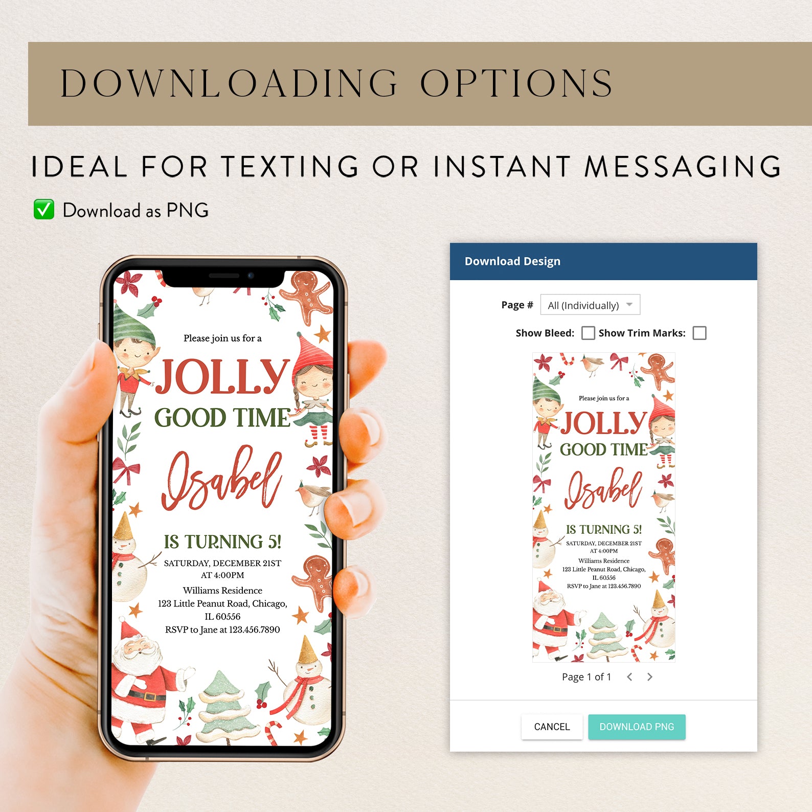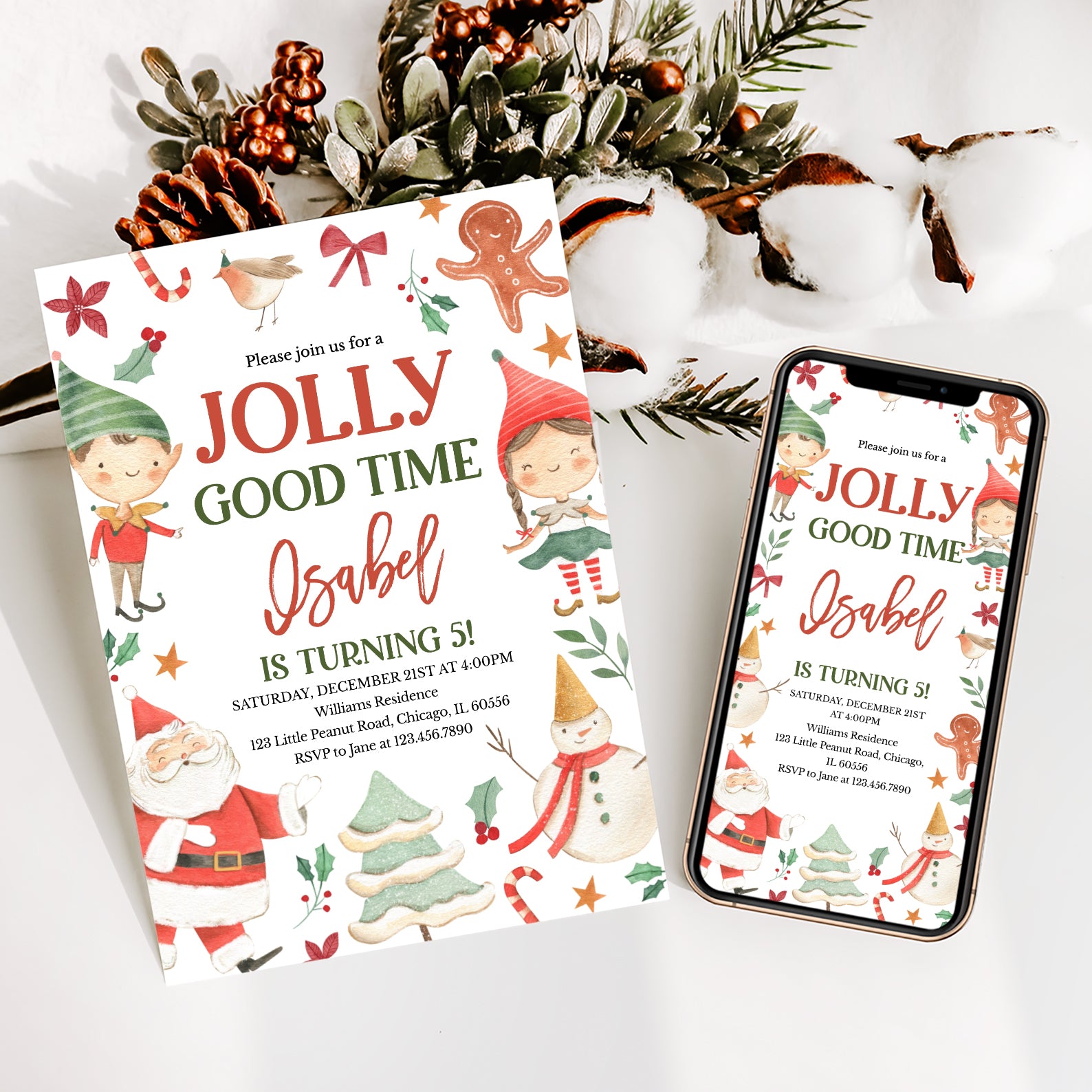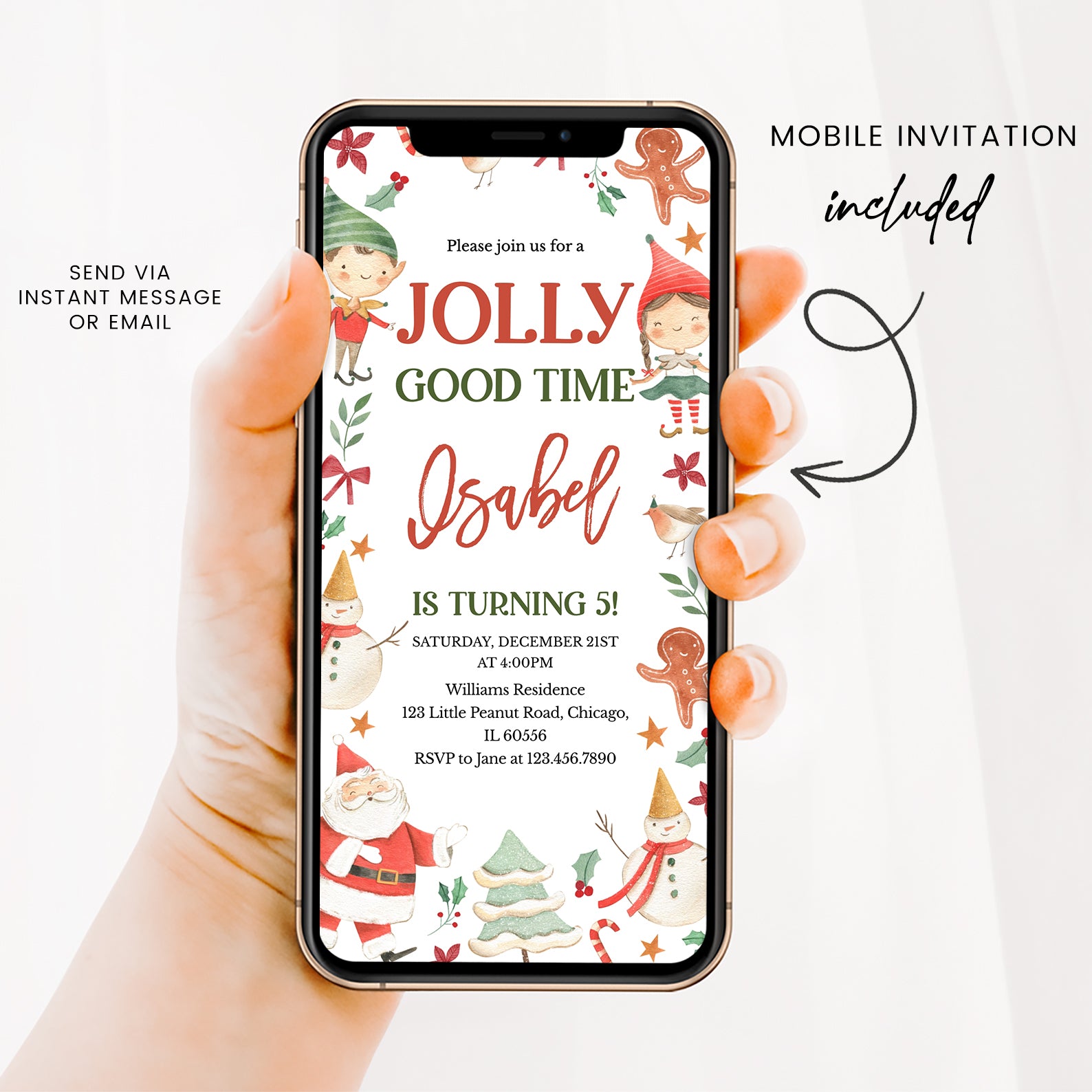 Celebrate your little one's 5th birthday with our enchanting Winter Birthday Digital Invitation! Featuring a delightful red and green theme, this invitation showcases adorable elves, Santa, a festive Christmas tree, and a cheerful snowman donning a party hat and scarf. Accented with candy canes, ribbons, Christmas leaves, and a charming gingerbread man, it sets the perfect tone for a jolly good time. Easy to customize and send, this invitation will have your guests excited to join in the holiday festivities!