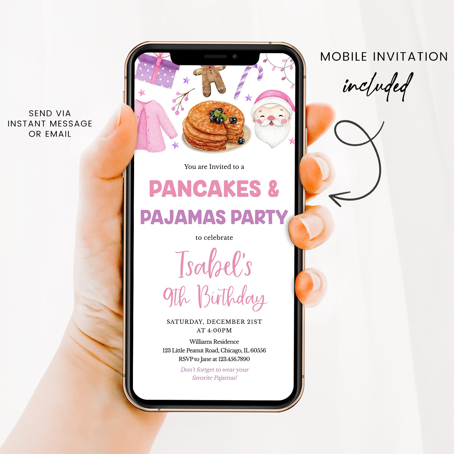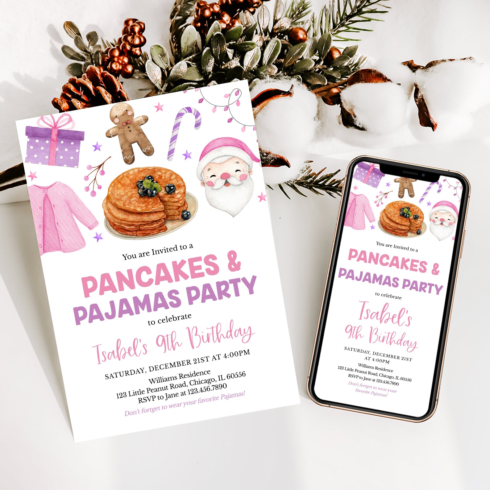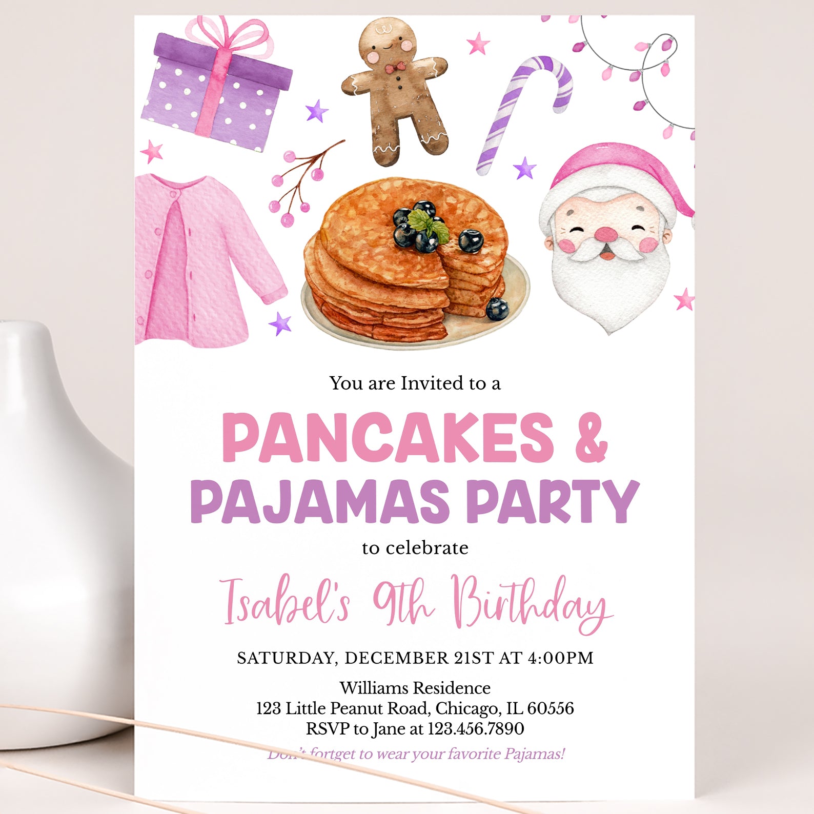 Celebrate your little one's 9th birthday in style with our delightful Winter Birthday Digital Invitation! Featuring a charming pancake centerpiece, this pink and purple themed invite is adorned with a whimsical pink Santa, twinkling Christmas lights, and festive elements like a purple candy cane, a cheerful gingerbread man, and a cozy pink cardigan. Perfect for a cozy pancakes and pajamas party, this invitation sets the tone for a magical celebration filled with joy and laughter. Make their special day unforgettable with this enchanting design that captures the spirit of winter festivities!