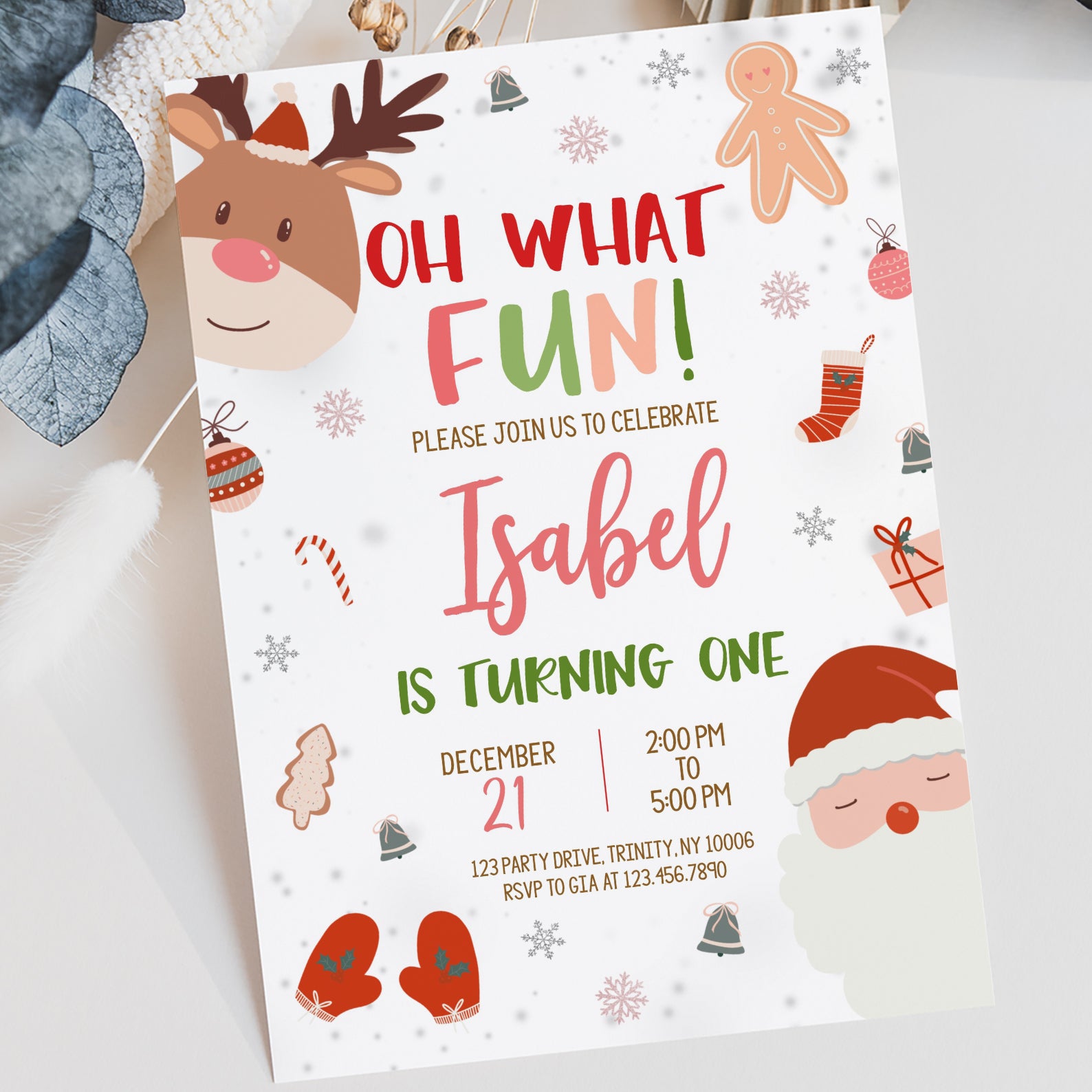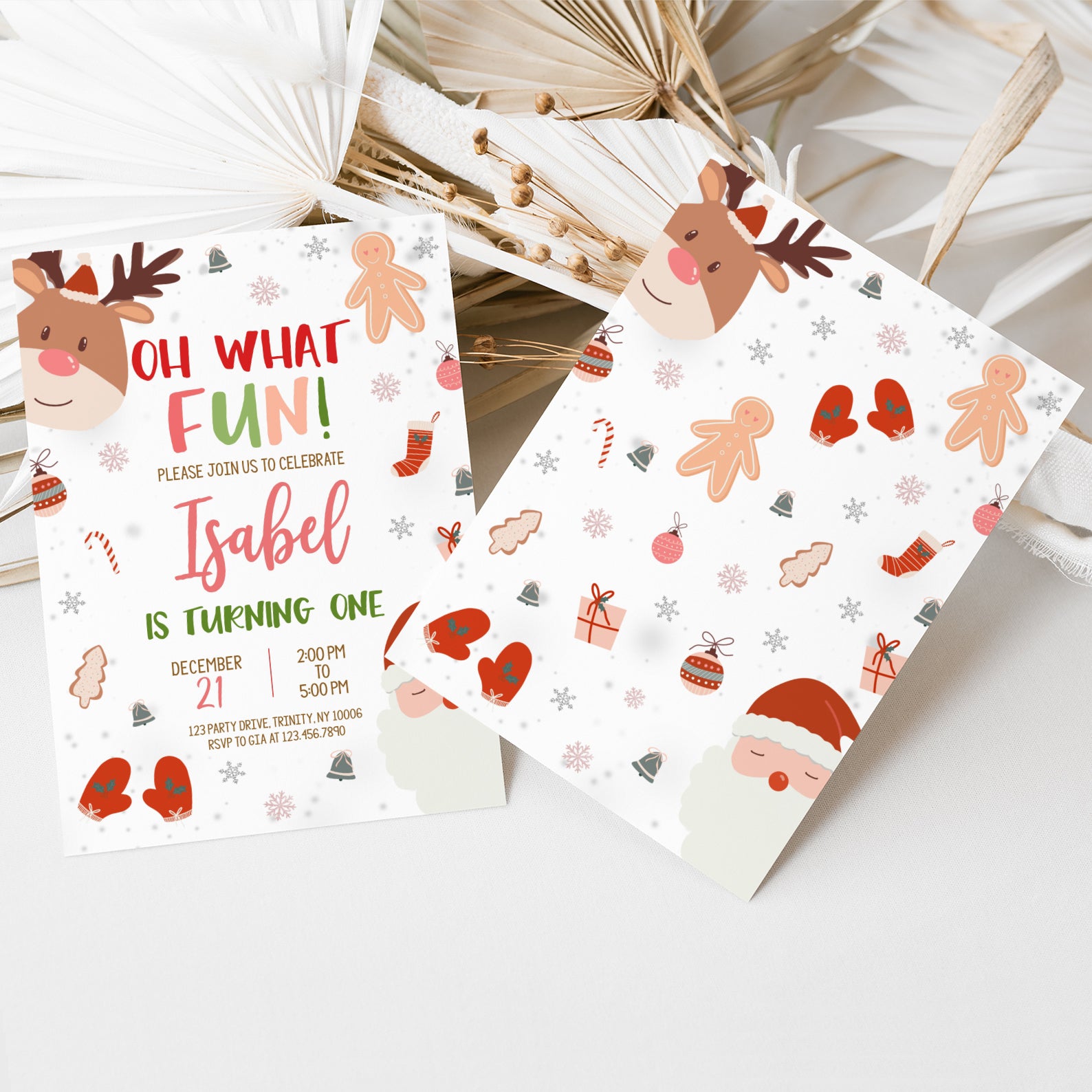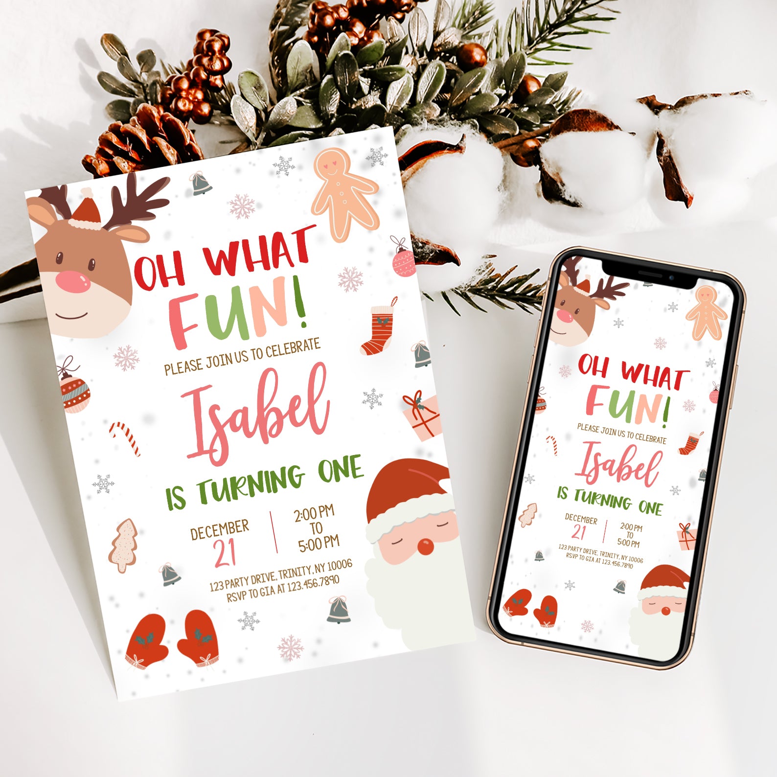 Celebrate your little one's first birthday in style with our enchanting Winter Birthday Digital Invitation! Adorned with whimsical snowflakes, festive Christmas ball, and delightful gingerbread man, this invitation captures the magic of the season. Featuring a charming reindeer at the top left and jolly Santa at the bottom right, it's the perfect way to set the tone for a fun-filled celebration. Easy to customize and share, this digital invite ensures your guests will be excited to join in the winter wonderland festivities!