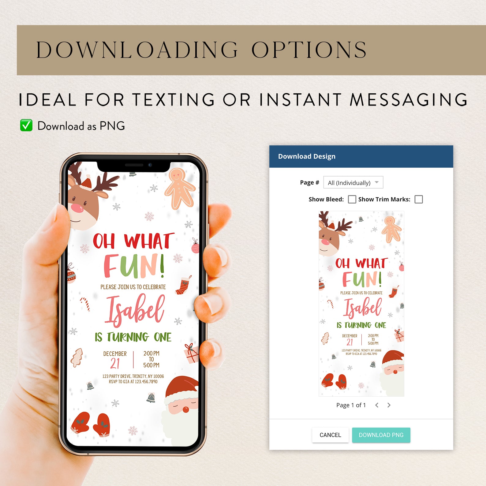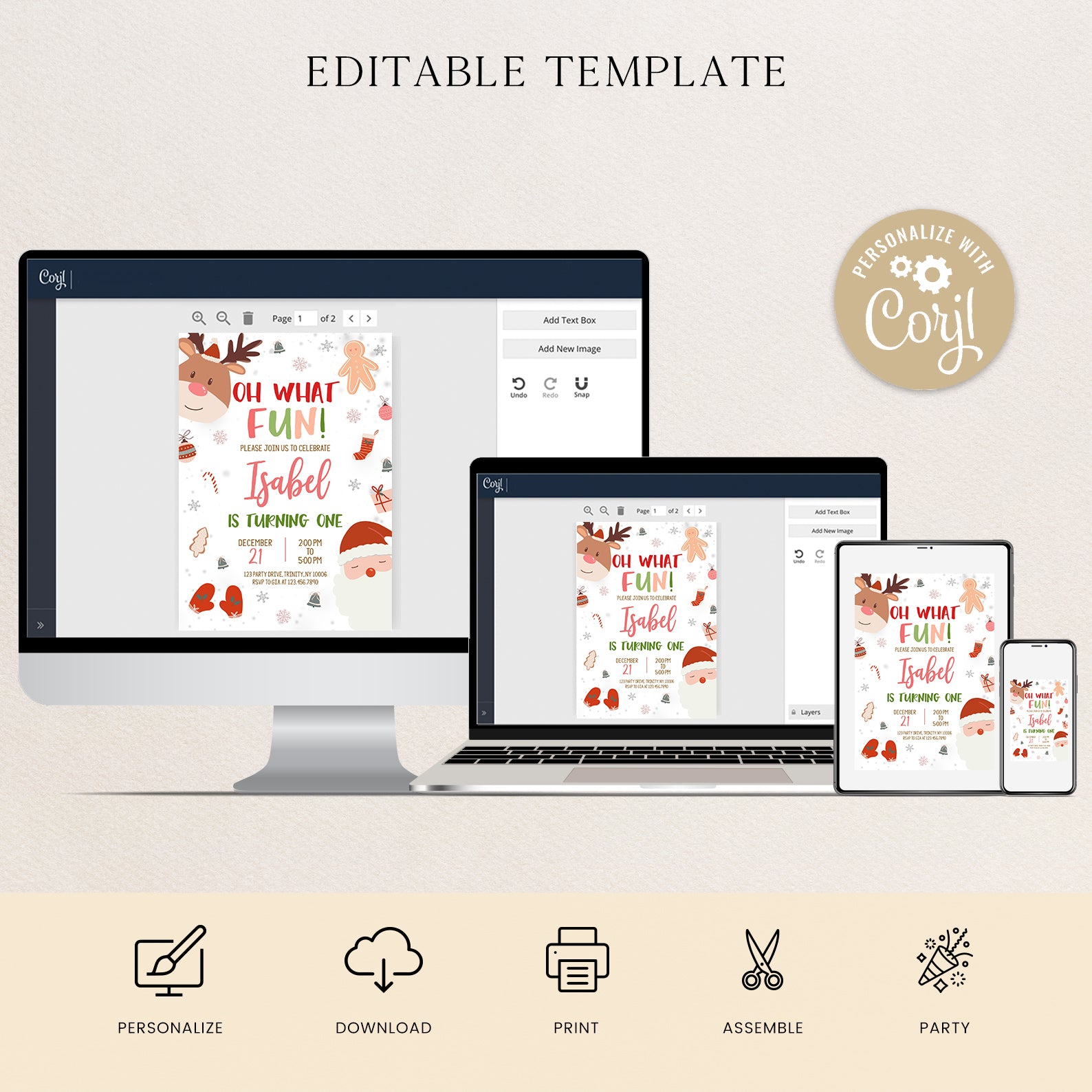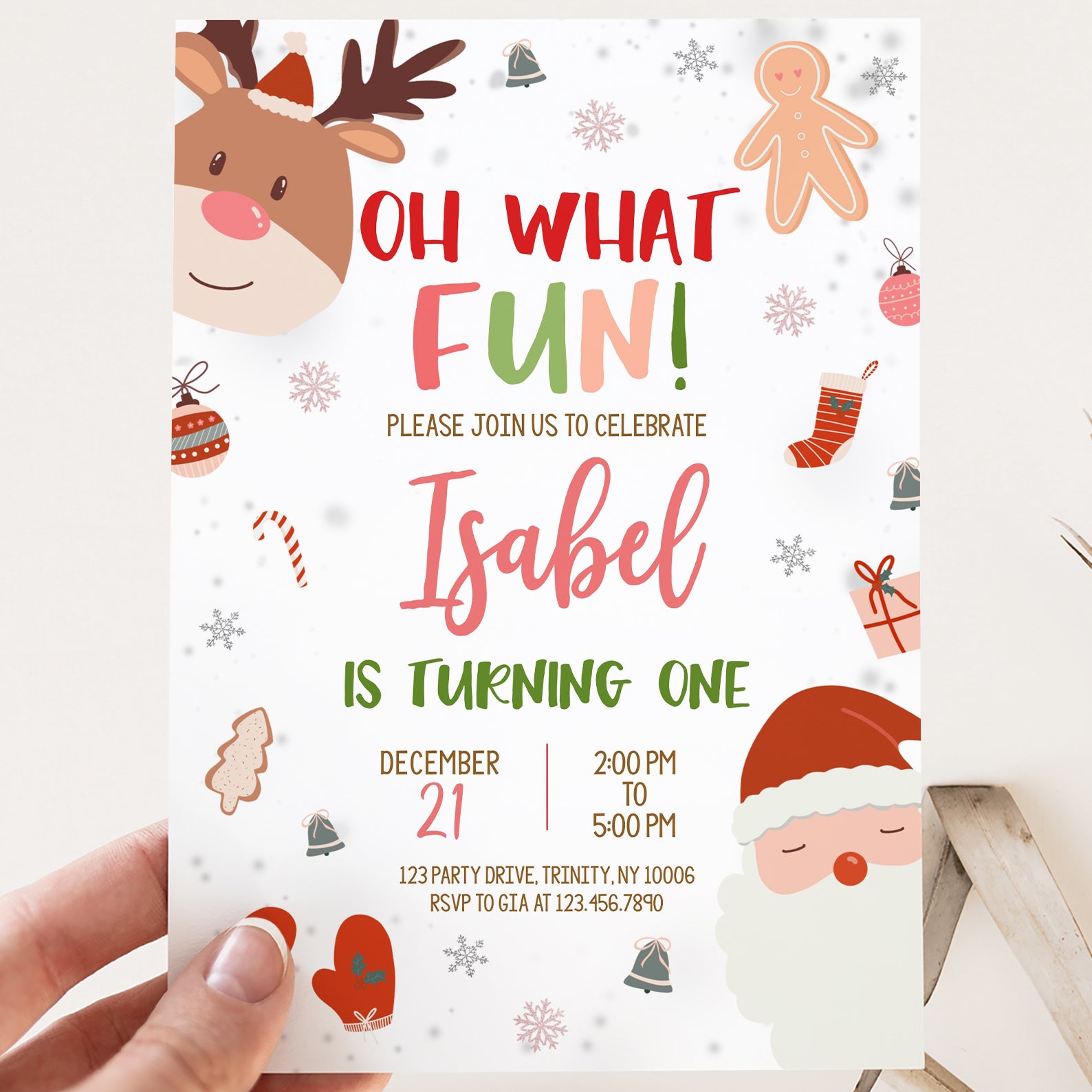 Celebrate your little one's first birthday in style with our enchanting Winter Birthday Digital Invitation! Adorned with whimsical snowflakes, festive Christmas ball, and delightful gingerbread man, this invitation captures the magic of the season. Featuring a charming reindeer at the top left and jolly Santa at the bottom right, it's the perfect way to set the tone for a fun-filled celebration. Easy to customize and share, this digital invite ensures your guests will be excited to join in the winter wonderland festivities!