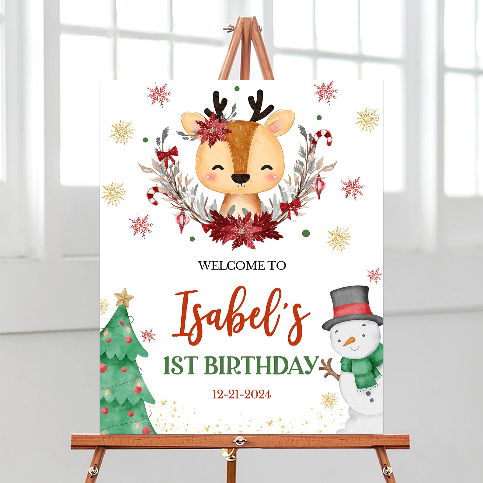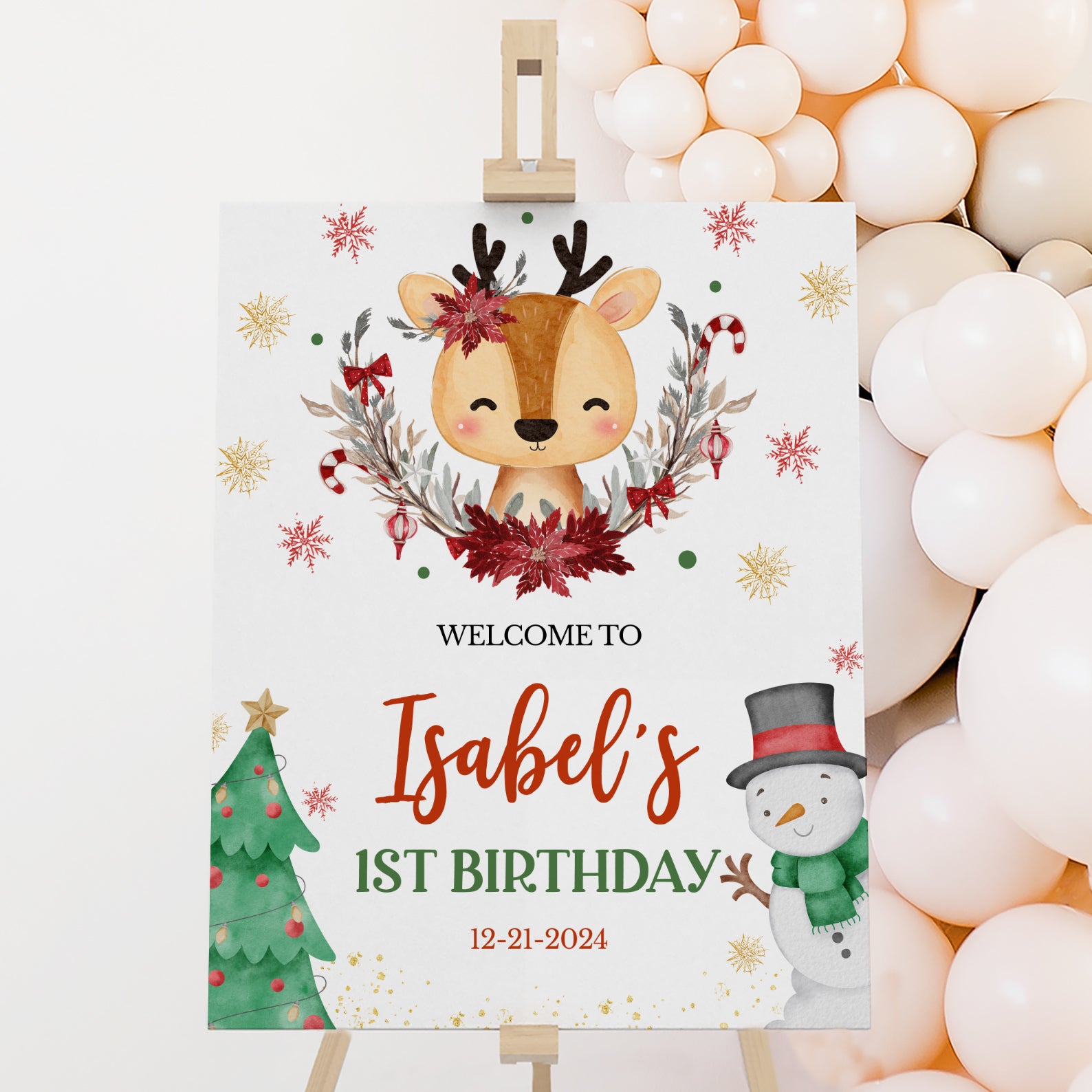 Greet your guests with the charm of the season using our Winter Birthday Digital Welcome Sign! At the center, an adorable deer wears a half Christmas wreath, surrounded by delicate snowflakes for a magical winter touch. A festive Christmas tree decorates the bottom left, while a cheerful snowman in a black hat and green scarf brightens the bottom right. Perfect for setting a warm, whimsical tone for your little one’s first birthday celebration.