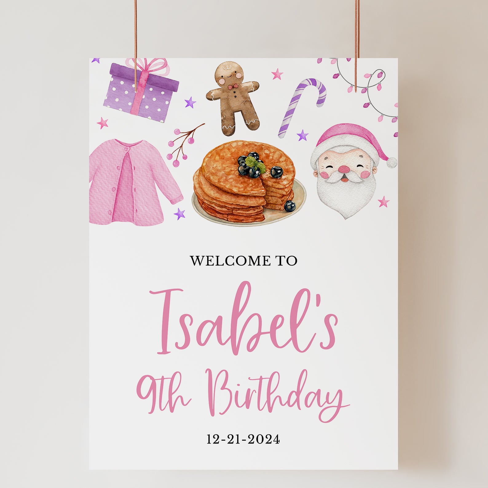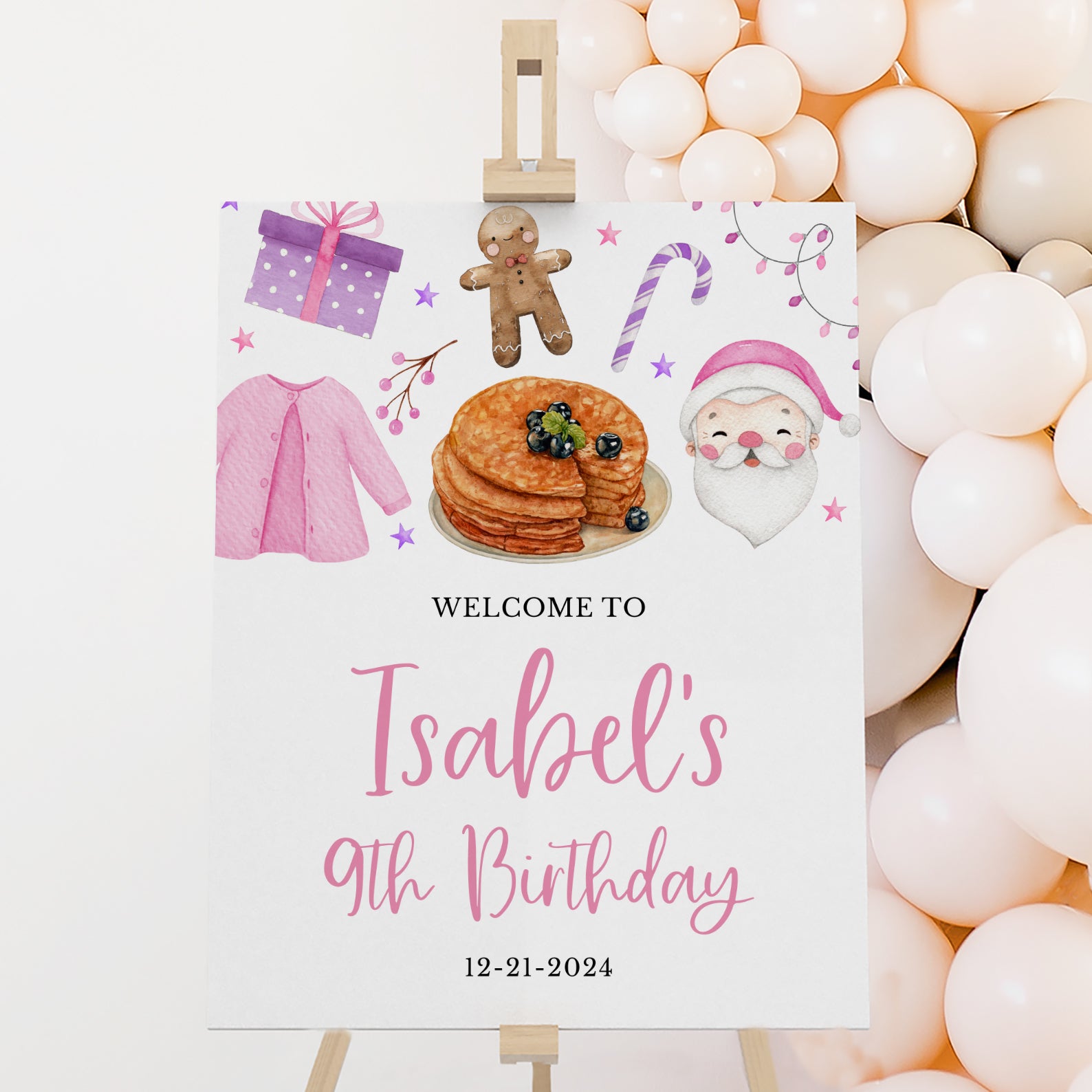 Welcome guests to a magical winter celebration with our charming Winter Birthday Welcome Sign! Featuring a whimsical pancake centerpiece, playful pink Santa, twinkling Christmas lights, and festive touches like a gingerbread man and purple candy cane, this pink and purple themed design sets the perfect cozy tone for a pancakes and pajamas party. Easily customizable, it invites friends and family to join the fun and celebrate your little one’s special 9th birthday in style.